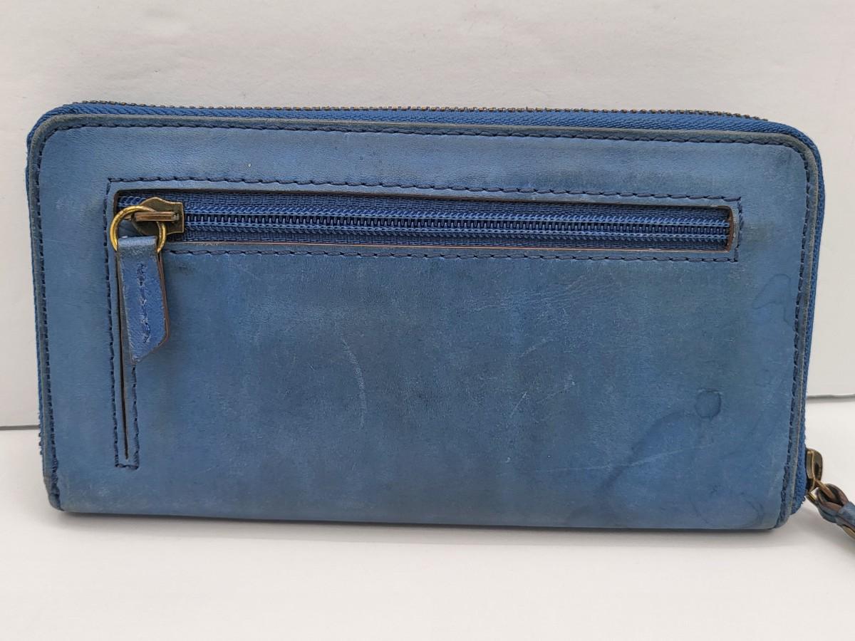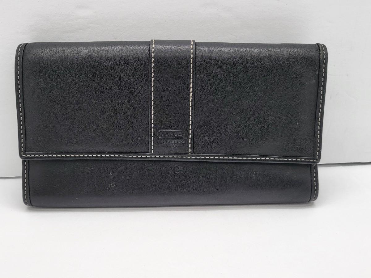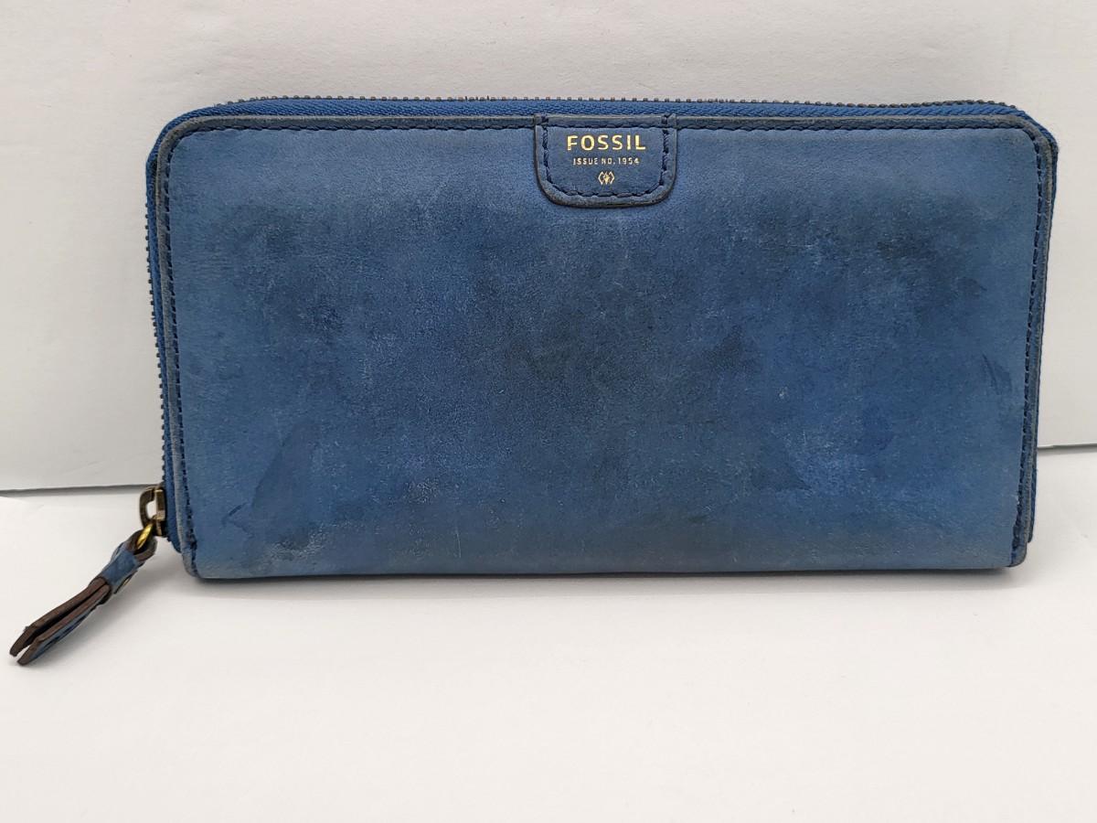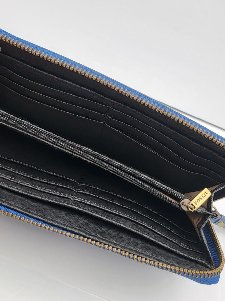 Black leather, trifold, Coach wallet and blue leather zip around Fossil brand wallet, measure 7.5" x 4.5".