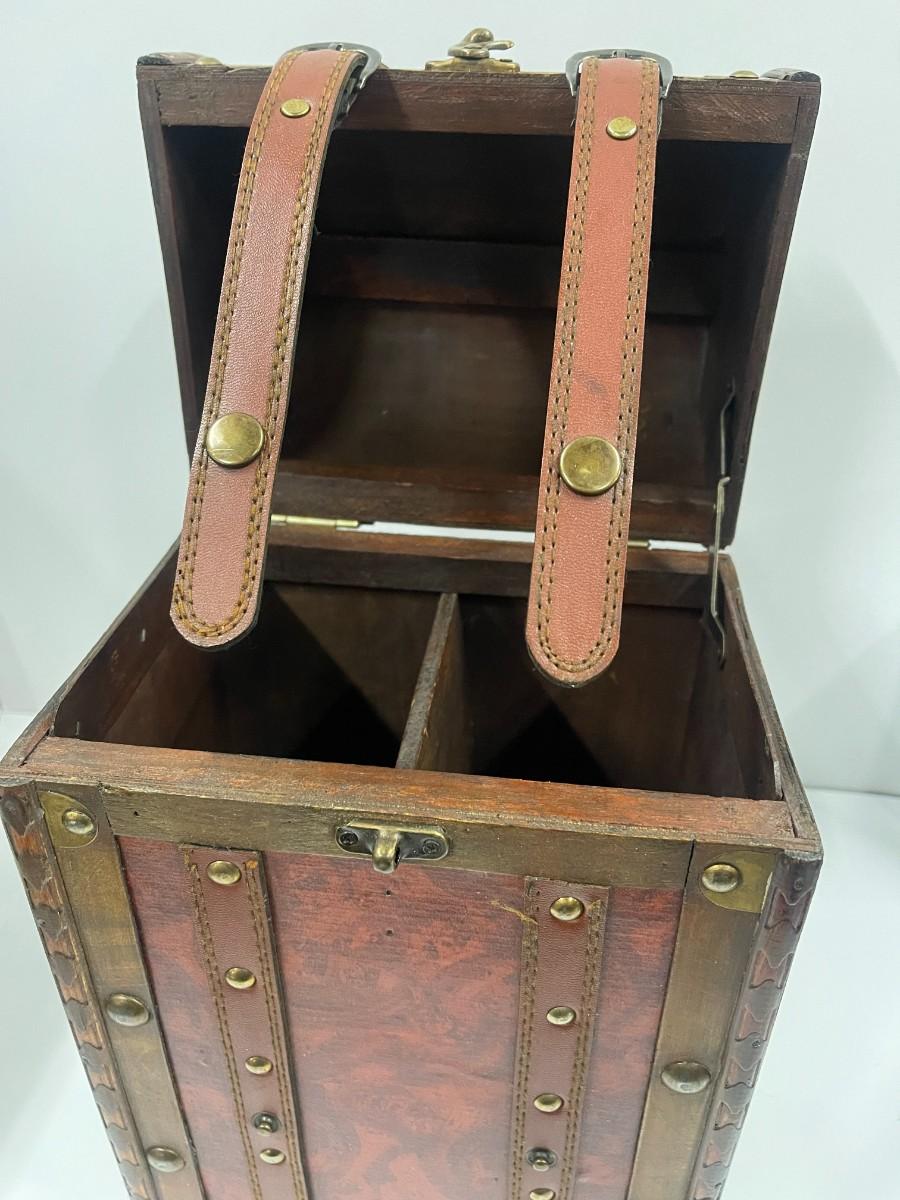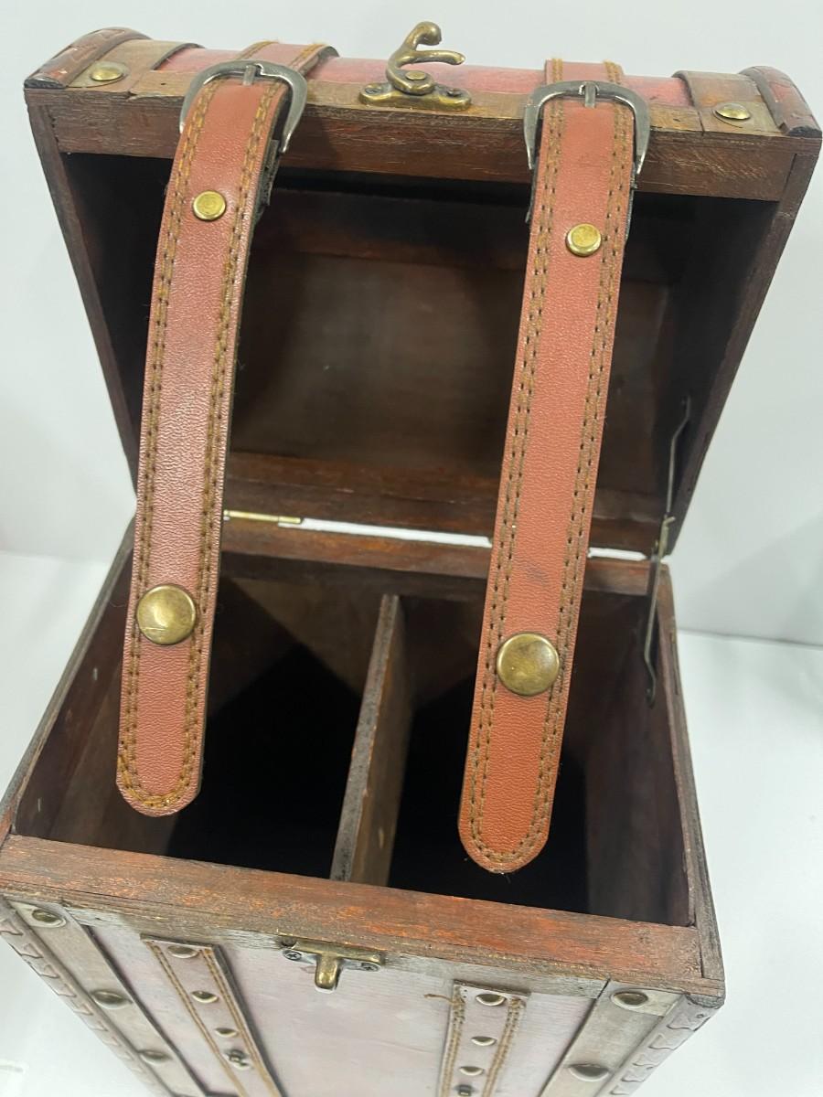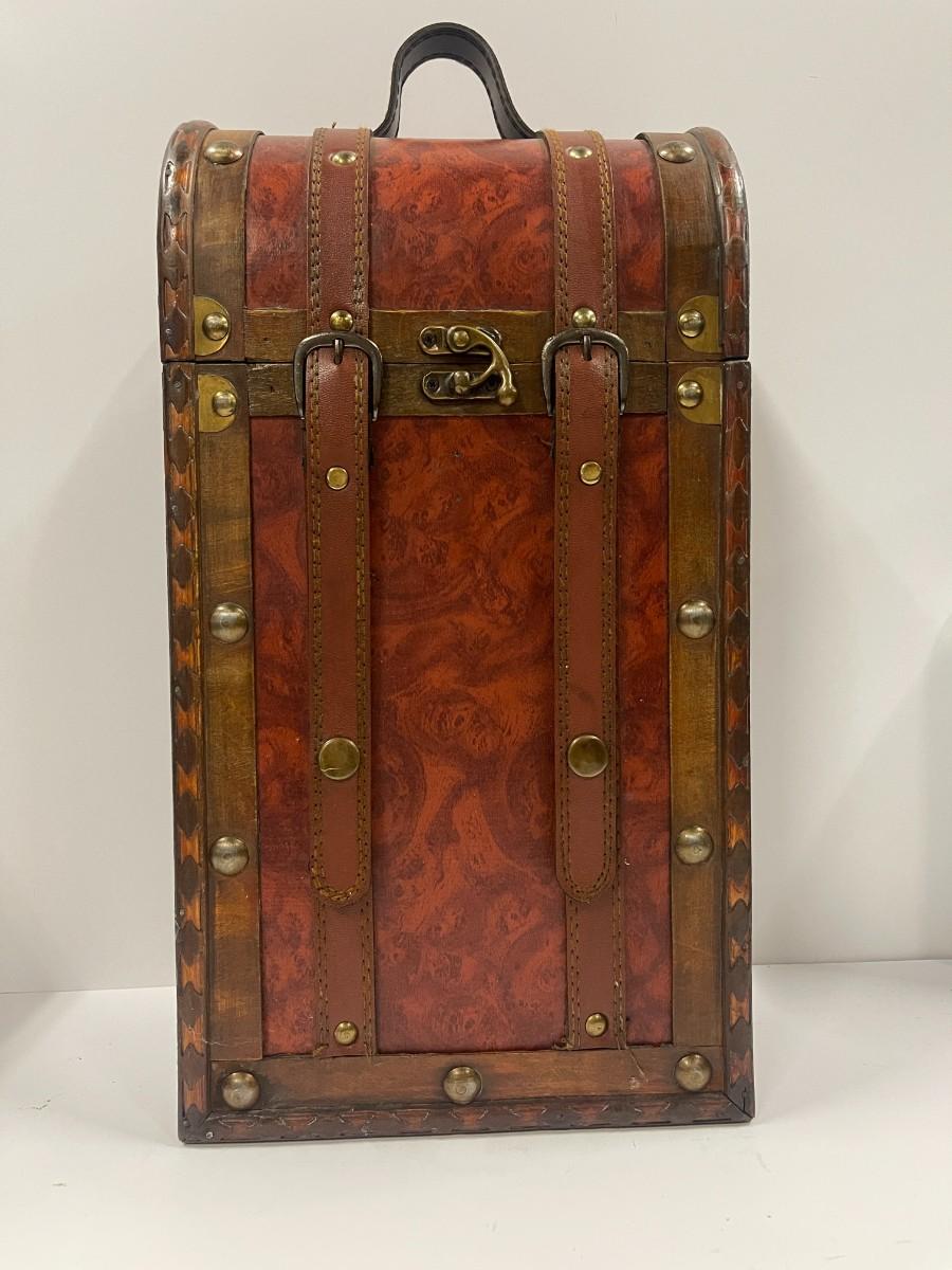 Leather wine storage box for two bottles of wine. 15 1/2" x 8" x 6 1/2". Very good condition showing little to no signs of wear.