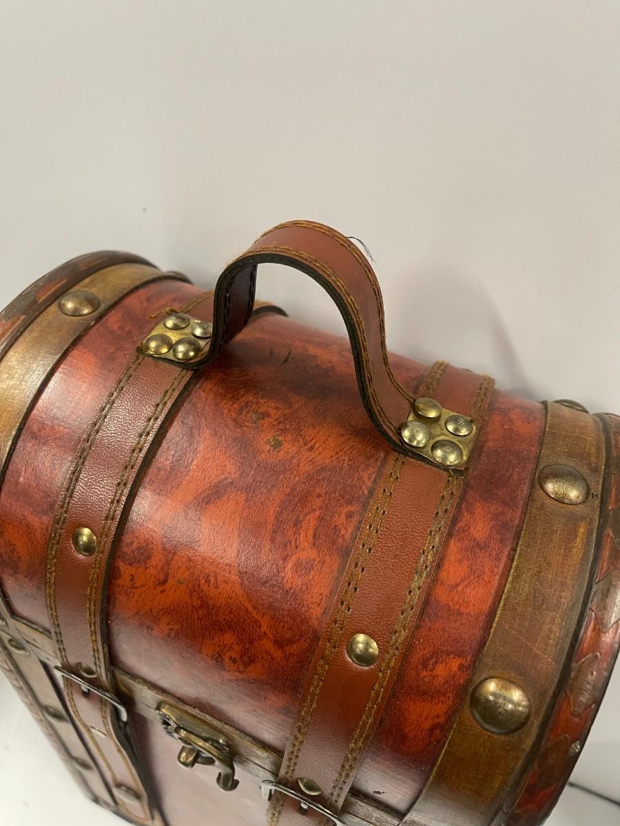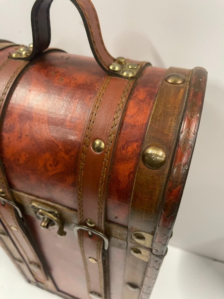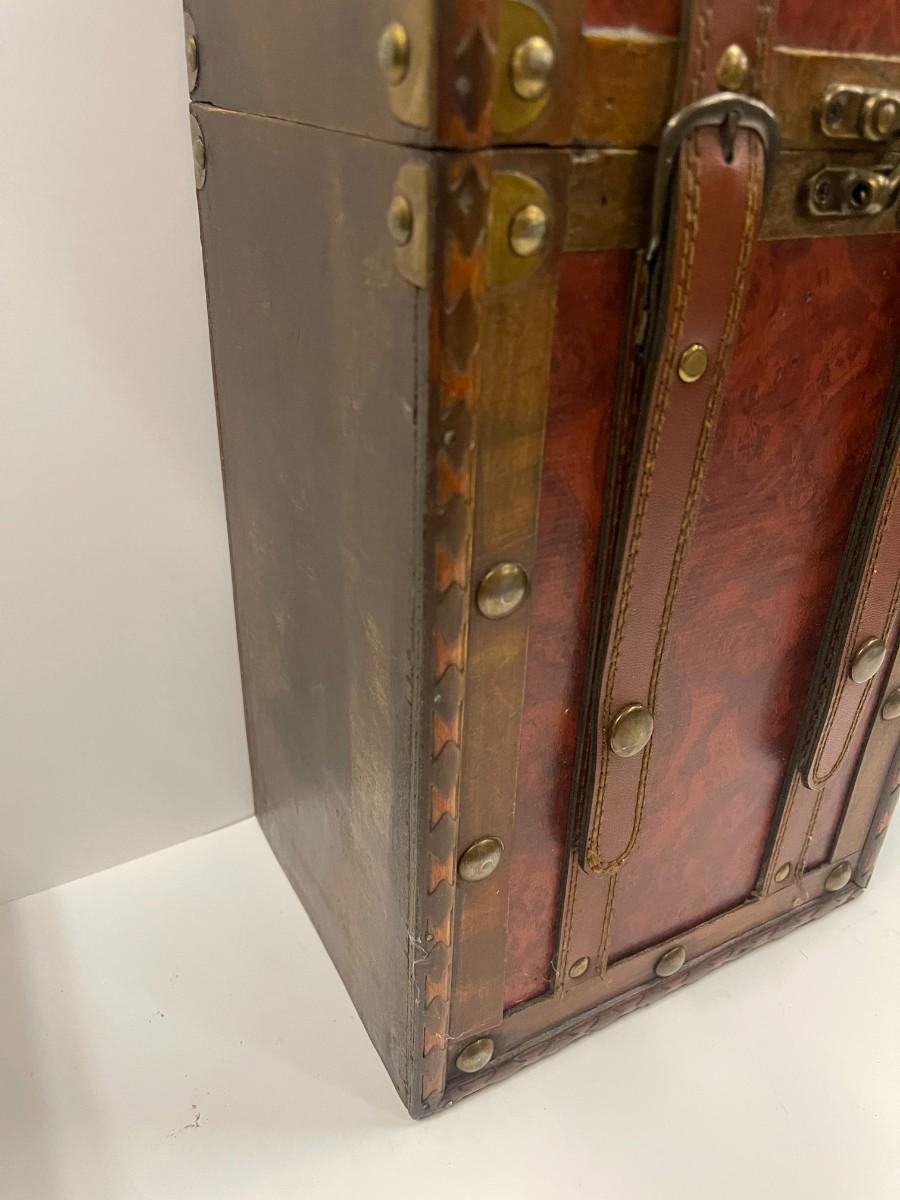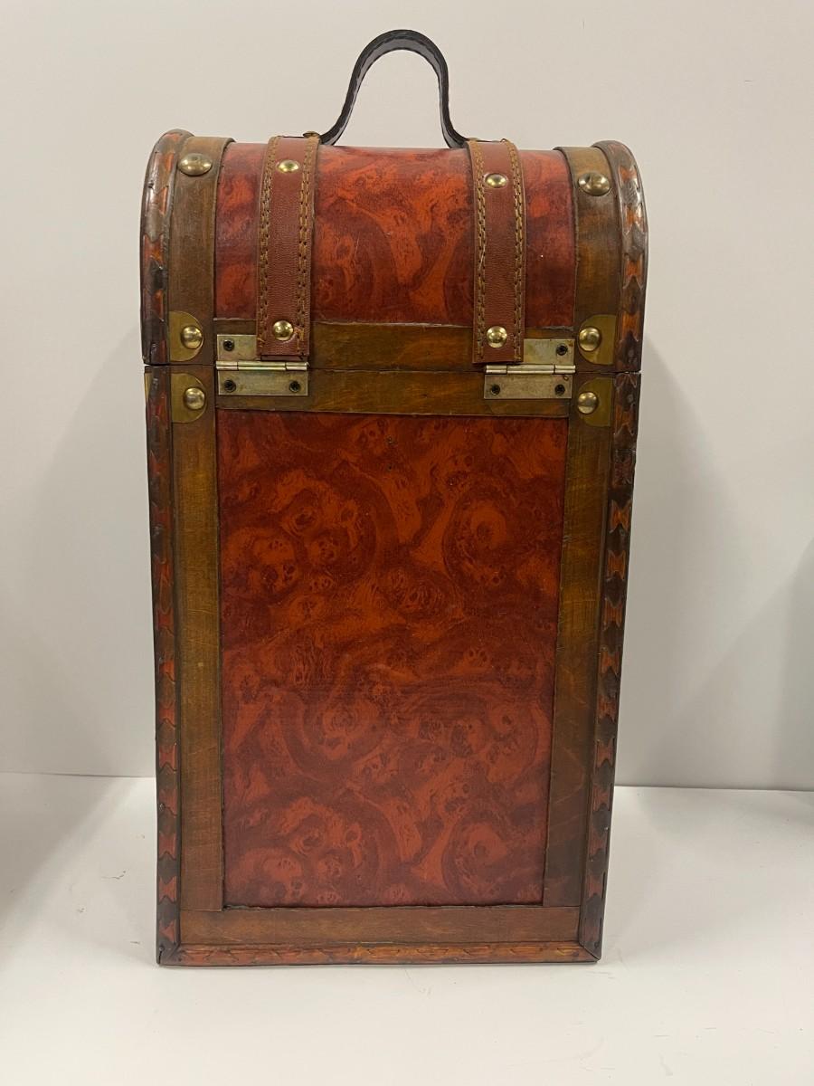 Leather wine storage box for two bottles of wine. 15 1/2" x 8" x 6 1/2". Very good condition showing little to no signs of wear.