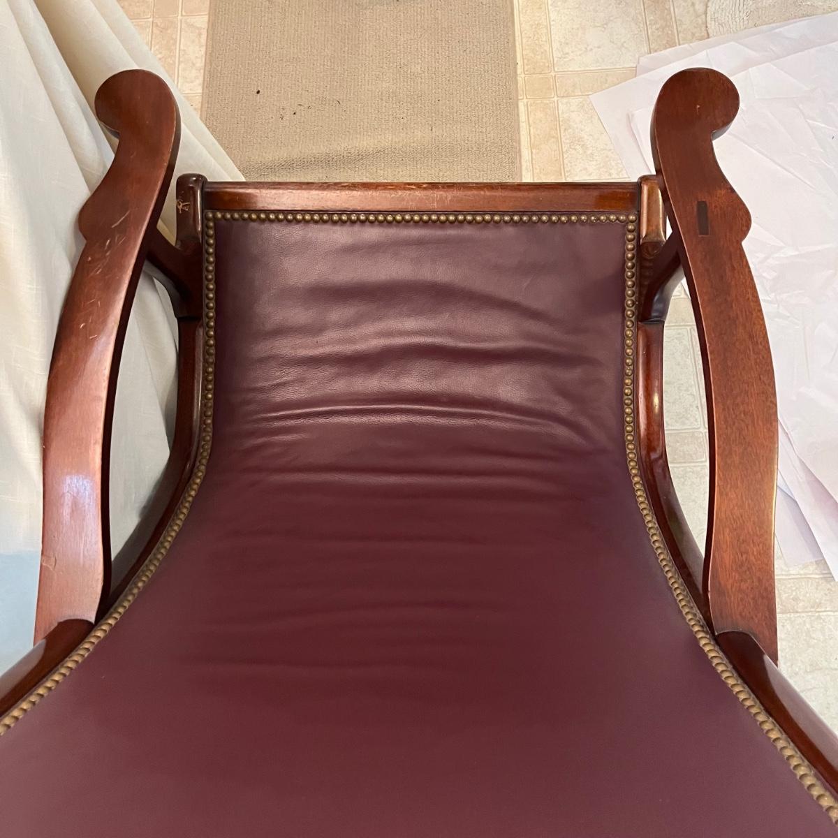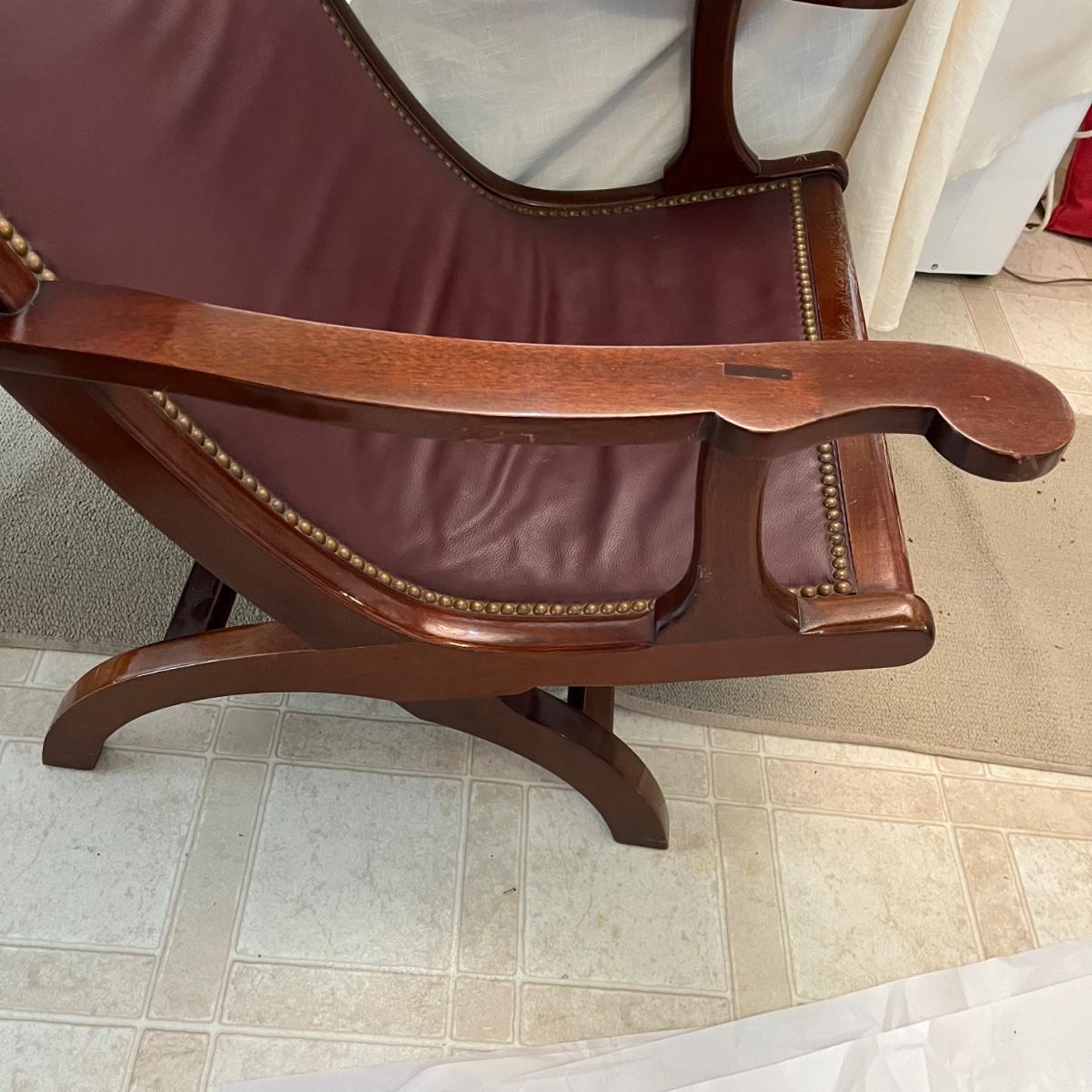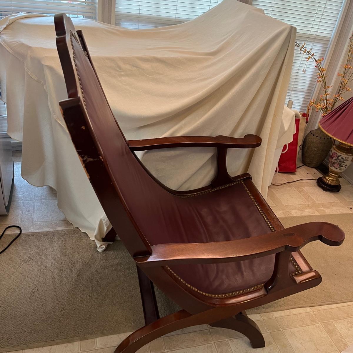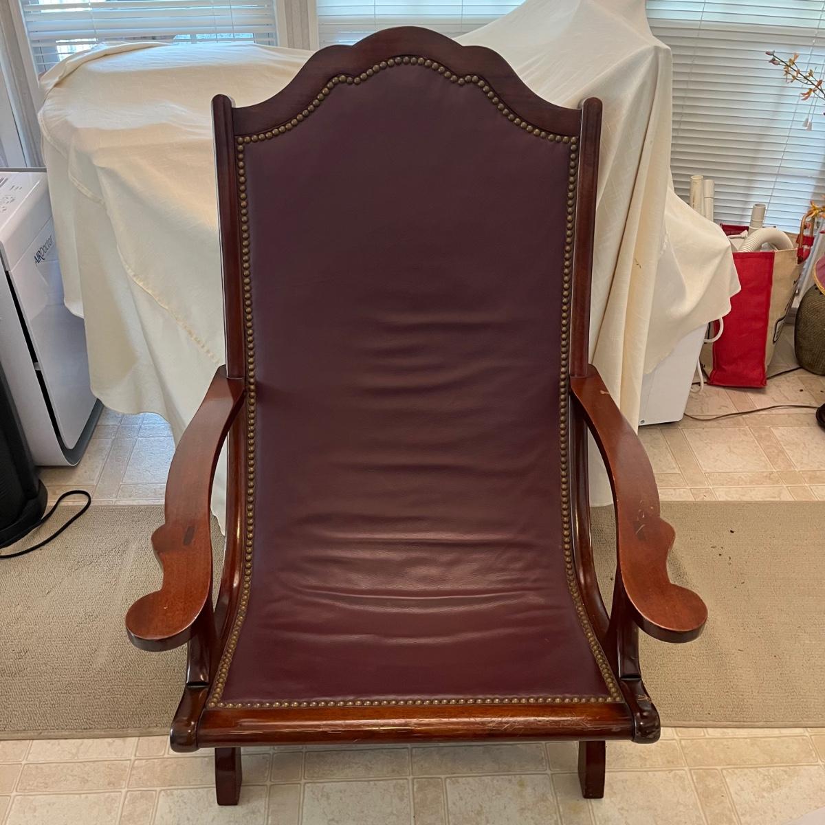 Lot includes a unique Jefferson chair that has a wooden frame with a leather seat and brass tacks trim. Frame has a few scratches and nicks, see pictures. Chair measures 26” x 13” x 39”H with a seat height of 14”.