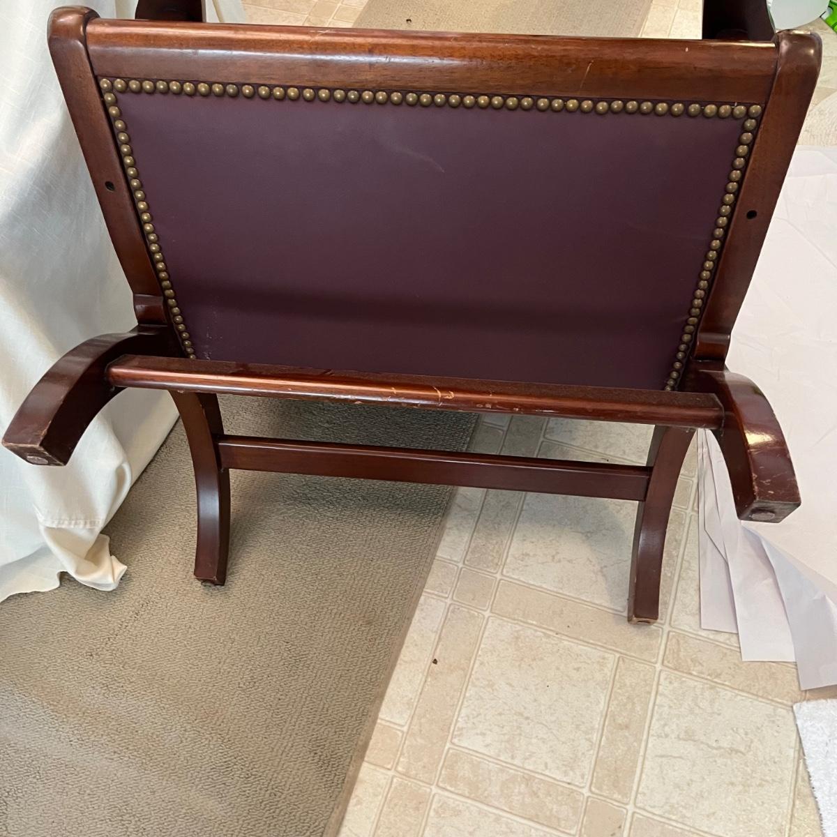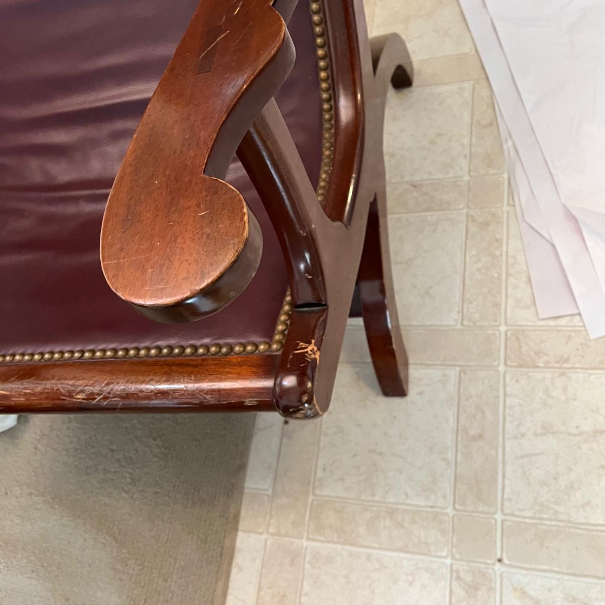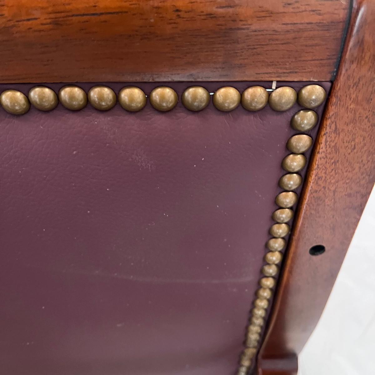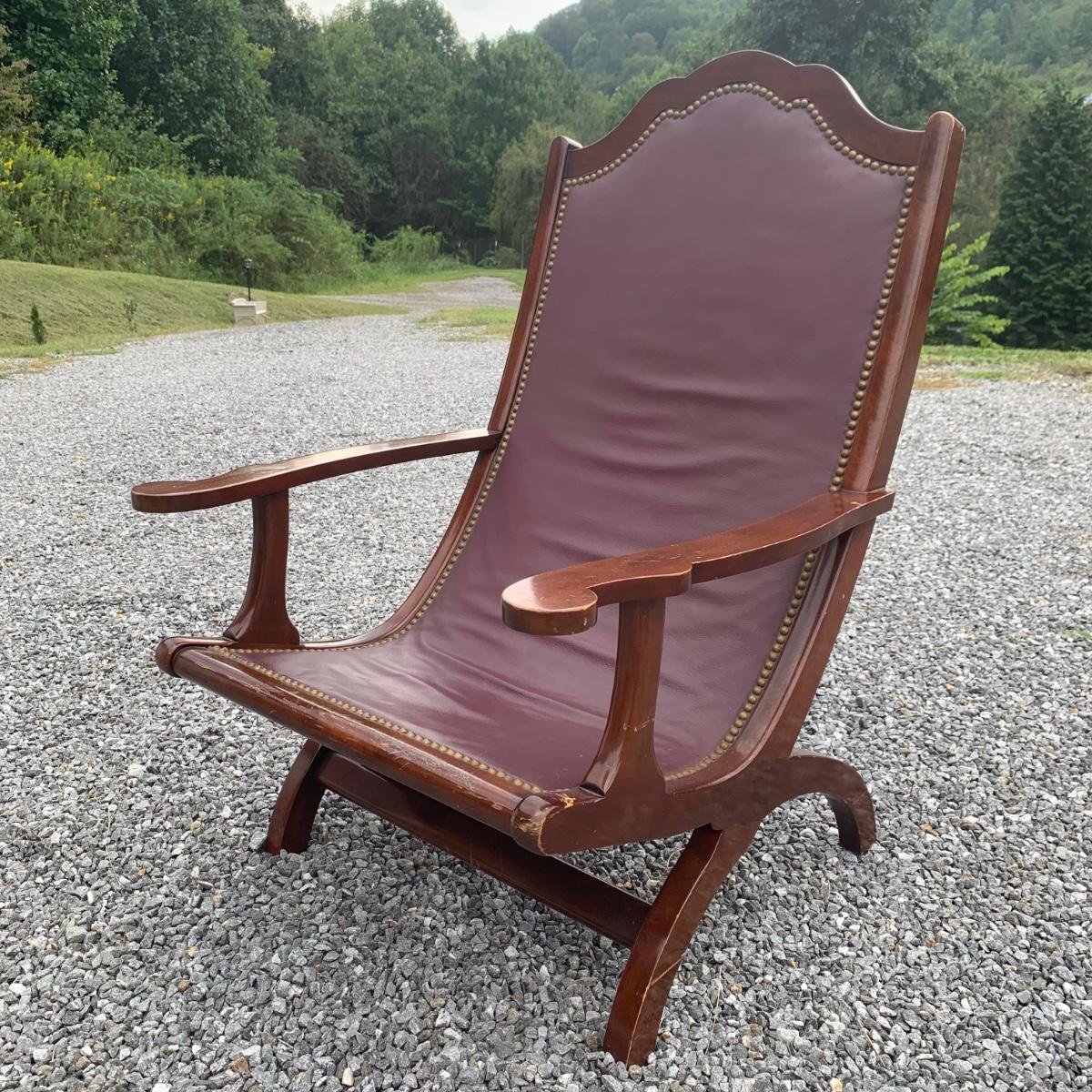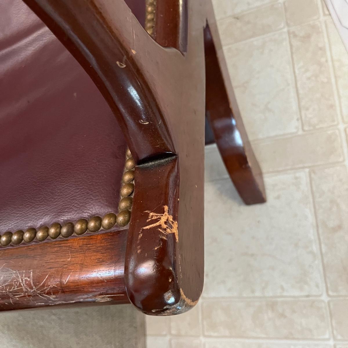 Lot includes a unique Jefferson chair that has a wooden frame with a leather seat and brass tacks trim. Frame has a few scratches and nicks, see pictures. Chair measures 26” x 13” x 39”H with a seat height of 14”.