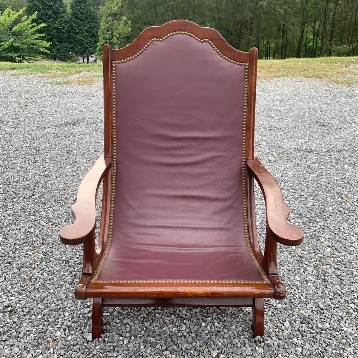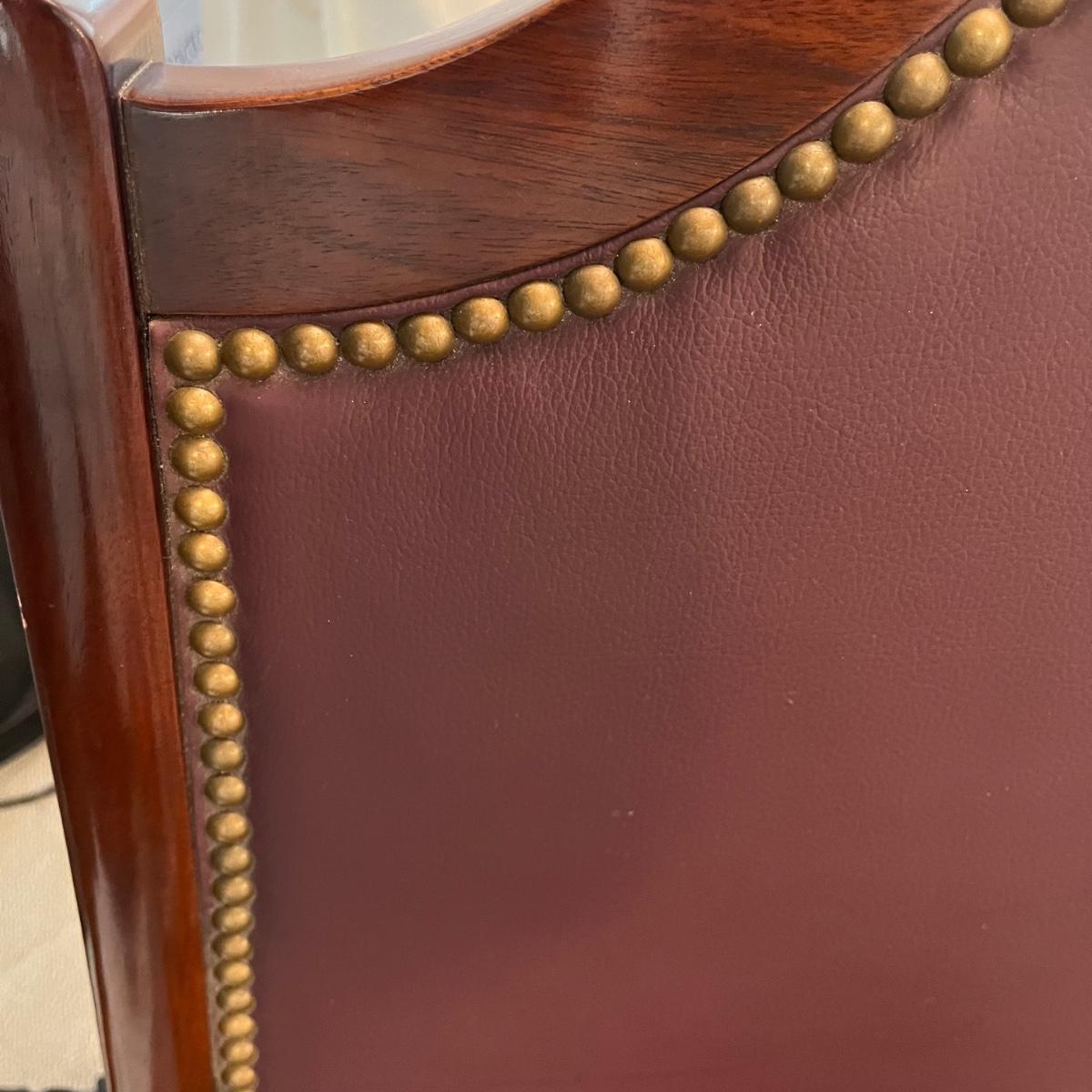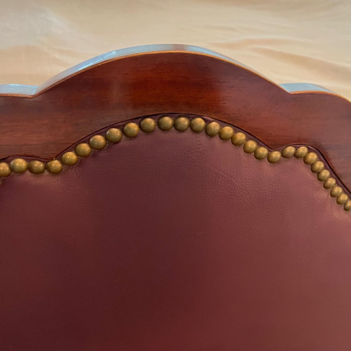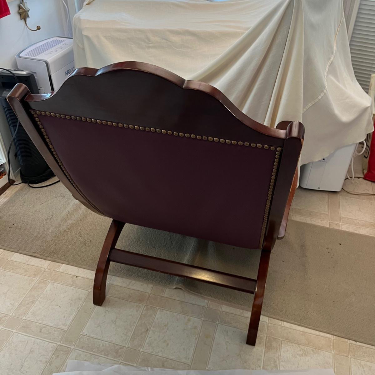 Lot includes a unique Jefferson chair that has a wooden frame with a leather seat and brass tacks trim. Frame has a few scratches and nicks, see pictures. Chair measures 26” x 13” x 39”H with a seat height of 14”.