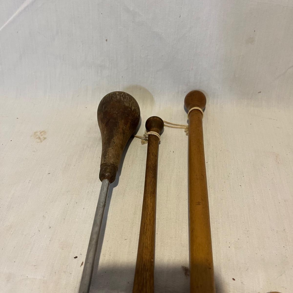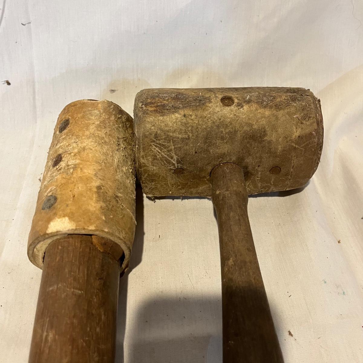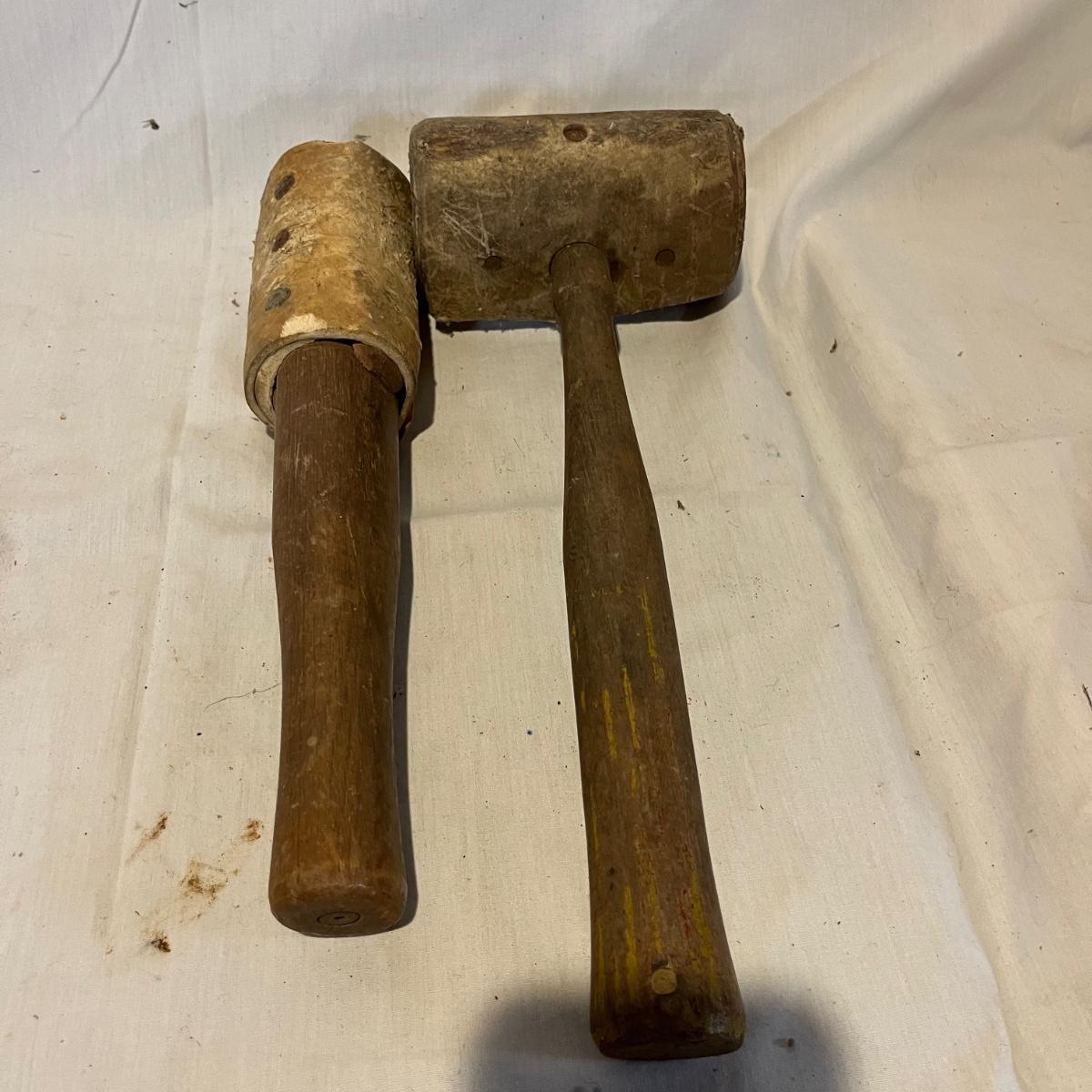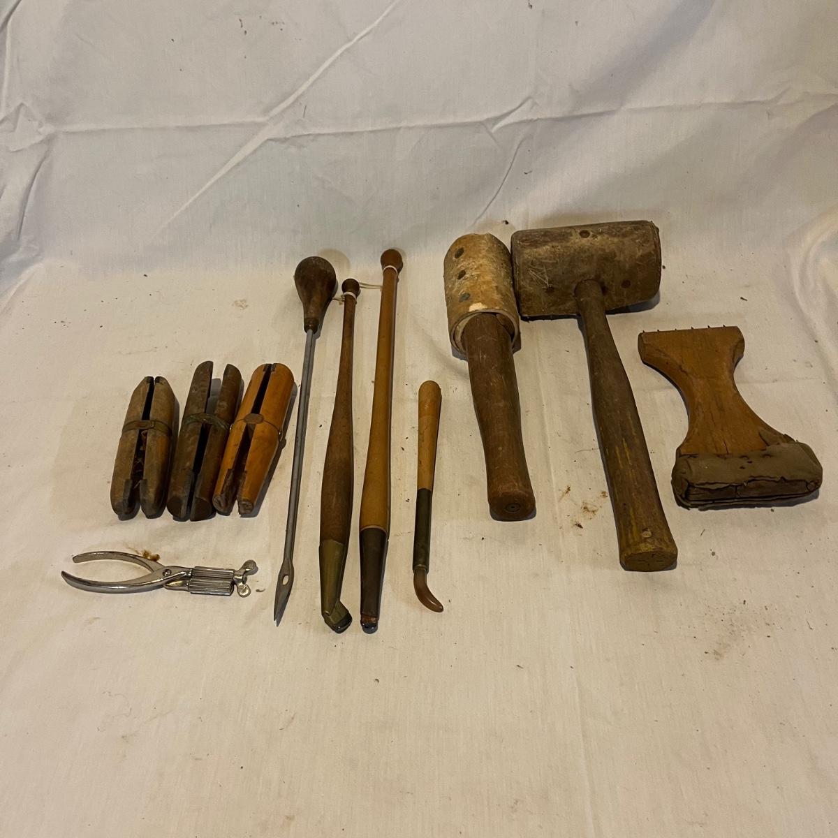 Lot includes two rawhide hammers, three wooden leather holders, pliers, three wood handled tools and a metal tool with wooden handle. Largest hammer measures 5” x 14” x 2.75”.