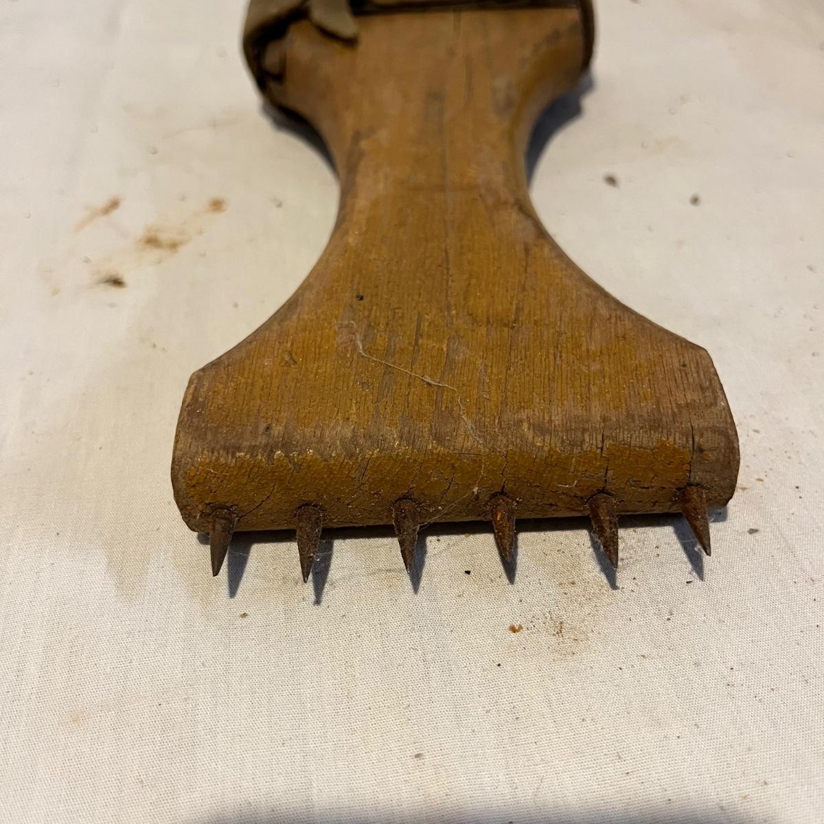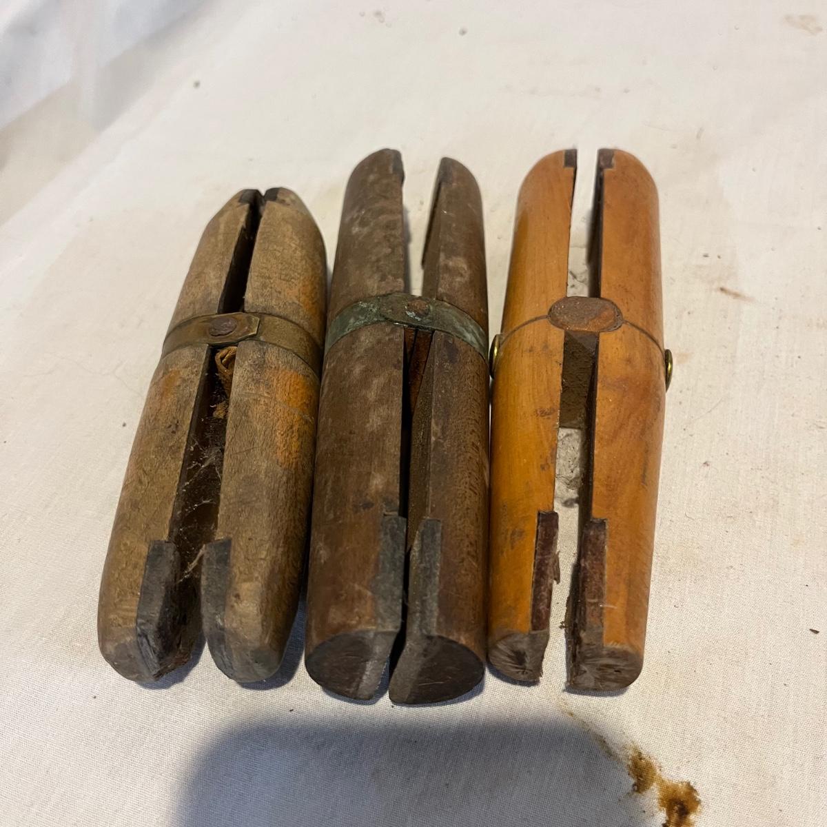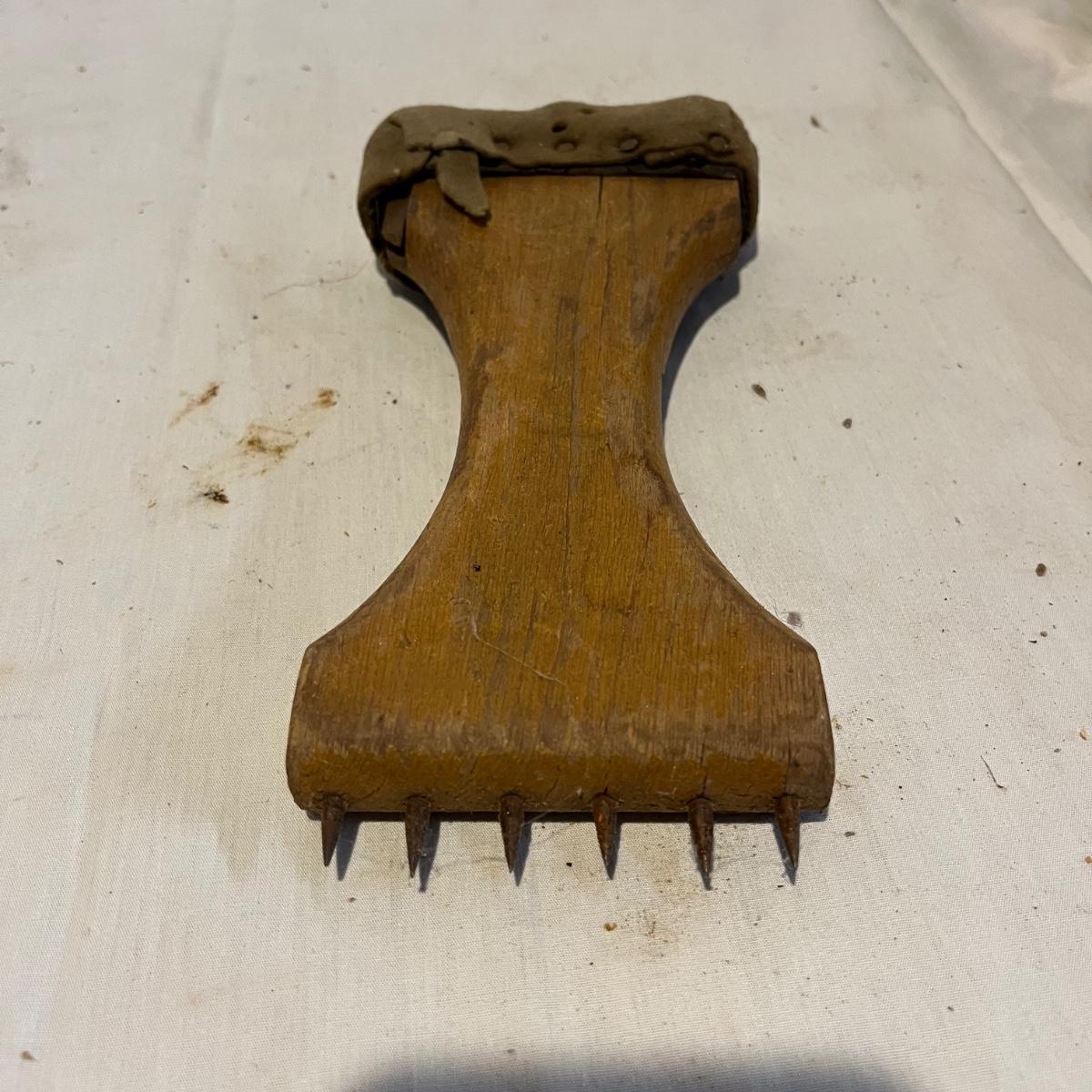 Lot includes two rawhide hammers, three wooden leather holders, pliers, three wood handled tools and a metal tool with wooden handle. Largest hammer measures 5” x 14” x 2.75”.