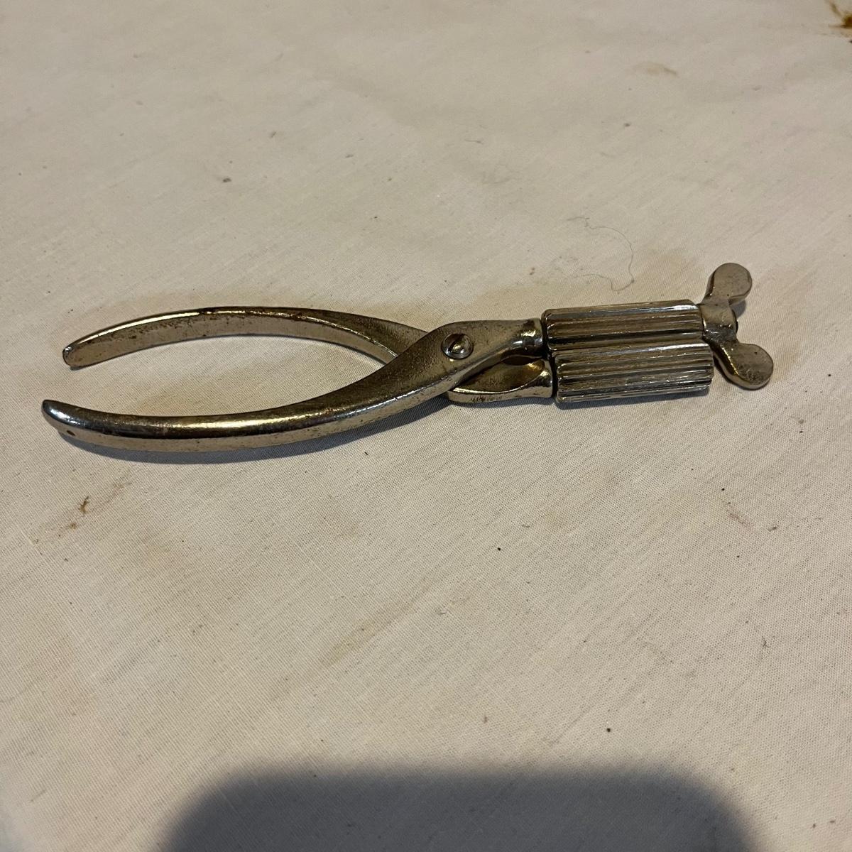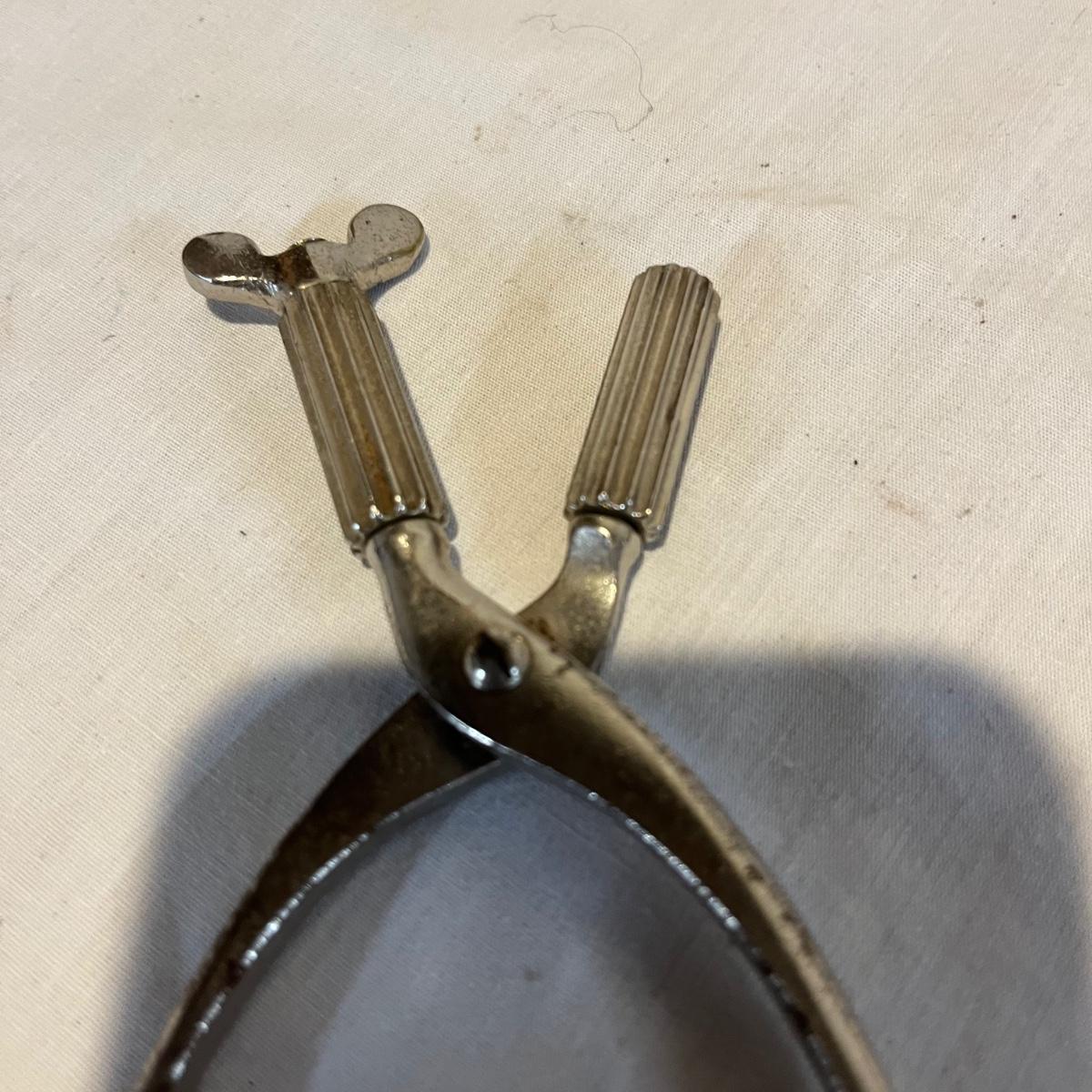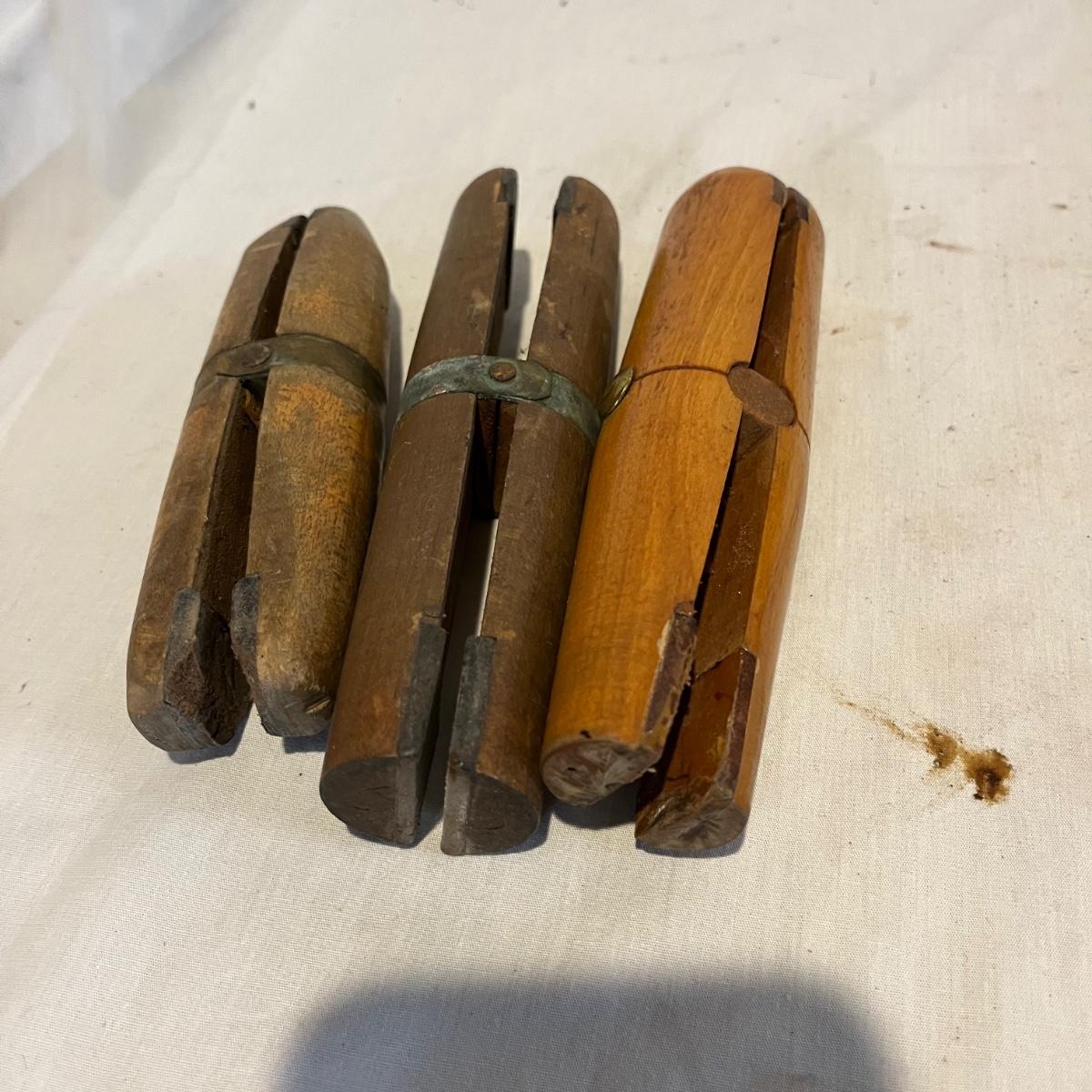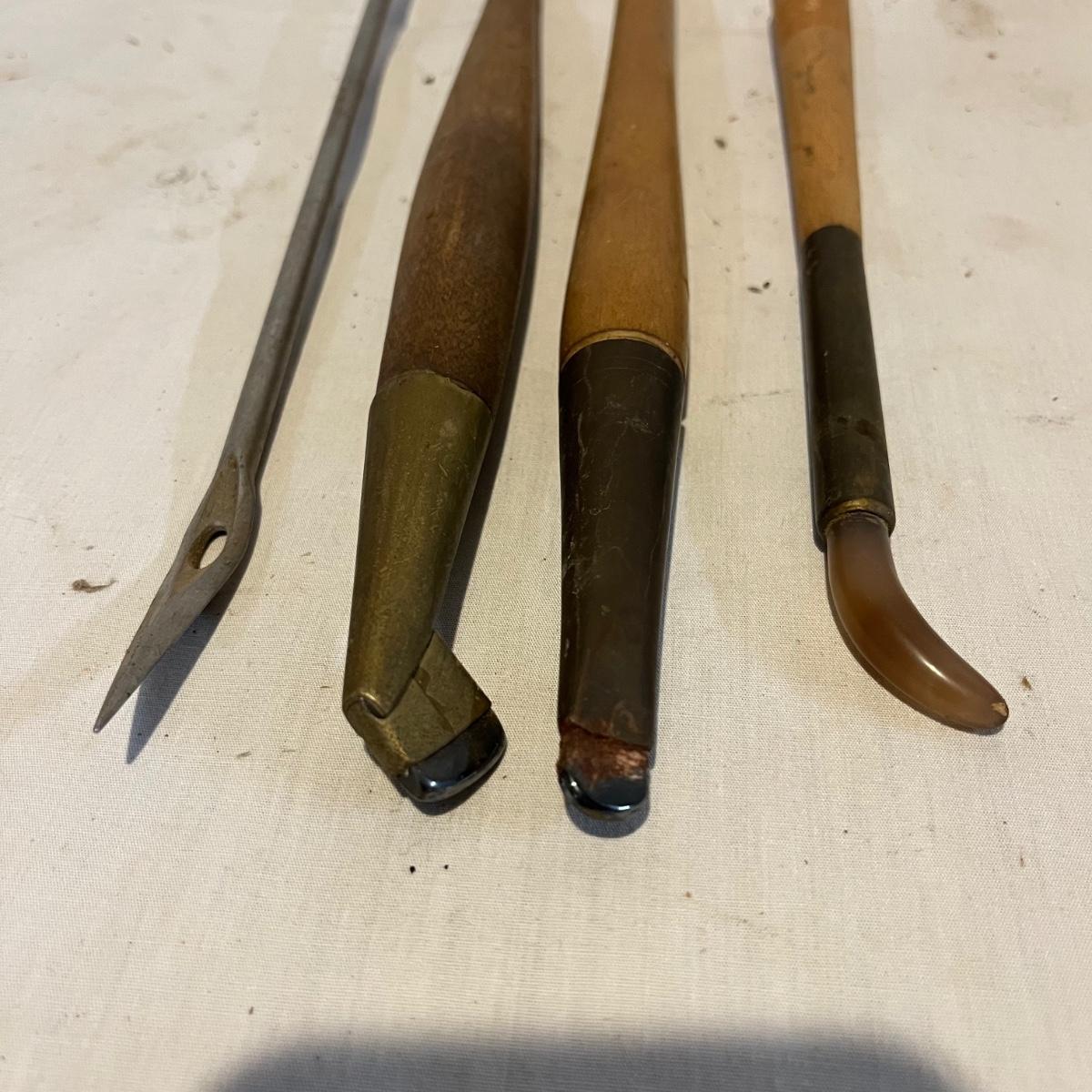 Lot includes two rawhide hammers, three wooden leather holders, pliers, three wood handled tools and a metal tool with wooden handle. Largest hammer measures 5” x 14” x 2.75”.