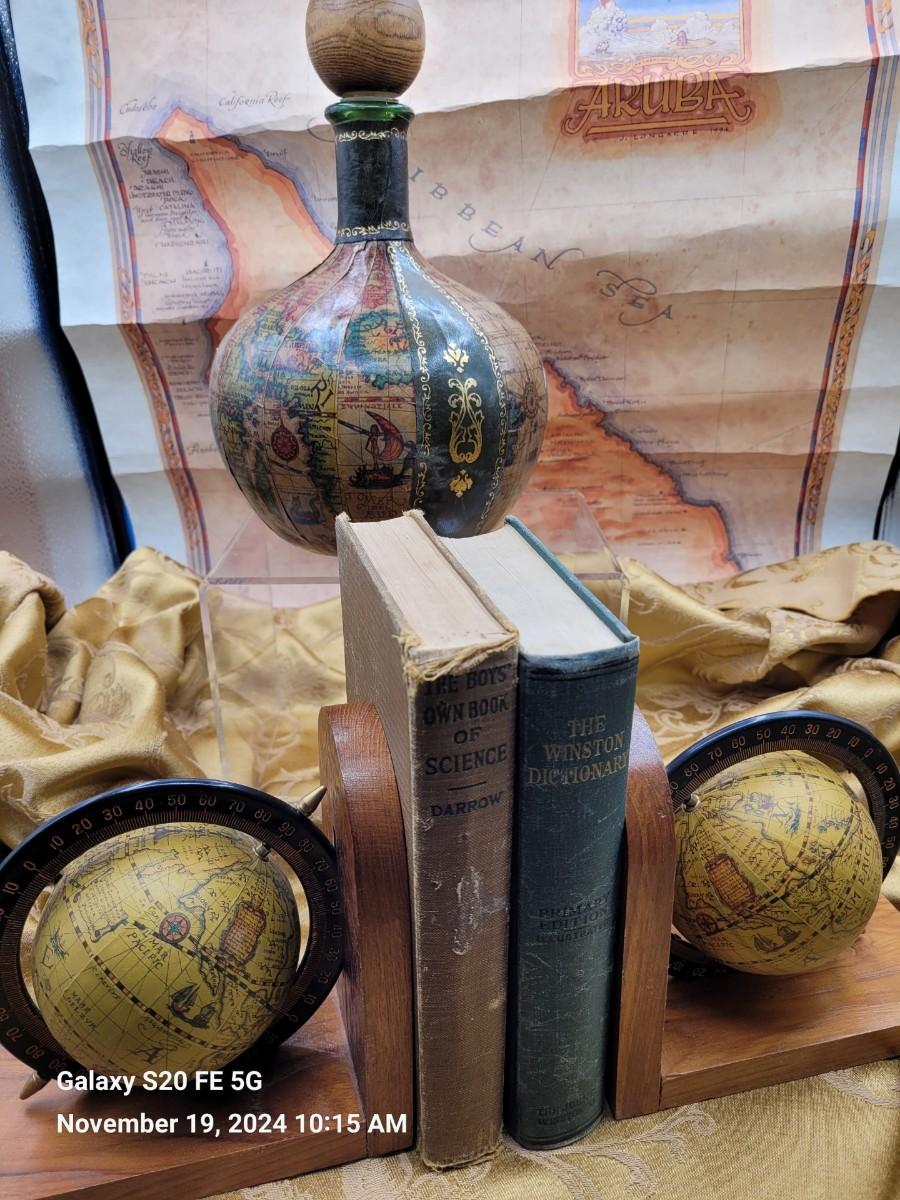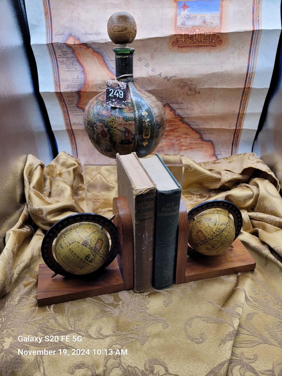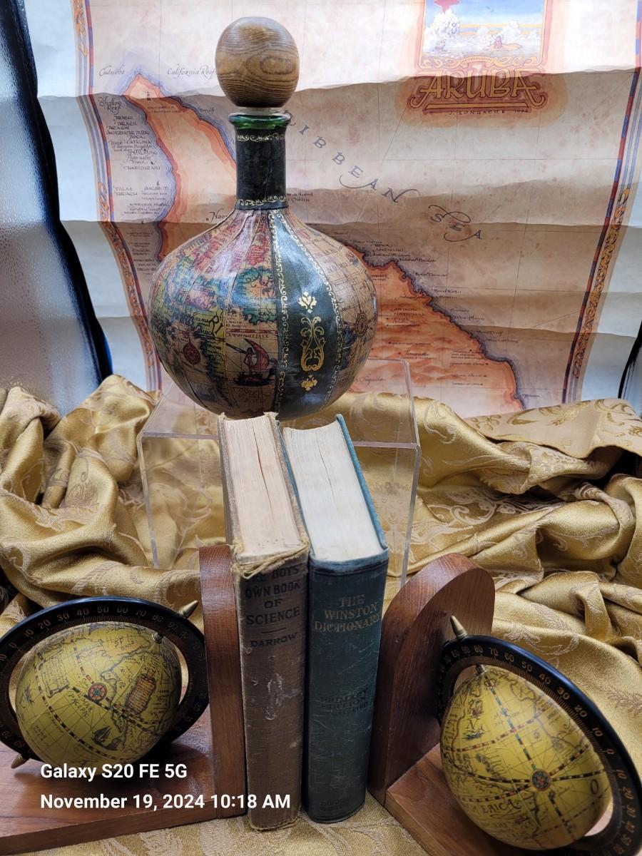 Vittoria 1960s globe print leather wrapped decanter , and a pair of bookends with globe, along with a 1994 map of Aruba. Books are not included.