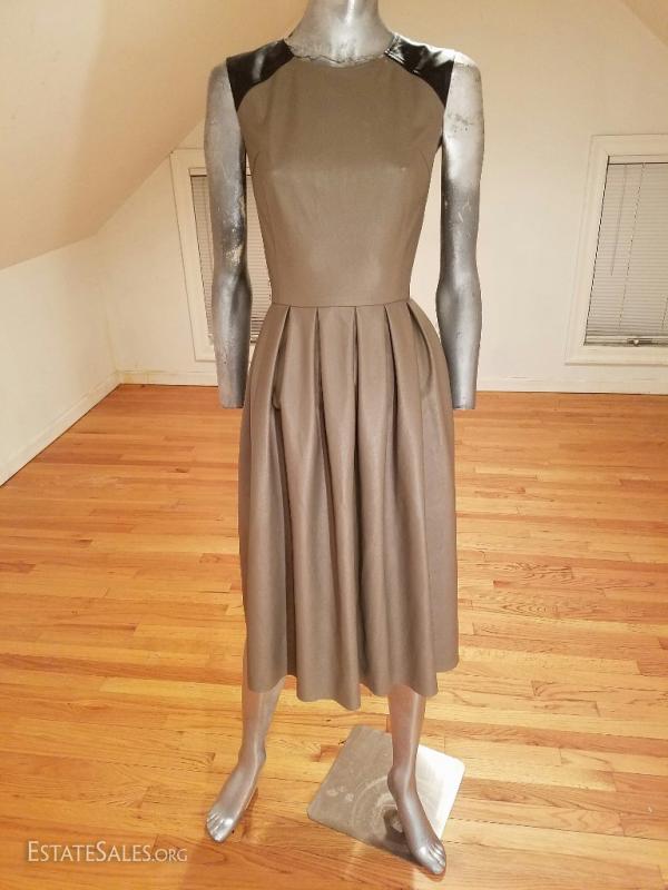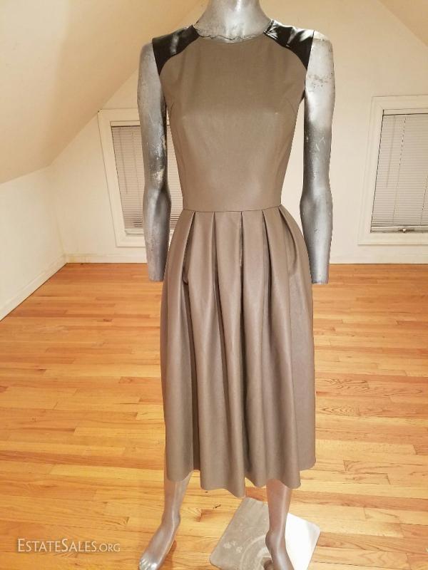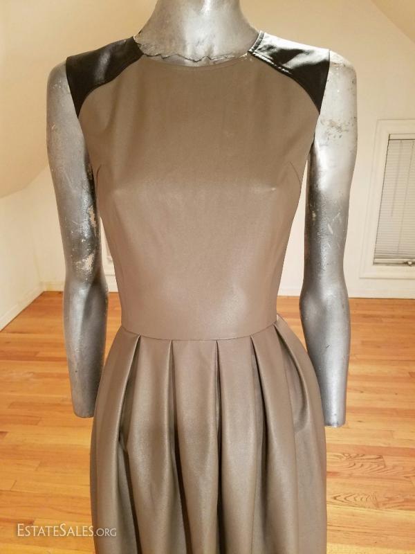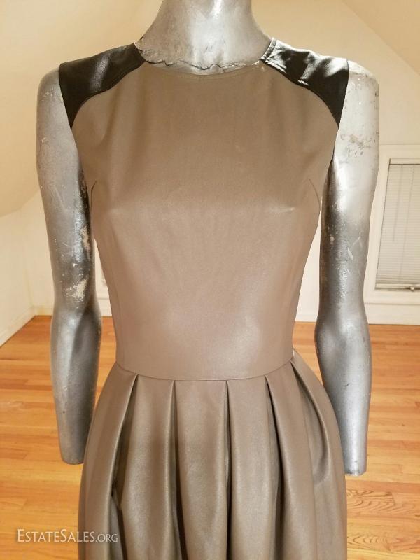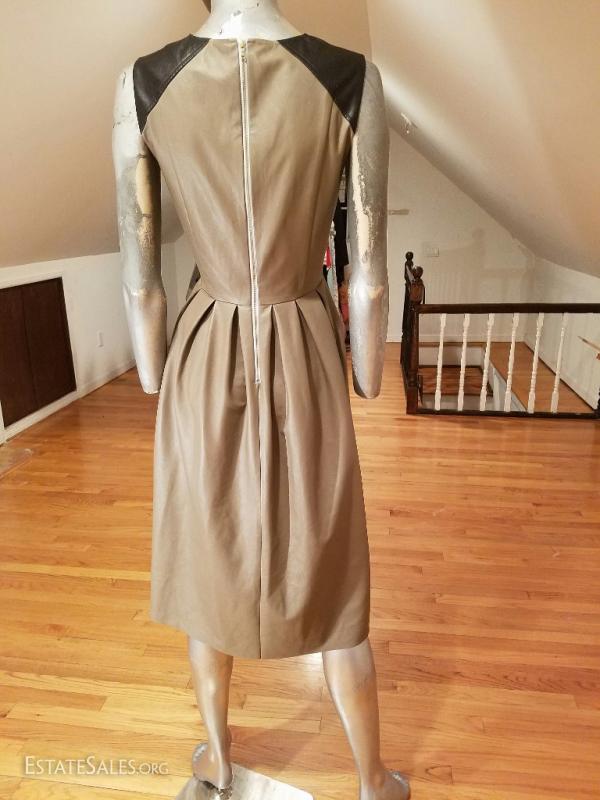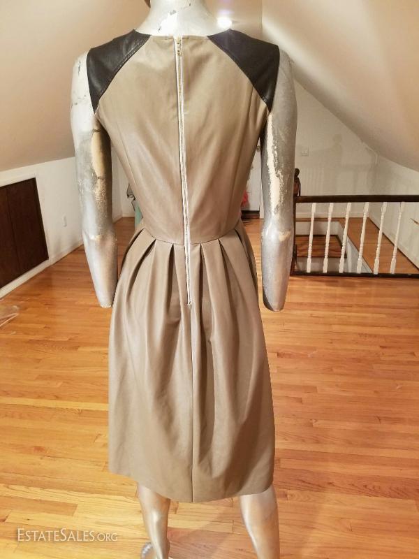 Beautiful color block faux leather or leatherette pleated dress in taupe and black at top of shoulder details worn twice . this one is a beauty