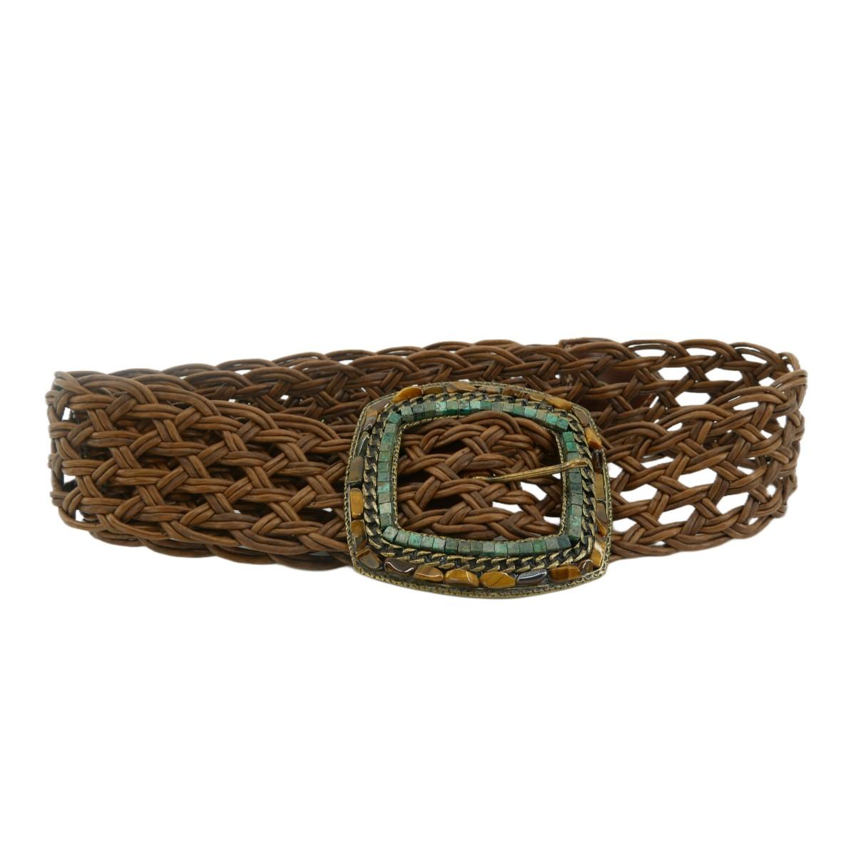 Leatherock USA women's braided belt inlaid with turquoise and tiger's eye. Largest size measures approximately 41" in length and can be sized down to fit anything smaller. Size of belt buckle 4" x 3.5". Total weight is 6.7 oz.