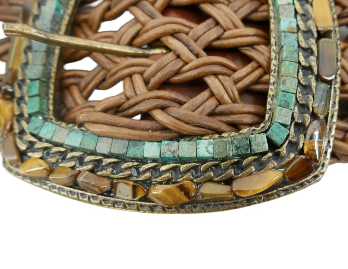 Leatherock USA women's braided belt inlaid with turquoise and tiger's eye. Largest size measures approximately 41" in length and can be sized down to fit anything smaller. Size of belt buckle 4" x 3.5". Total weight is 6.7 oz.