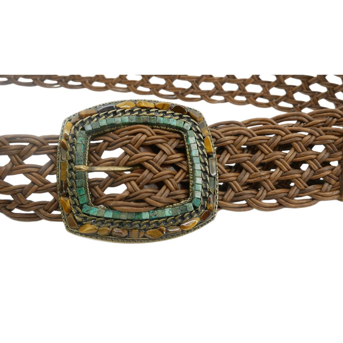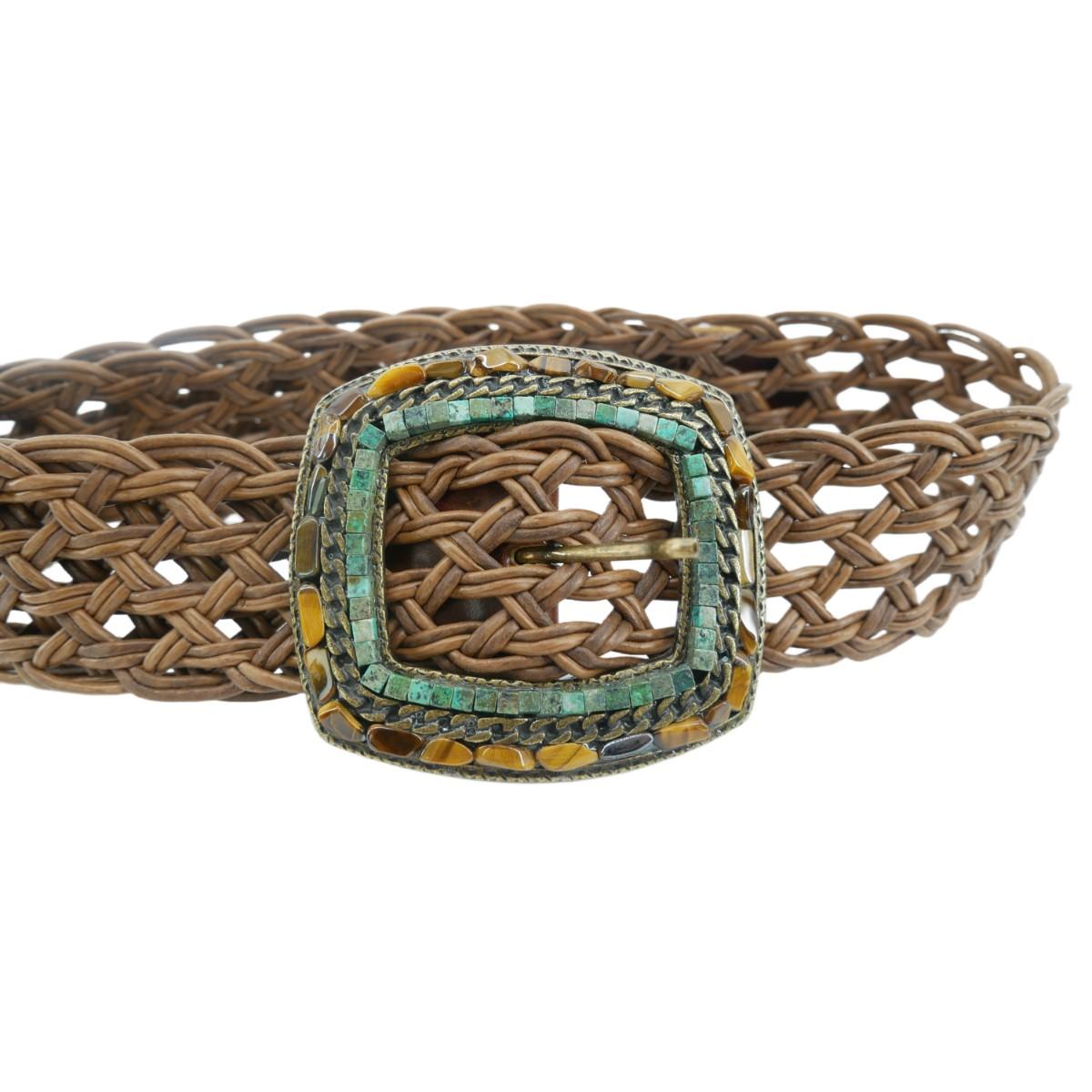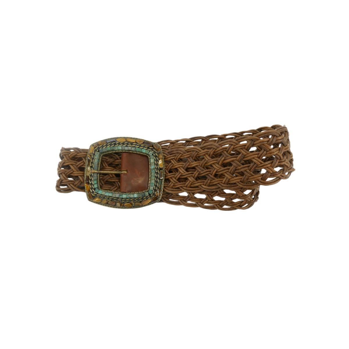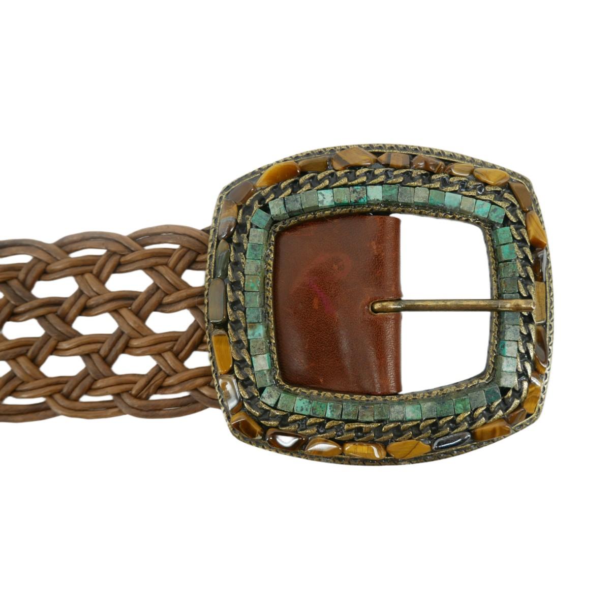Leatherock USA women's braided belt inlaid with turquoise and tiger's eye. Largest size measures approximately 41" in length and can be sized down to fit anything smaller. Size of belt buckle 4" x 3.5". Total weight is 6.7 oz.