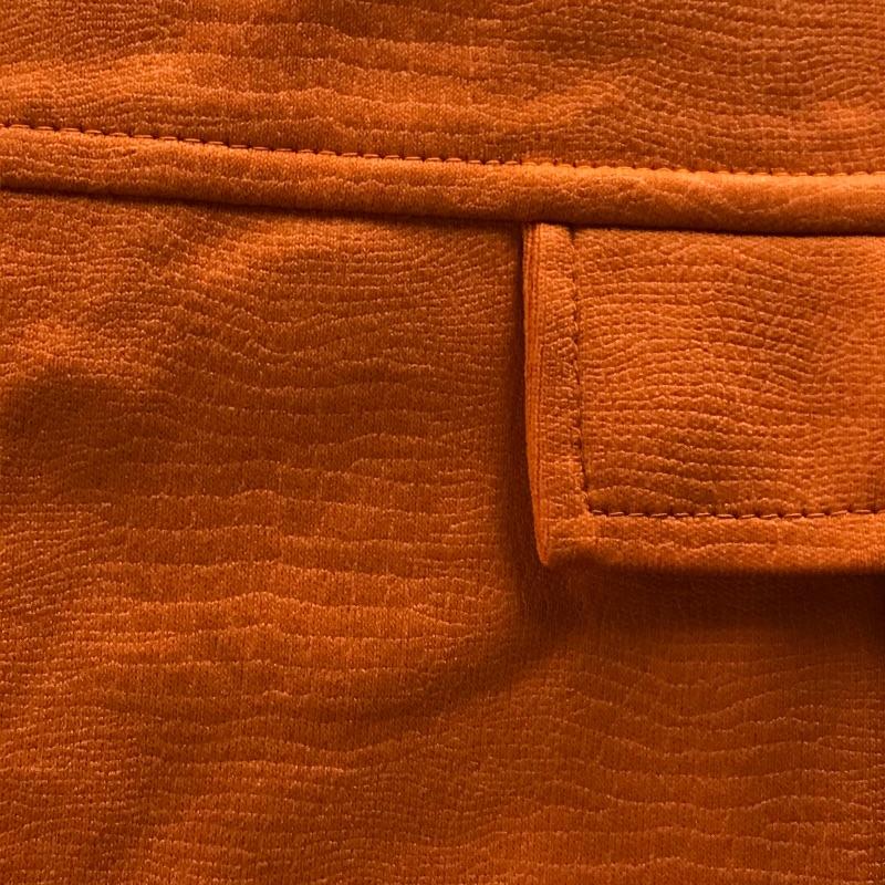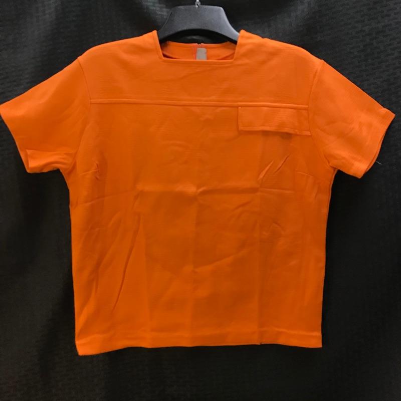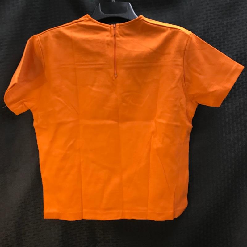 This appears to be a homemade shirt comprised of an orange synthetic material with a pattern that looks like the surface of leather. No size tags; appears to approximate an adult medium.