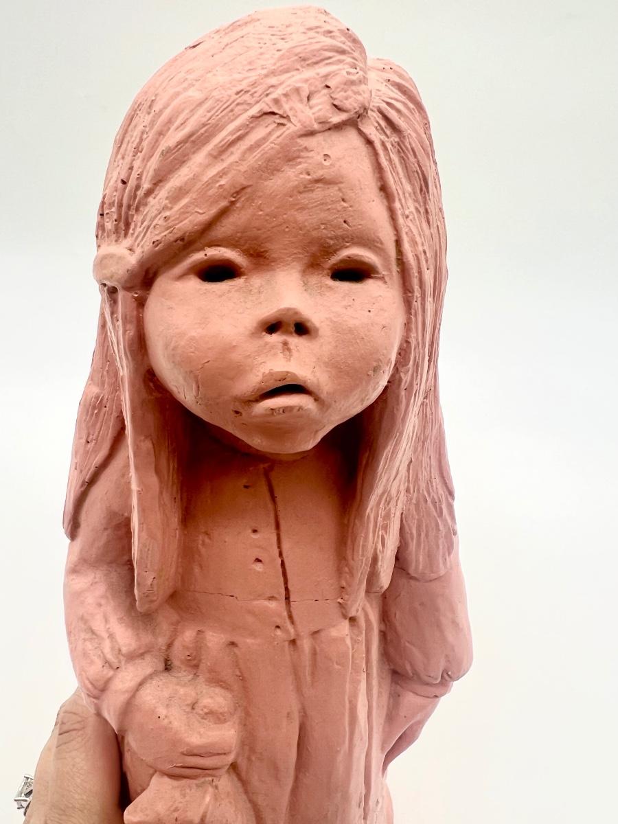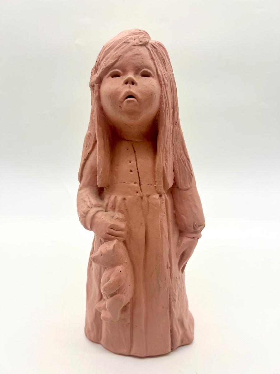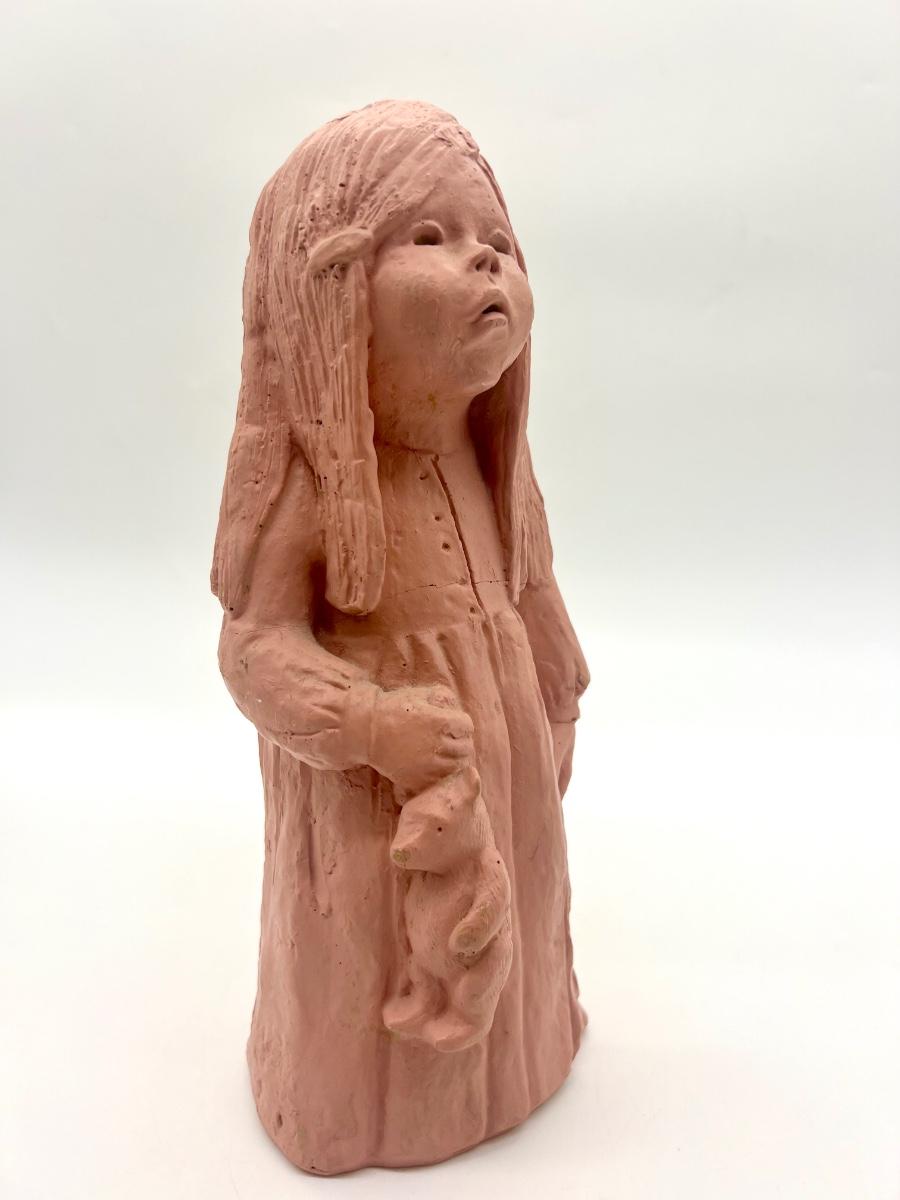 Lee Bortin Clay Sculpture Figurine Girl in Dress with Bear Art Signed. Measures 12 inches