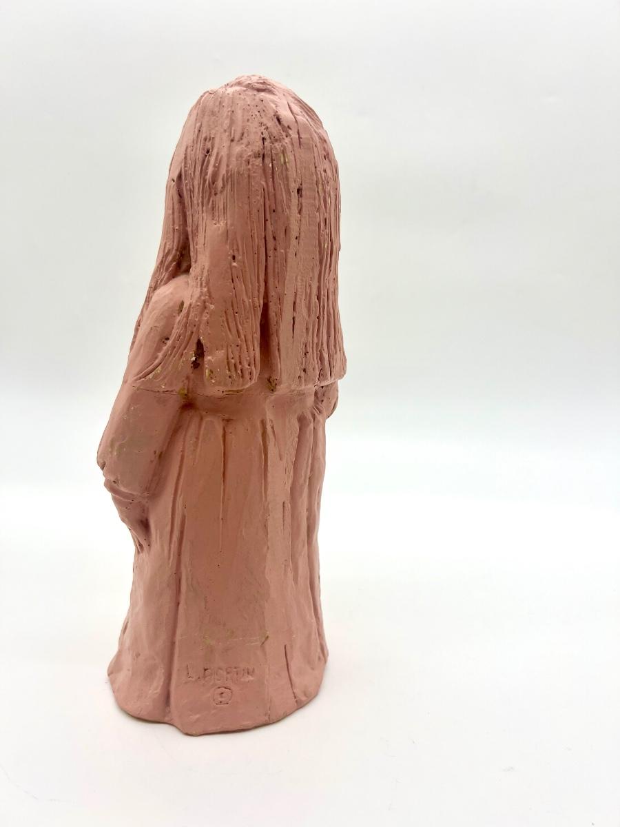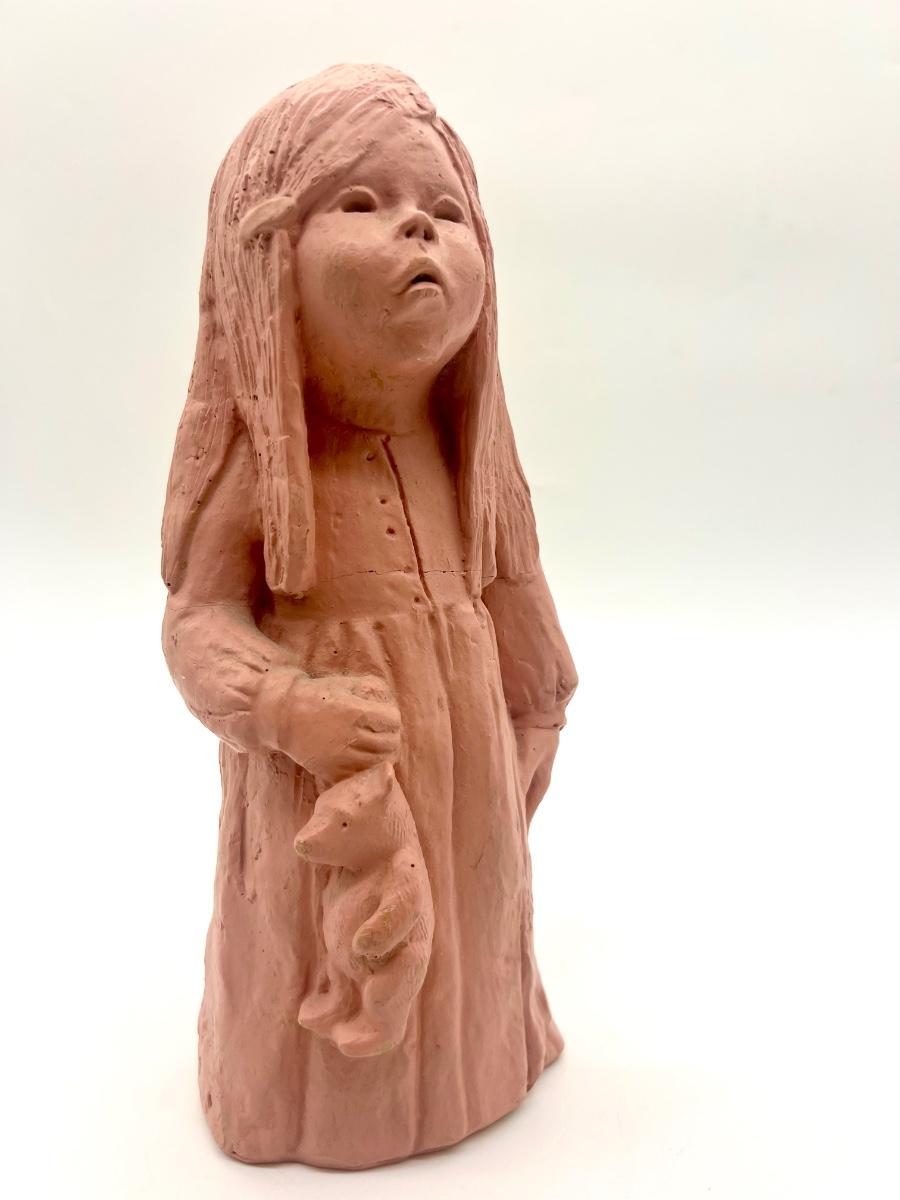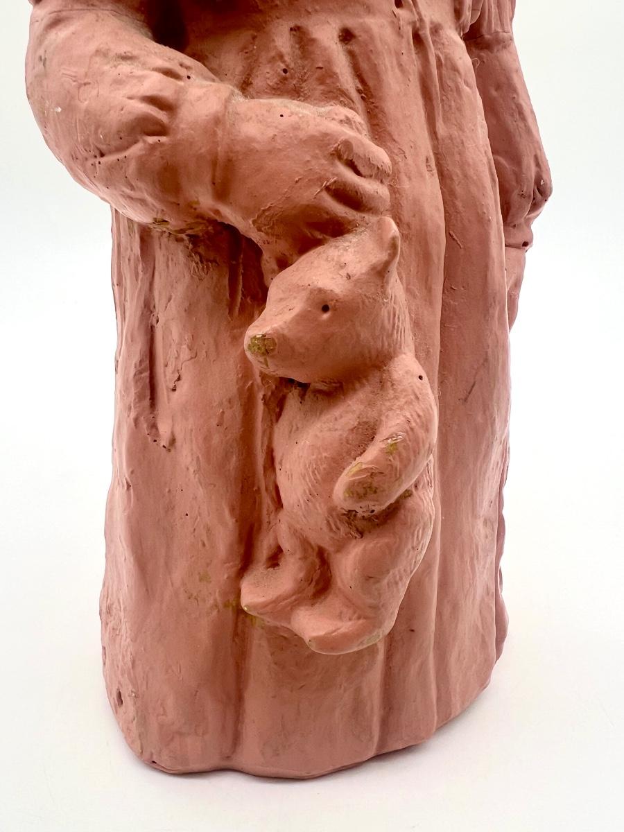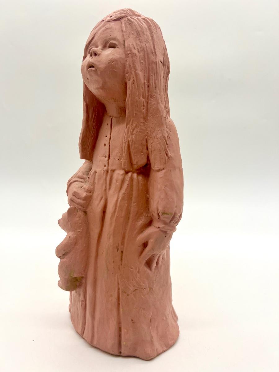 Lee Bortin Clay Sculpture Figurine Girl in Dress with Bear Art Signed. Measures 12 inches