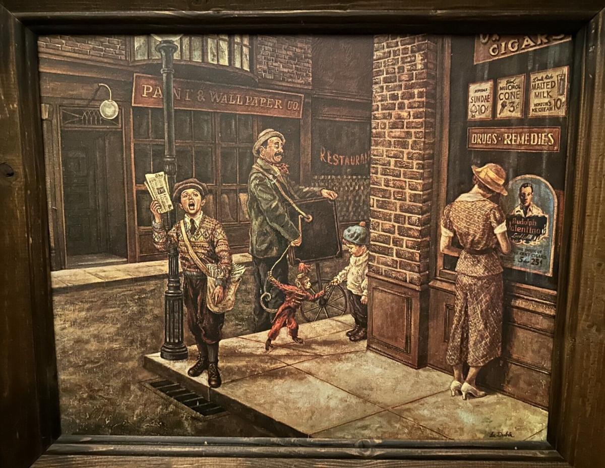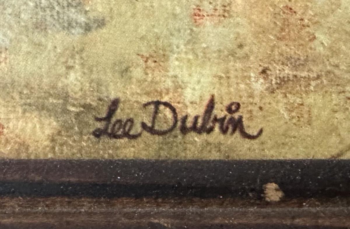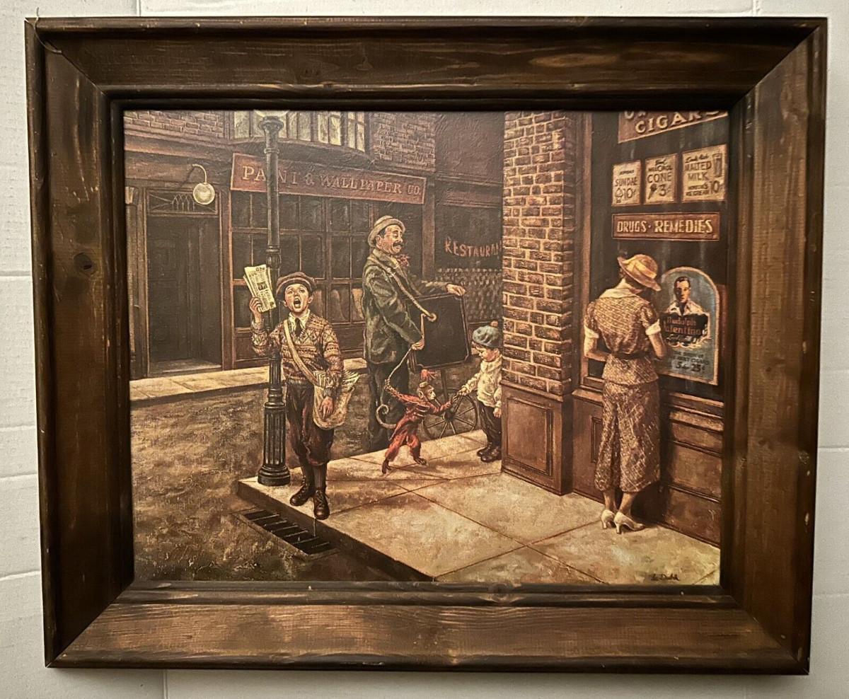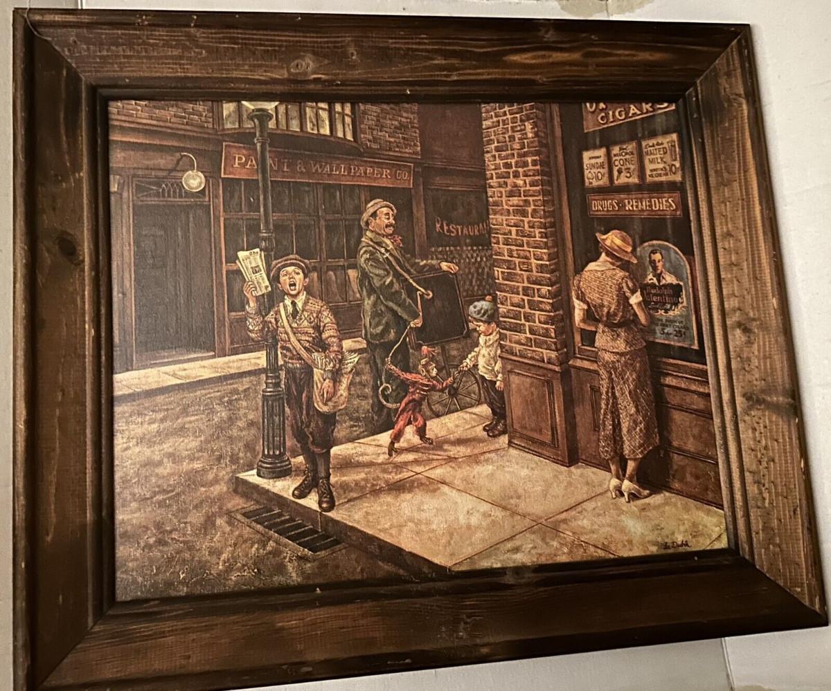 Here is a framed vintage art print of "The News Hawker" by nationally recognized California artist Lee Dubin..known best for her paintings of life in the nostalgic past...The wooden frame measures 24.25 x 20.5" with a textured 20 x 16"...Good condition...As shown.