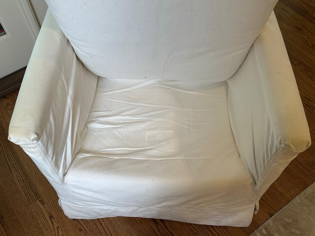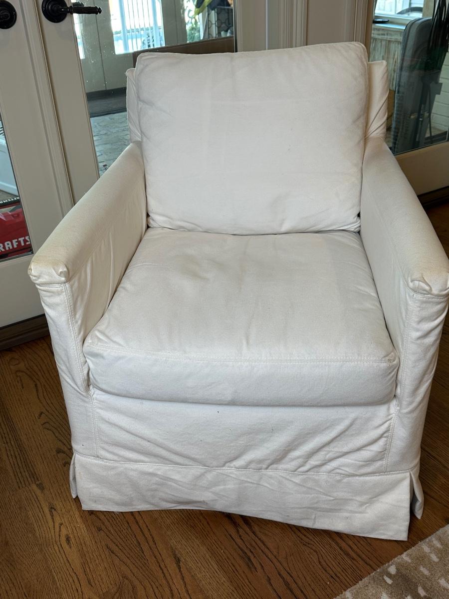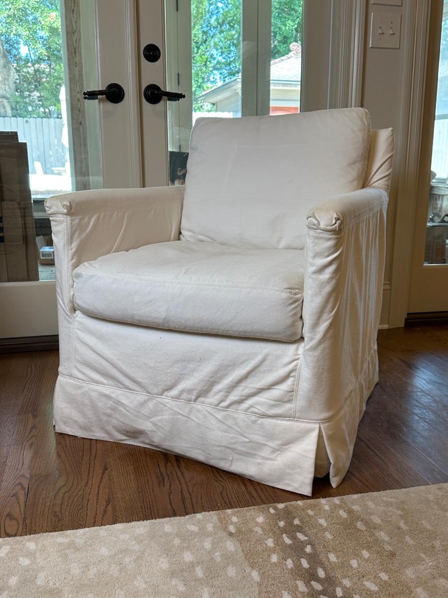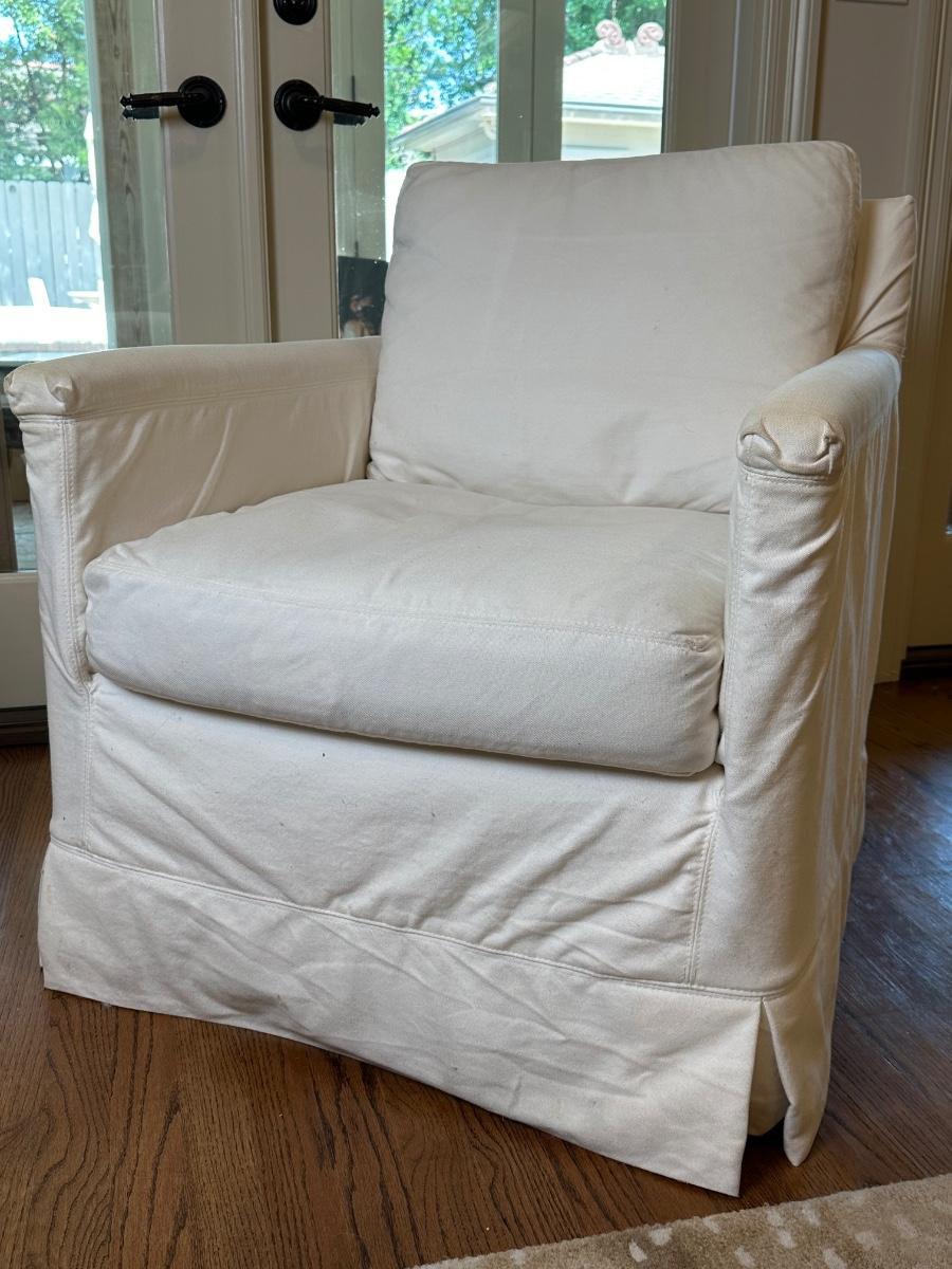 Classic white slipcovered armchair by Lee Industries. Features a tailored skirt with corner pleats and plush, removable cushions. Earth-friendly construction, handcrafted in North Carolina.