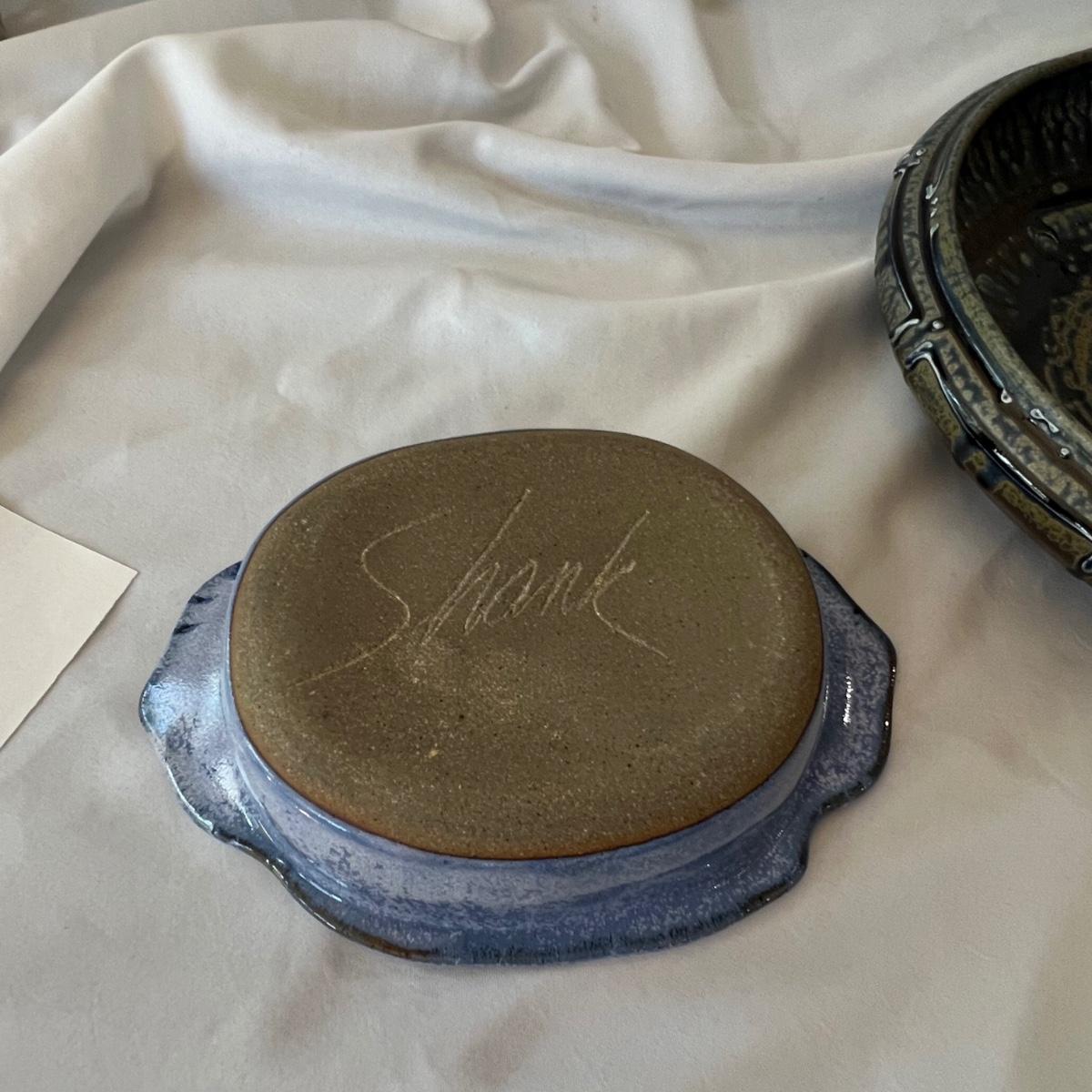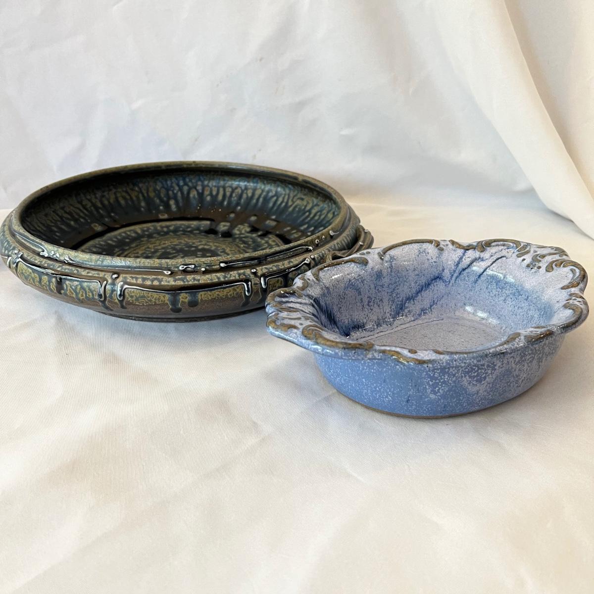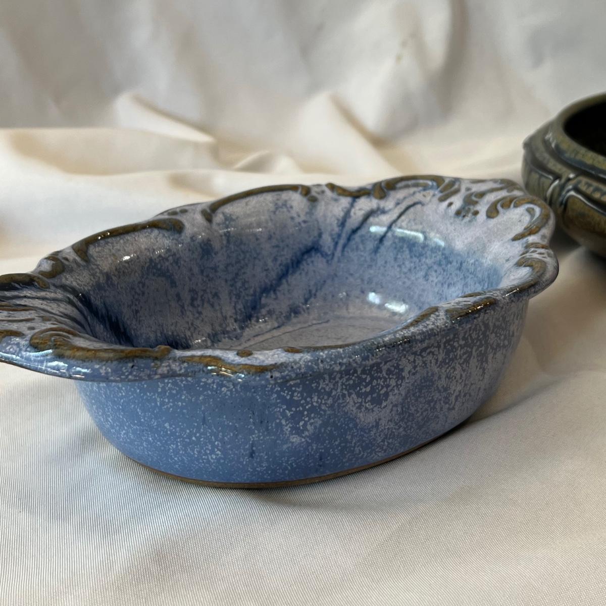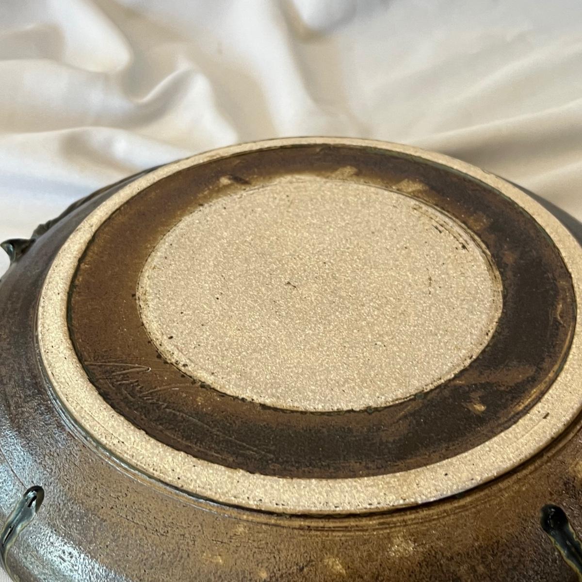 This pretty purple dish is signed by its potter, Lee Shank. Lot also includes a larger signed shallow bowl with handles; signature is indecipherable, it measures 12D x 3”H.