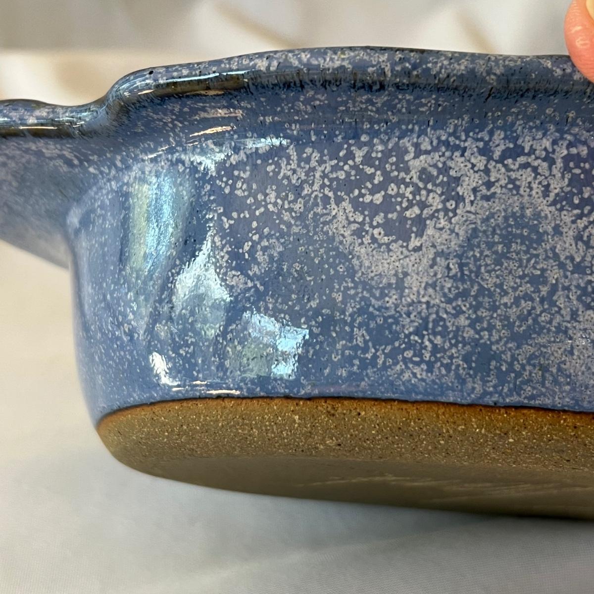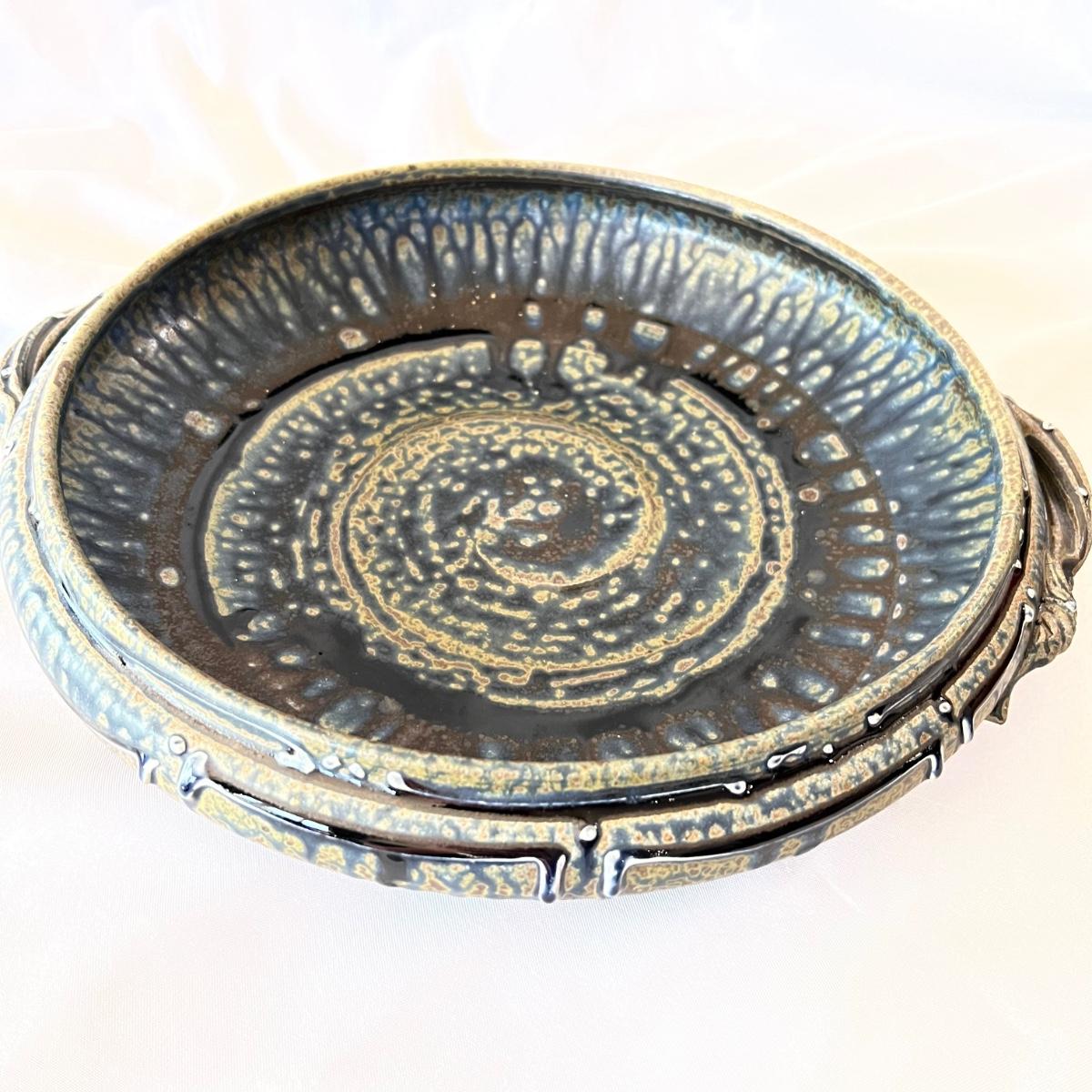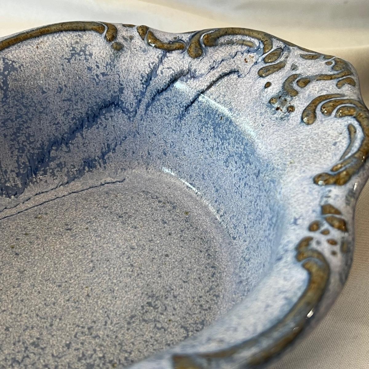 This pretty purple dish is signed by its potter, Lee Shank. Lot also includes a larger signed shallow bowl with handles; signature is indecipherable, it measures 12D x 3”H.