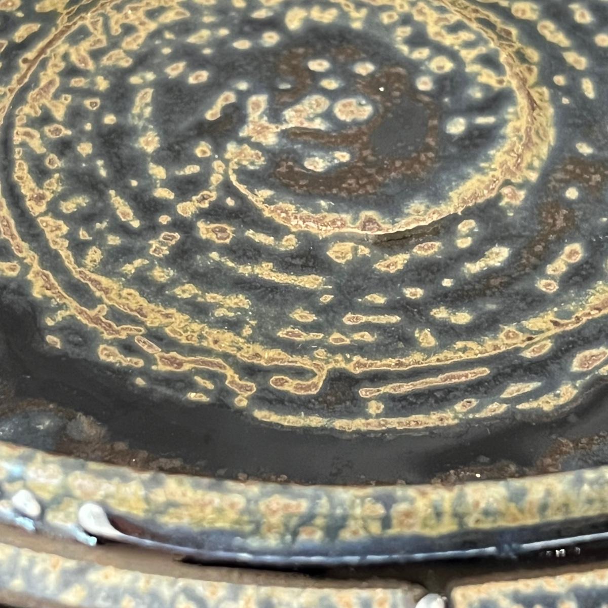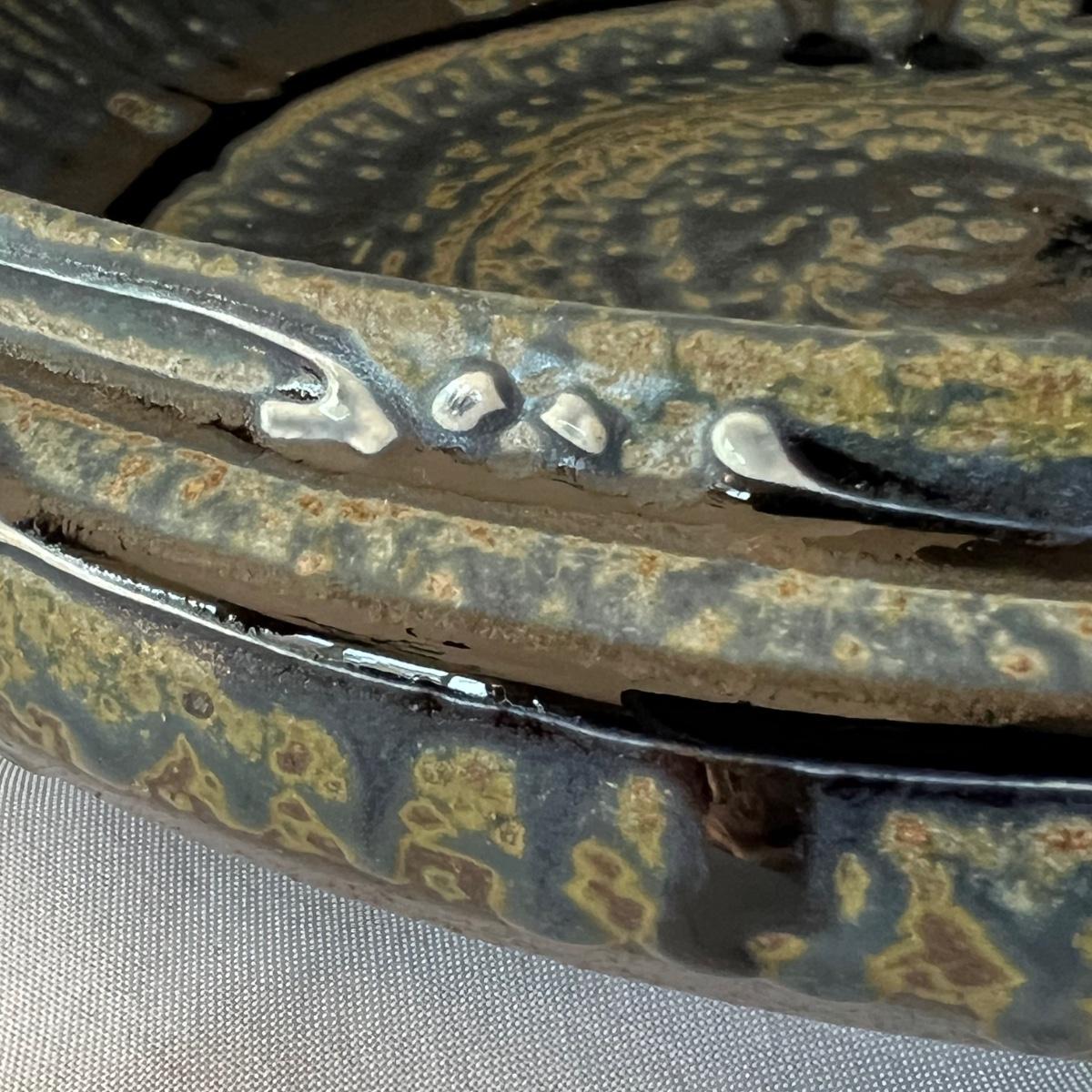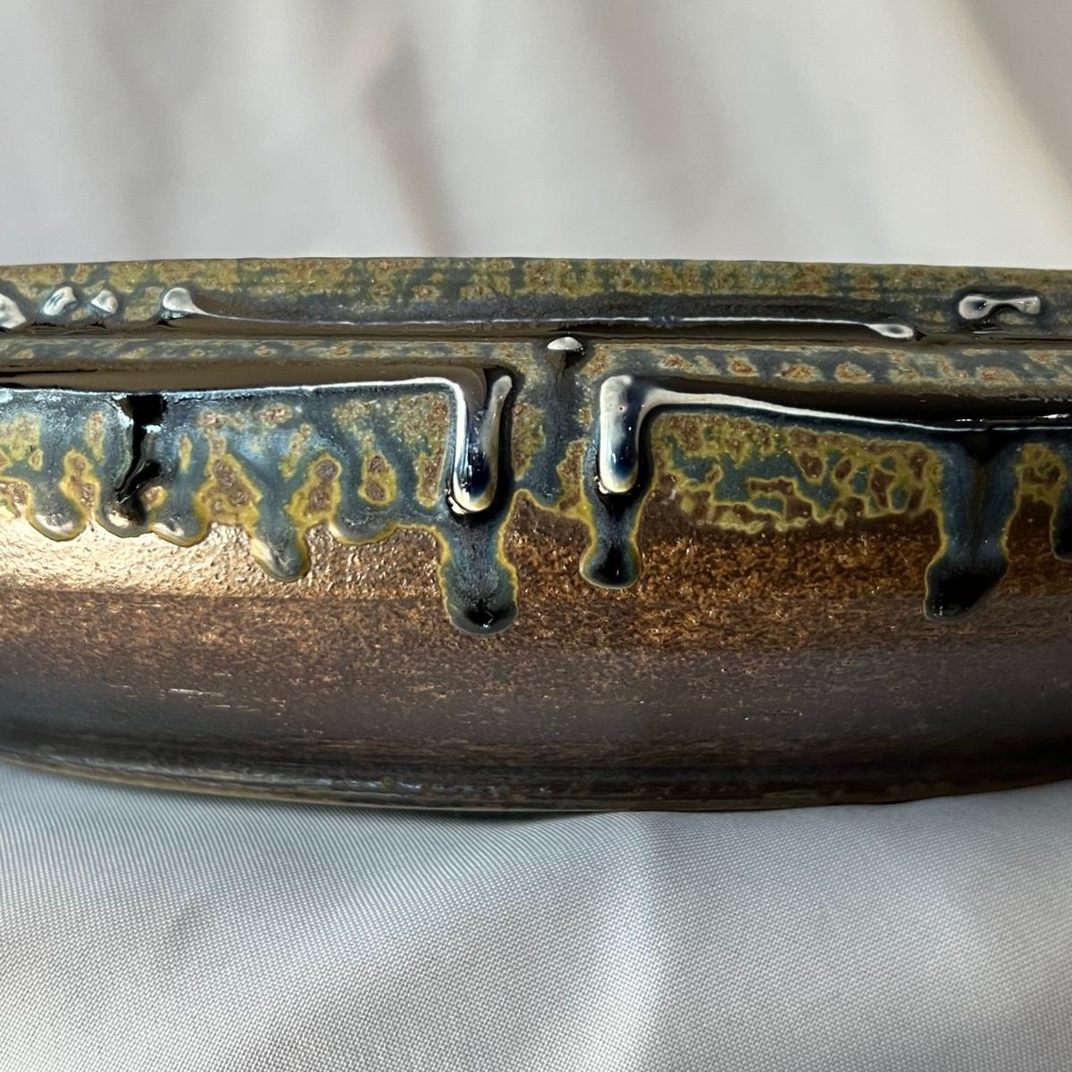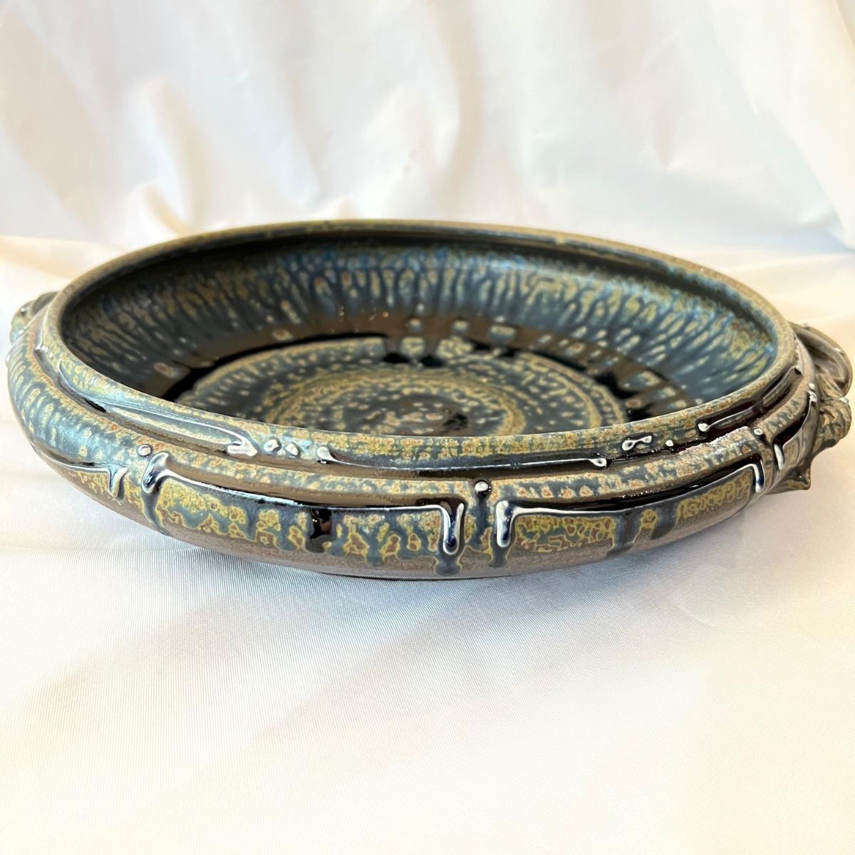 This pretty purple dish is signed by its potter, Lee Shank. Lot also includes a larger signed shallow bowl with handles; signature is indecipherable, it measures 12D x 3”H.