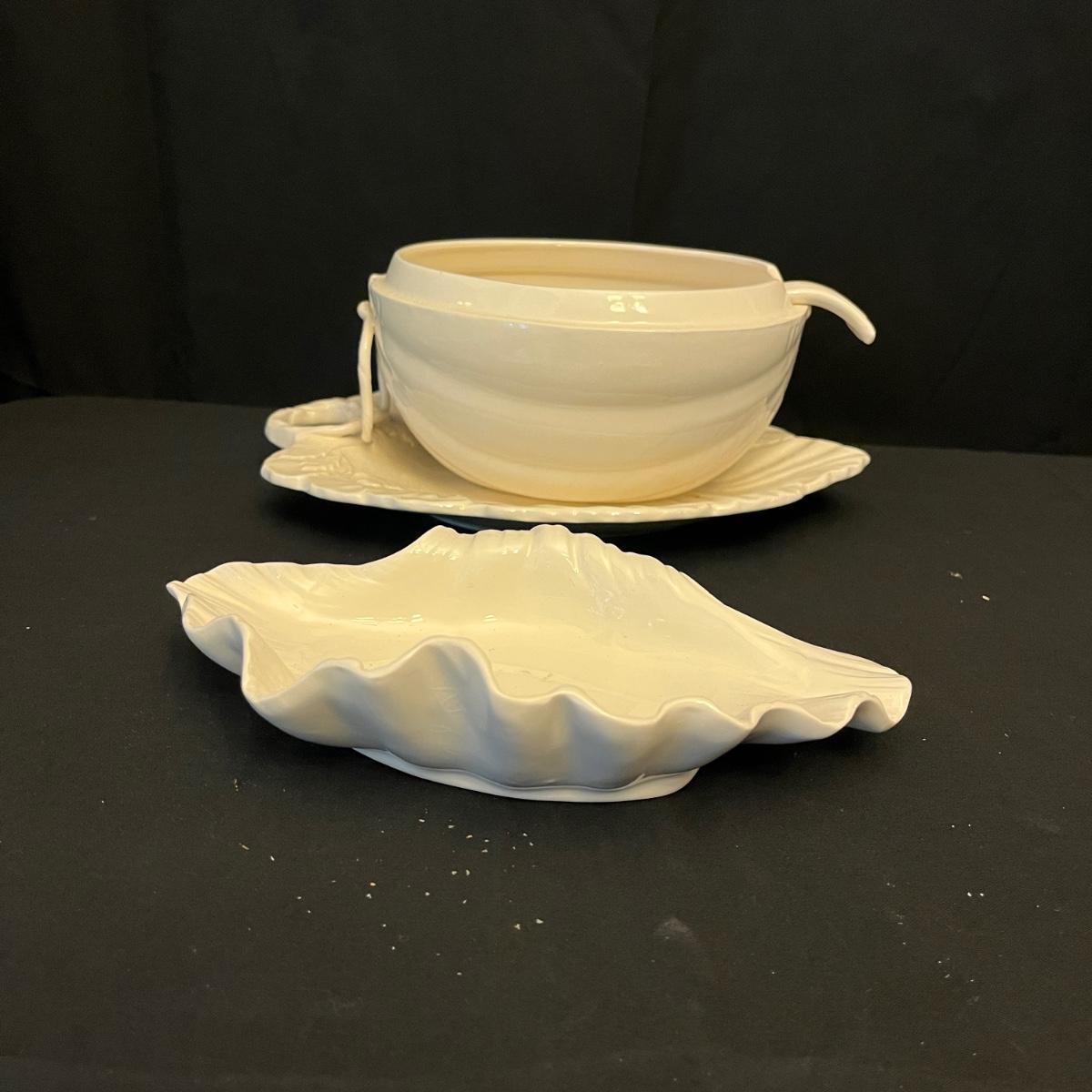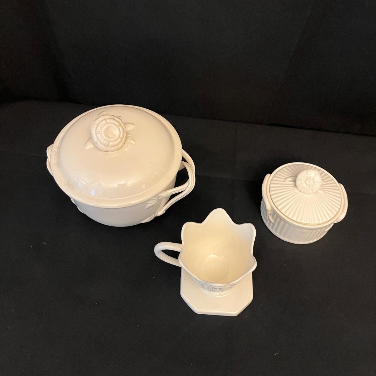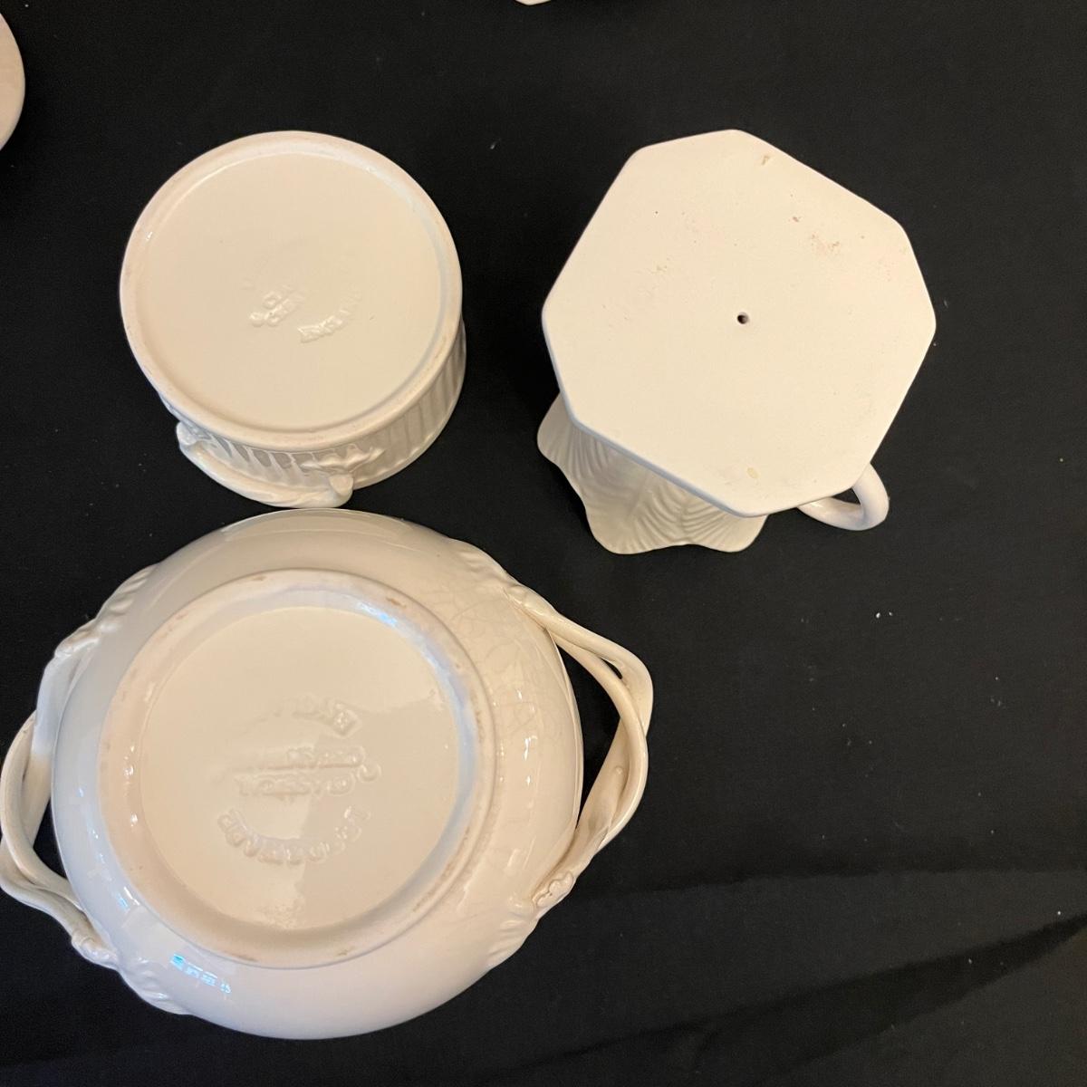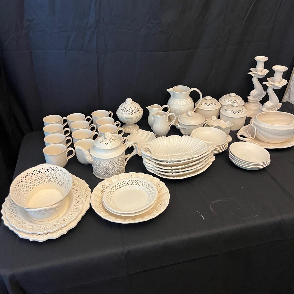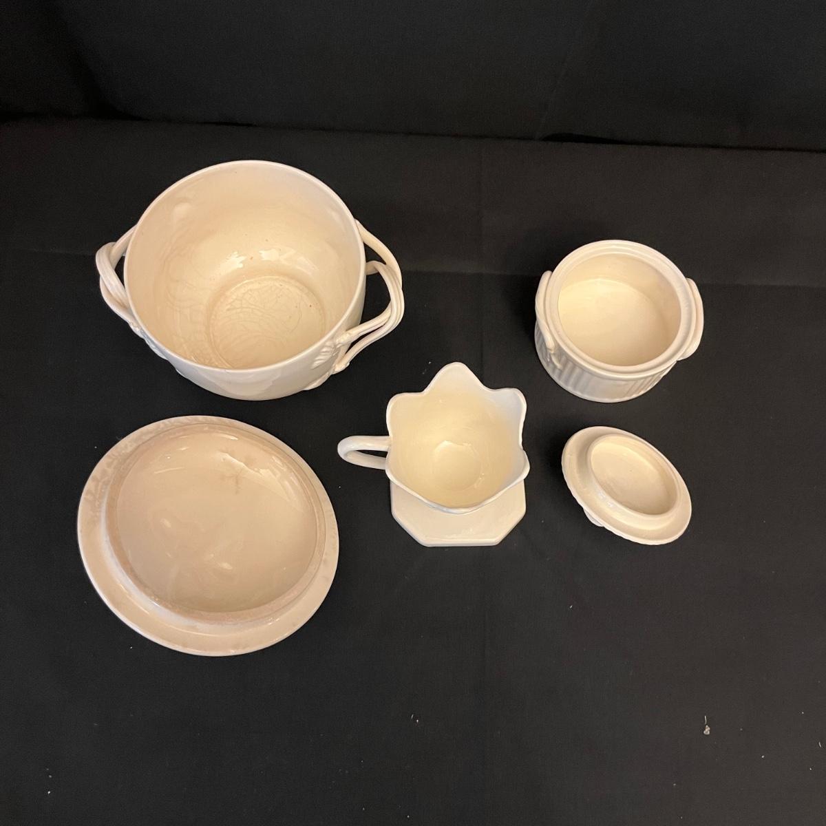 This Classic Leedsware from England Creamware pottery dishes includes six leaf dishes, 12 cups, 11 saucers, three containers with lids, teapot, miniature basket, bowl with lid, two candleholders, two small pitchers, embossed pitcher small and large plates, basket, gravy float with ladle and more. Gravy boat measures 10” x 8.5” x 4.5”H and is missing lid.