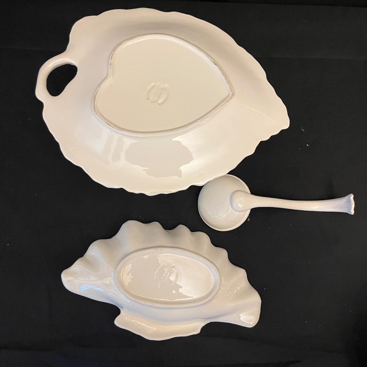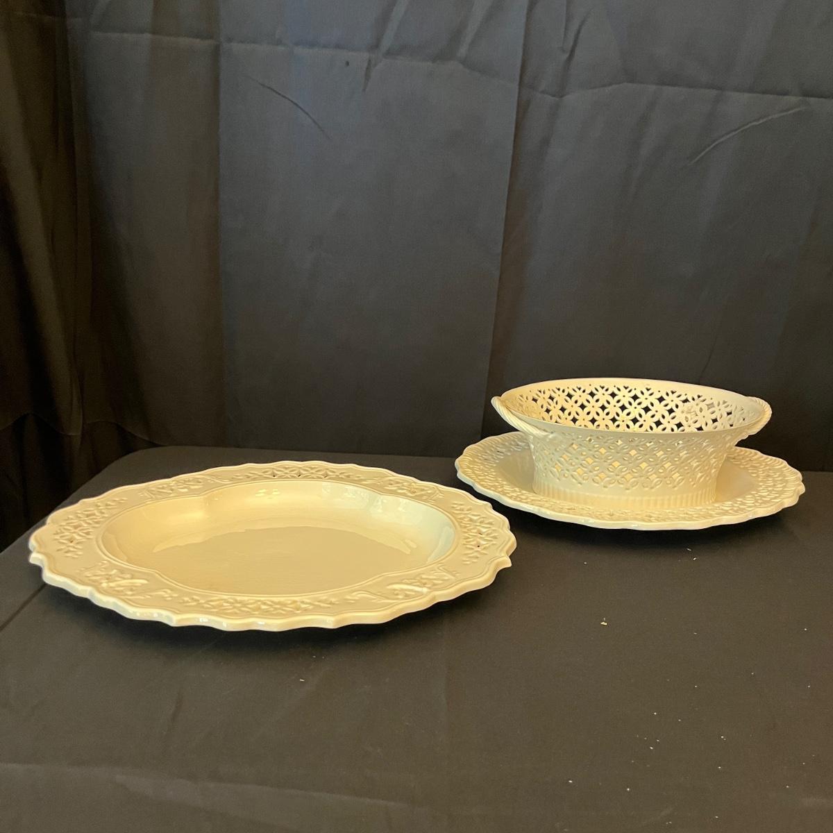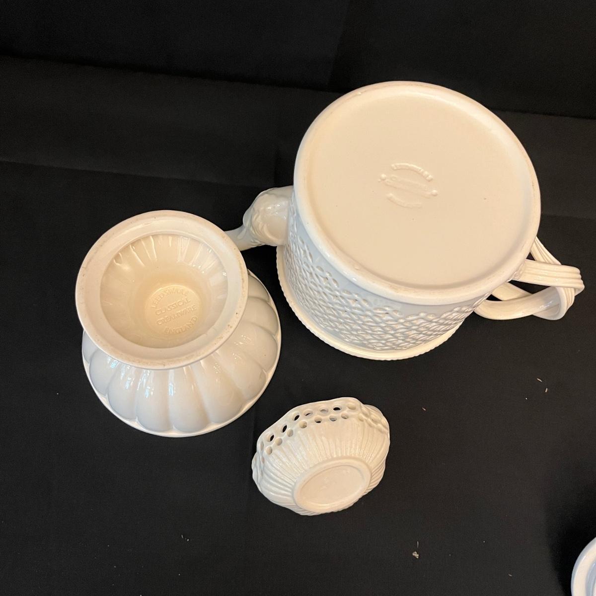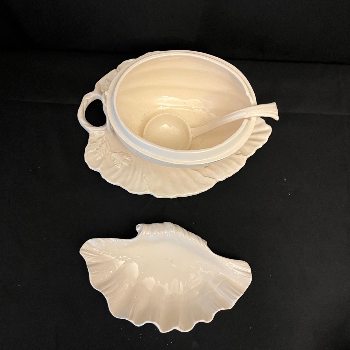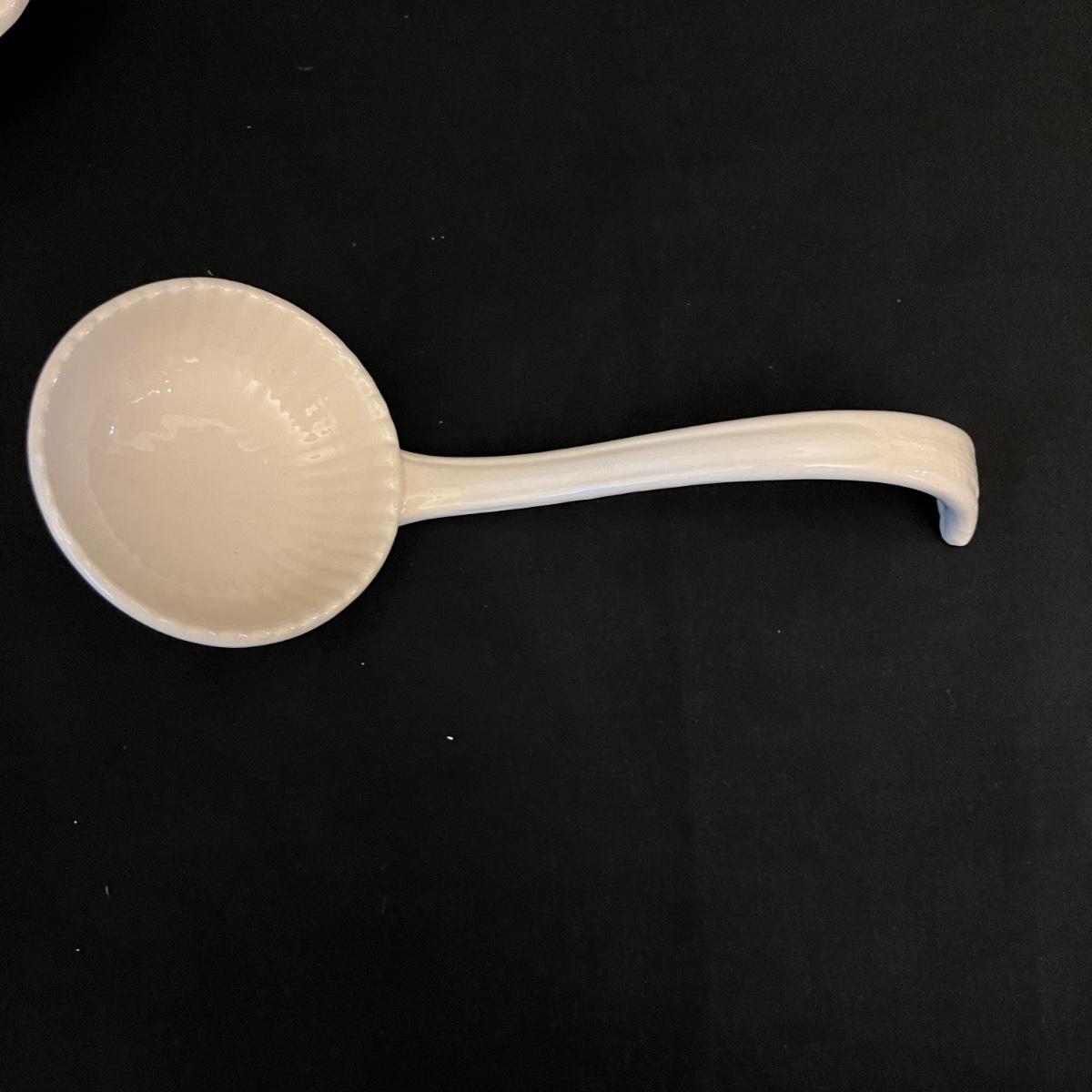 This Classic Leedsware from England Creamware pottery dishes includes six leaf dishes, 12 cups, 11 saucers, three containers with lids, teapot, miniature basket, bowl with lid, two candleholders, two small pitchers, embossed pitcher small and large plates, basket, gravy float with ladle and more. Gravy boat measures 10” x 8.5” x 4.5”H and is missing lid.