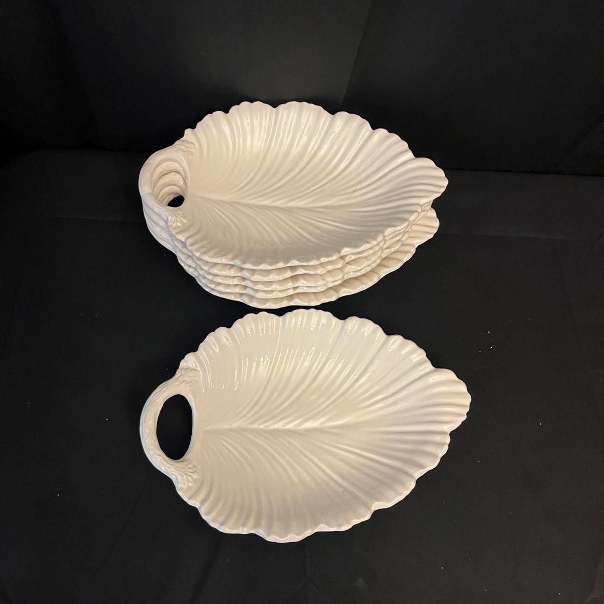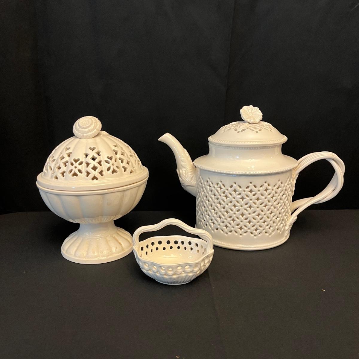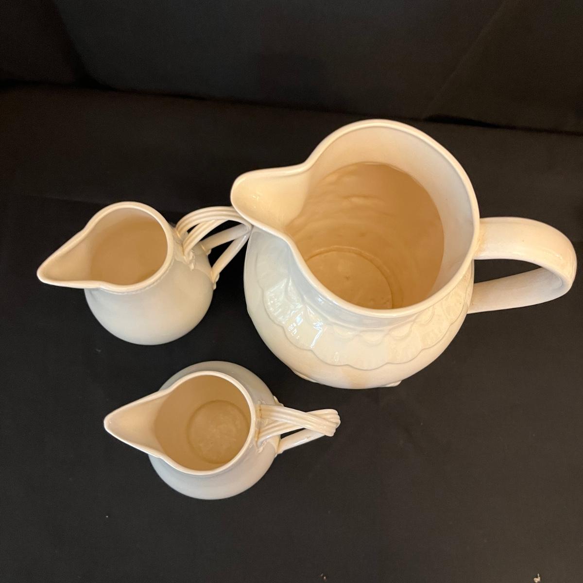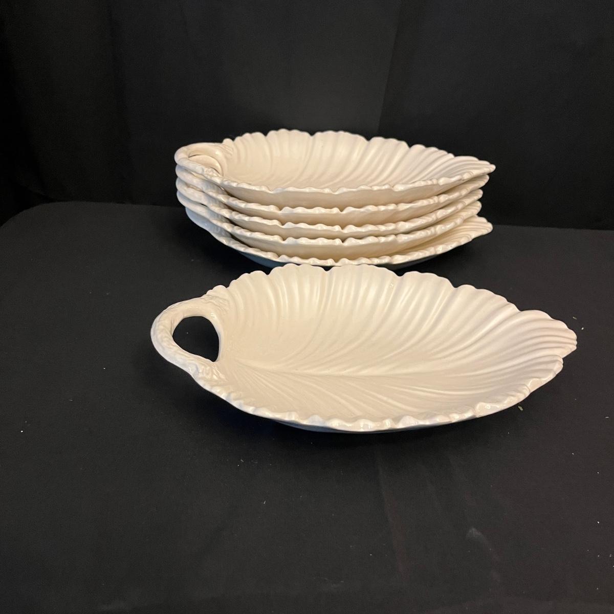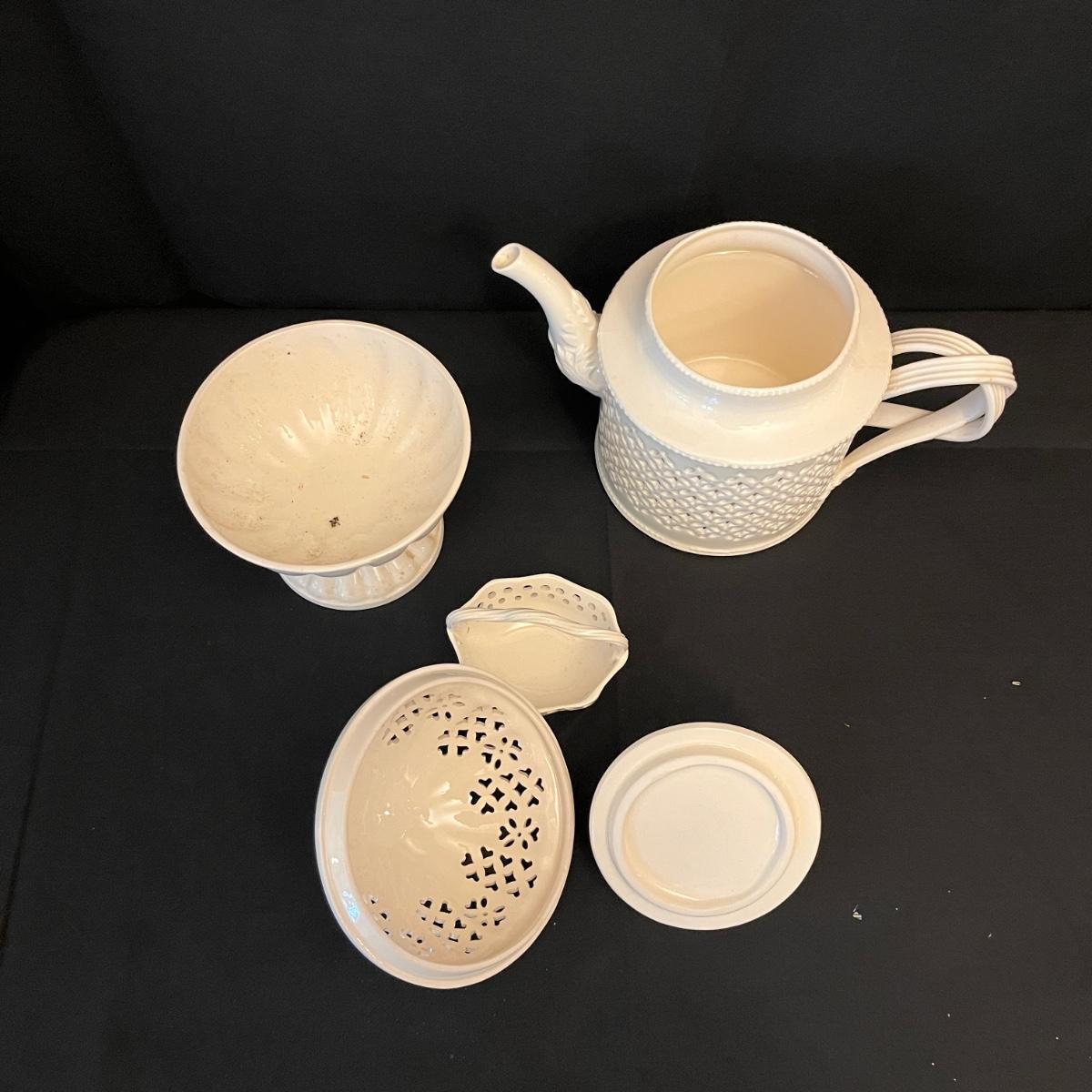 This Classic Leedsware from England Creamware pottery dishes includes six leaf dishes, 12 cups, 11 saucers, three containers with lids, teapot, miniature basket, bowl with lid, two candleholders, two small pitchers, embossed pitcher small and large plates, basket, gravy float with ladle and more. Gravy boat measures 10” x 8.5” x 4.5”H and is missing lid.