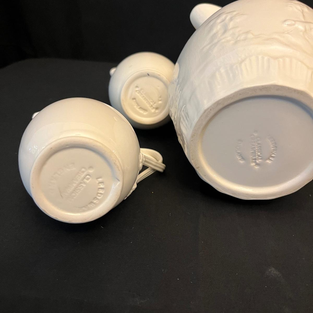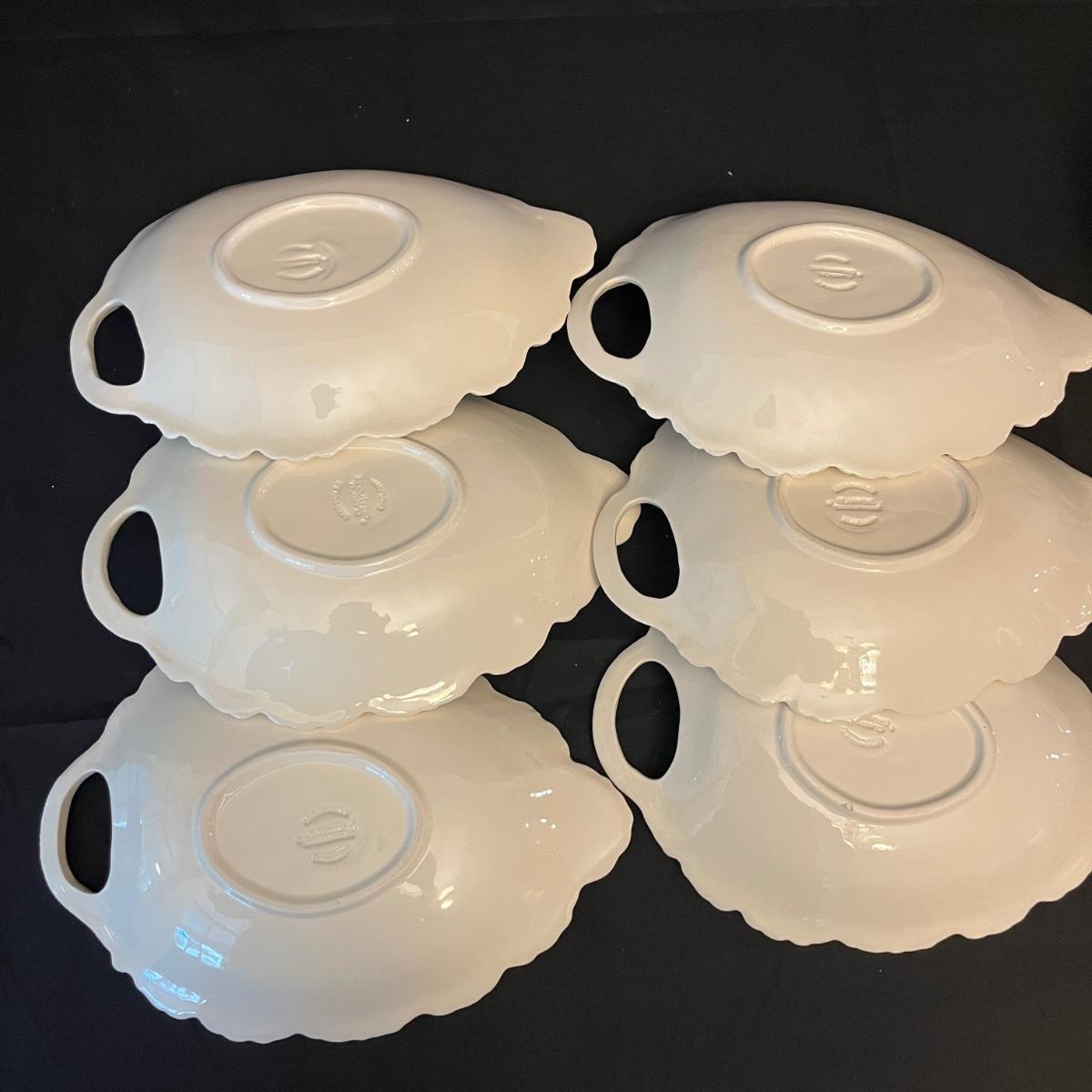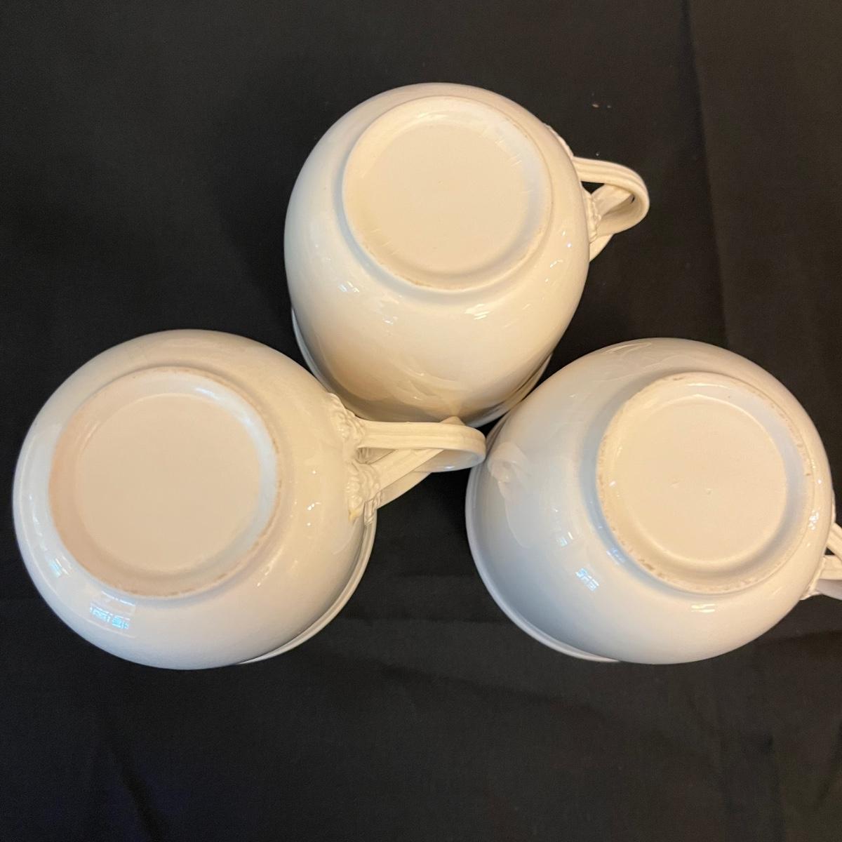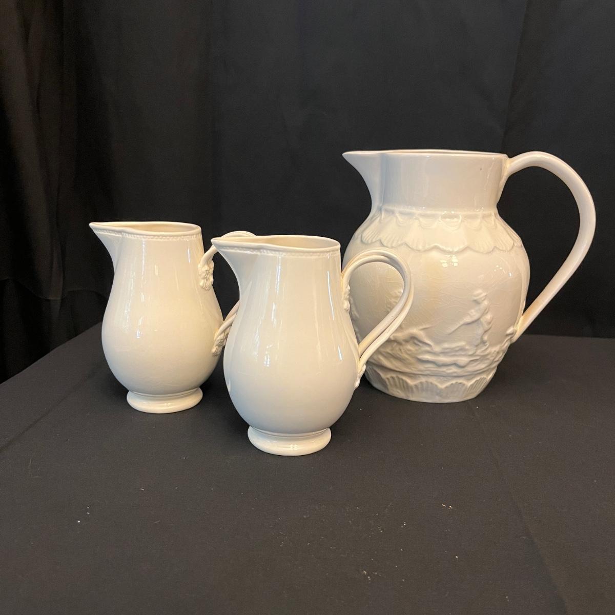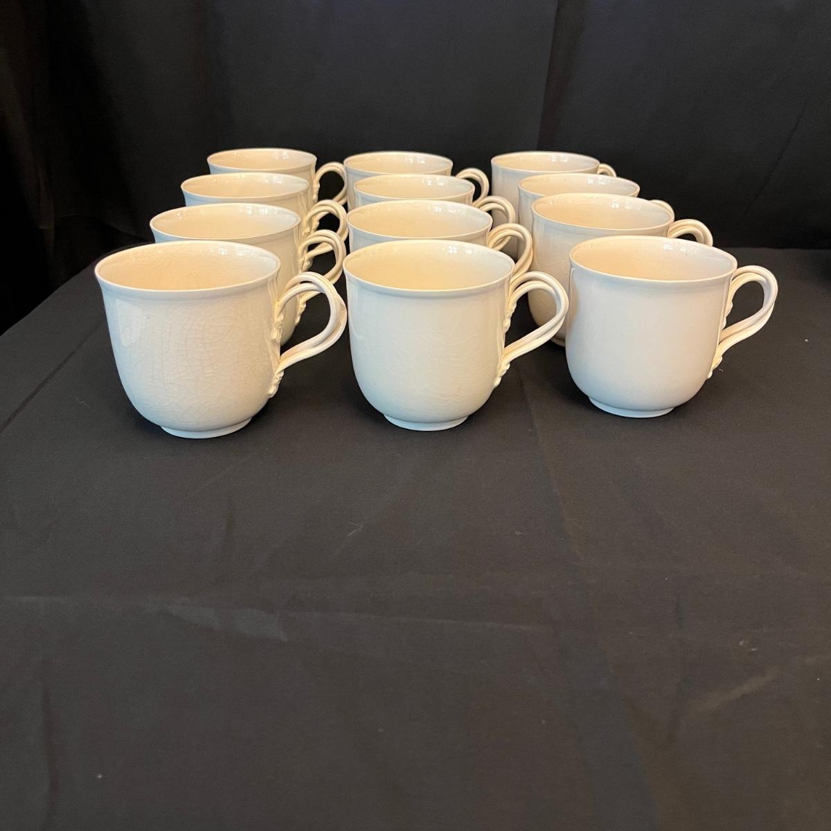 This Classic Leedsware from England Creamware pottery dishes includes six leaf dishes, 12 cups, 11 saucers, three containers with lids, teapot, miniature basket, bowl with lid, two candleholders, two small pitchers, embossed pitcher small and large plates, basket, gravy float with ladle and more. Gravy boat measures 10” x 8.5” x 4.5”H and is missing lid.