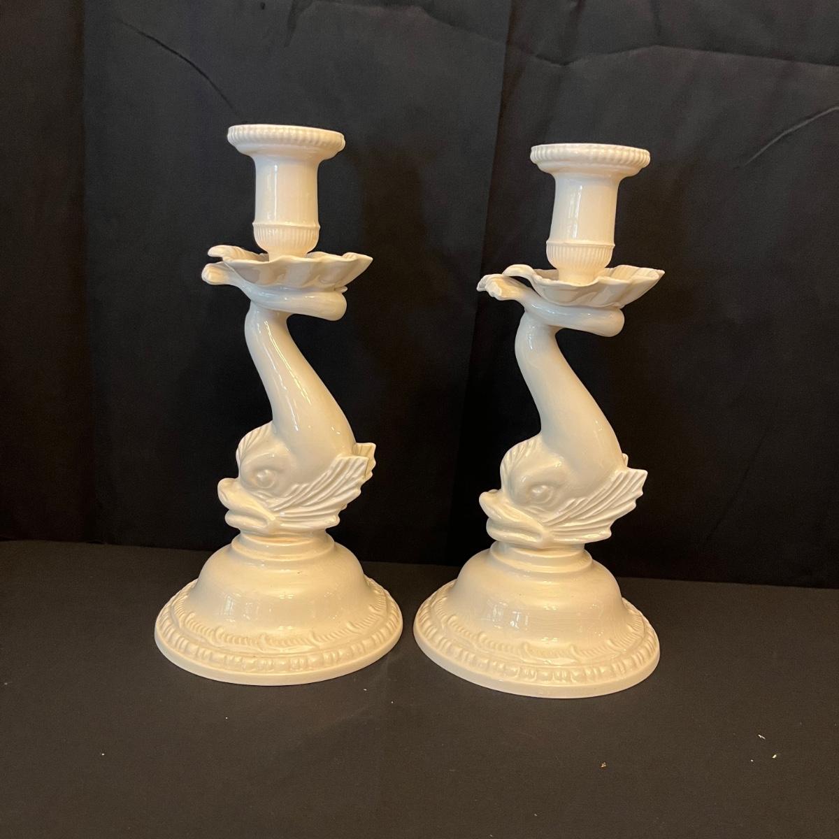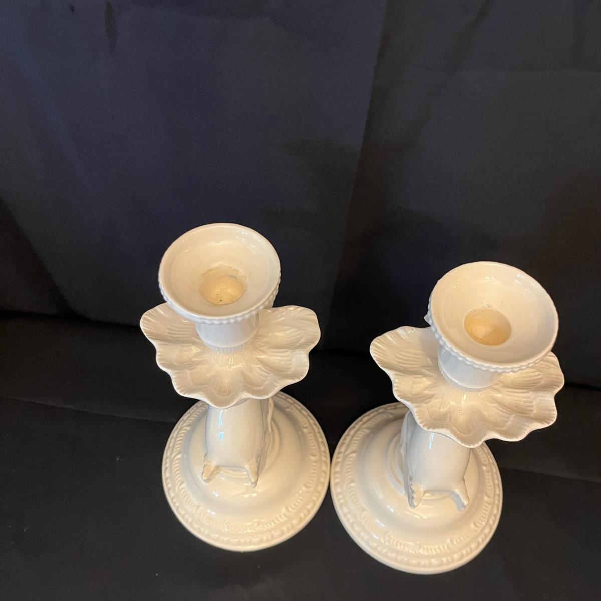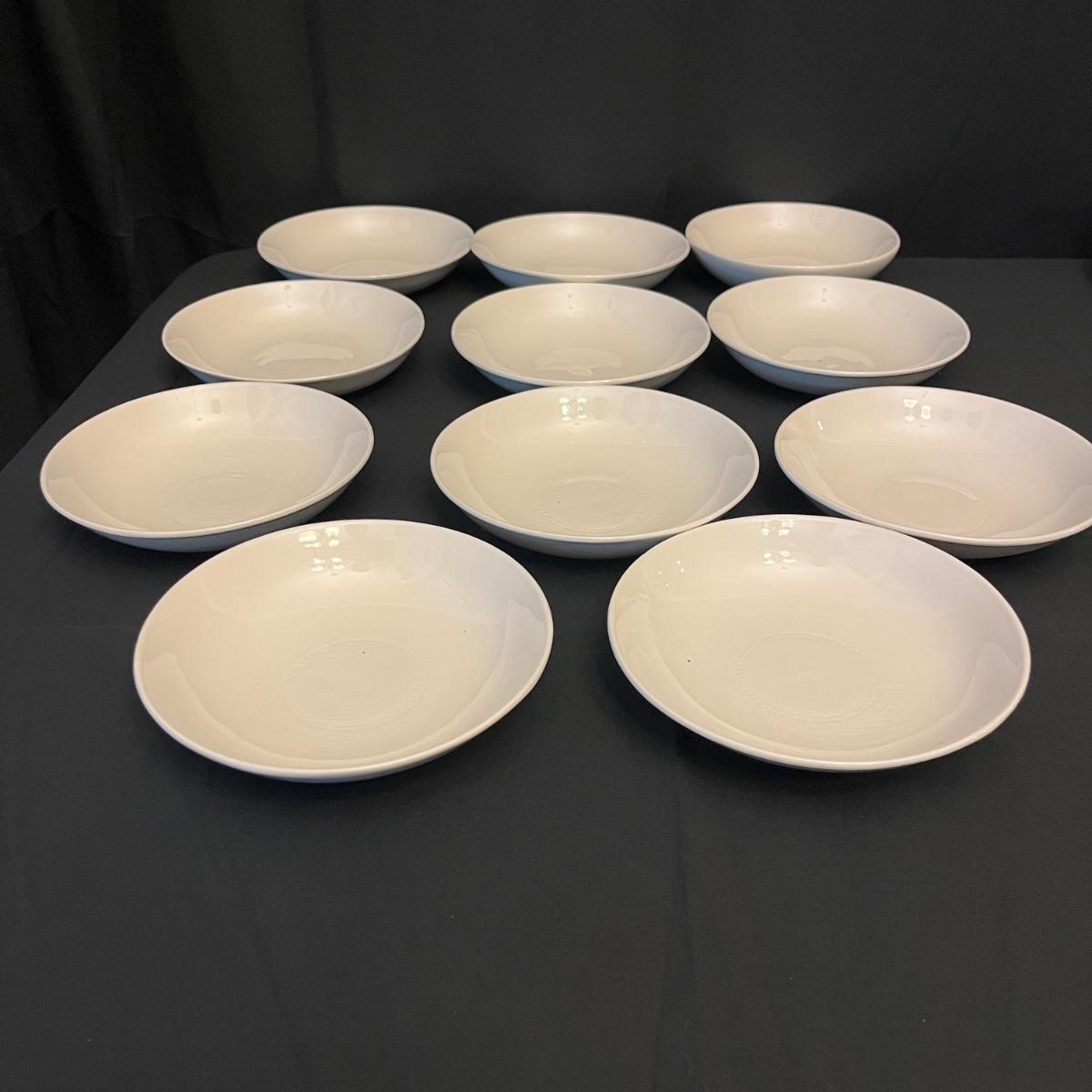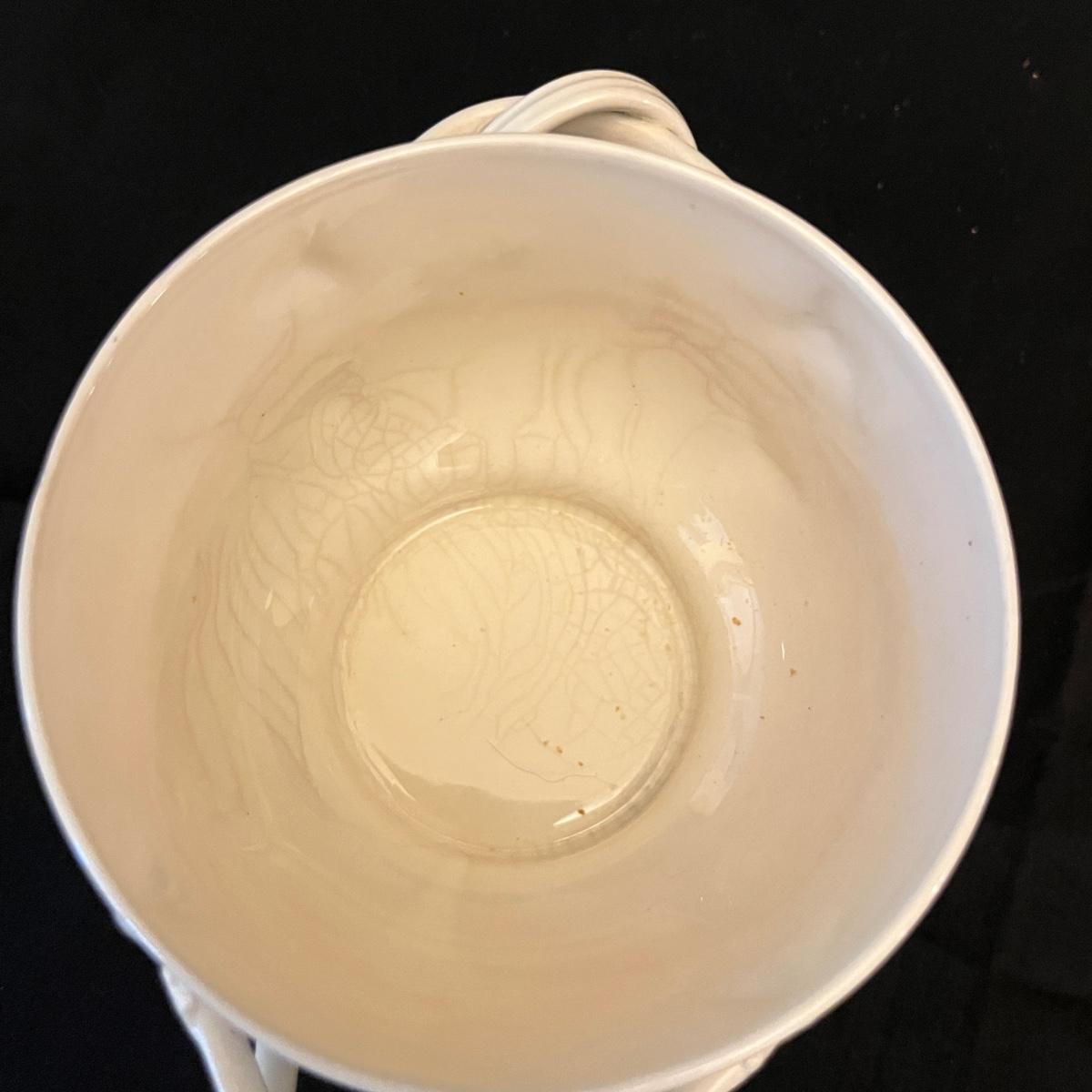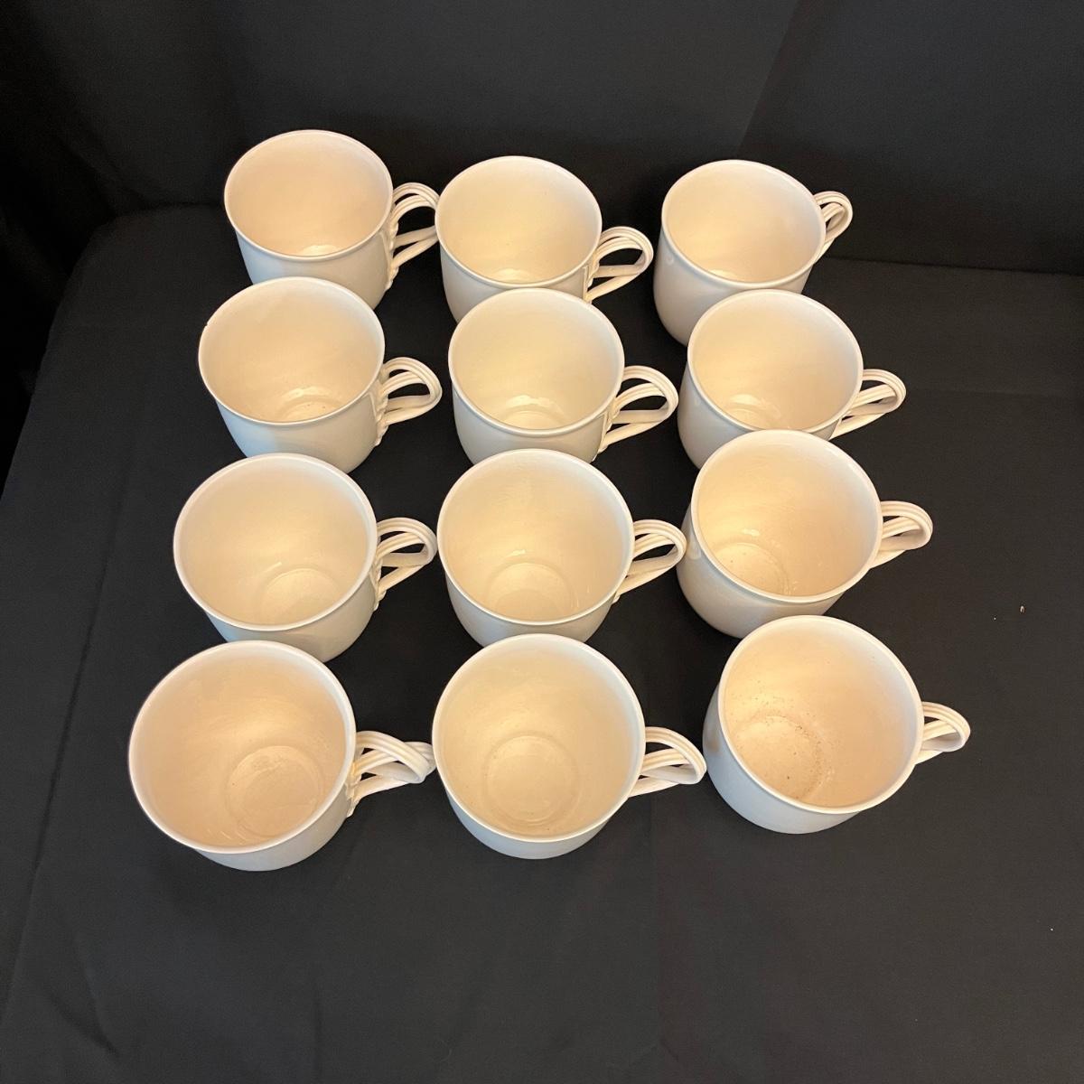 This Classic Leedsware from England Creamware pottery dishes includes six leaf dishes, 12 cups, 11 saucers, three containers with lids, teapot, miniature basket, bowl with lid, two candleholders, two small pitchers, embossed pitcher small and large plates, basket, gravy float with ladle and more. Gravy boat measures 10” x 8.5” x 4.5”H and is missing lid.
