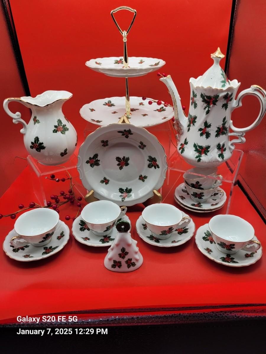 6 cups with saucers, coffee pot, pitcher (5 1/2"), 7 " bread plate, 2 tier tidbit tray, bell