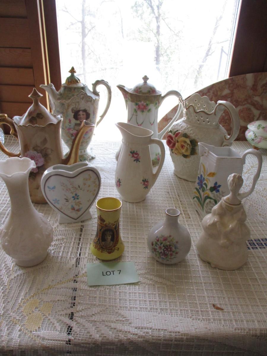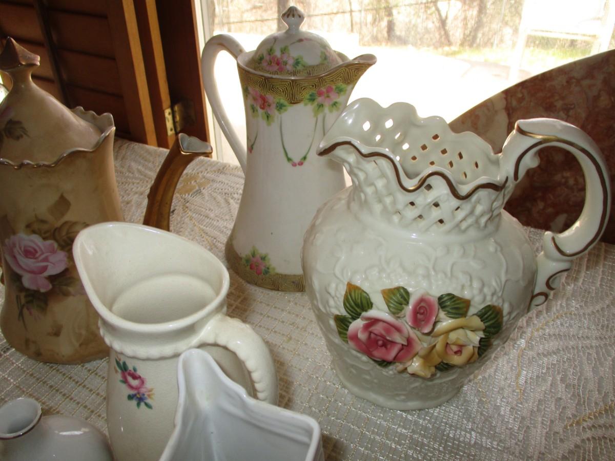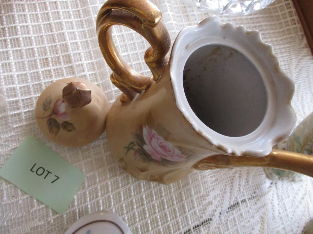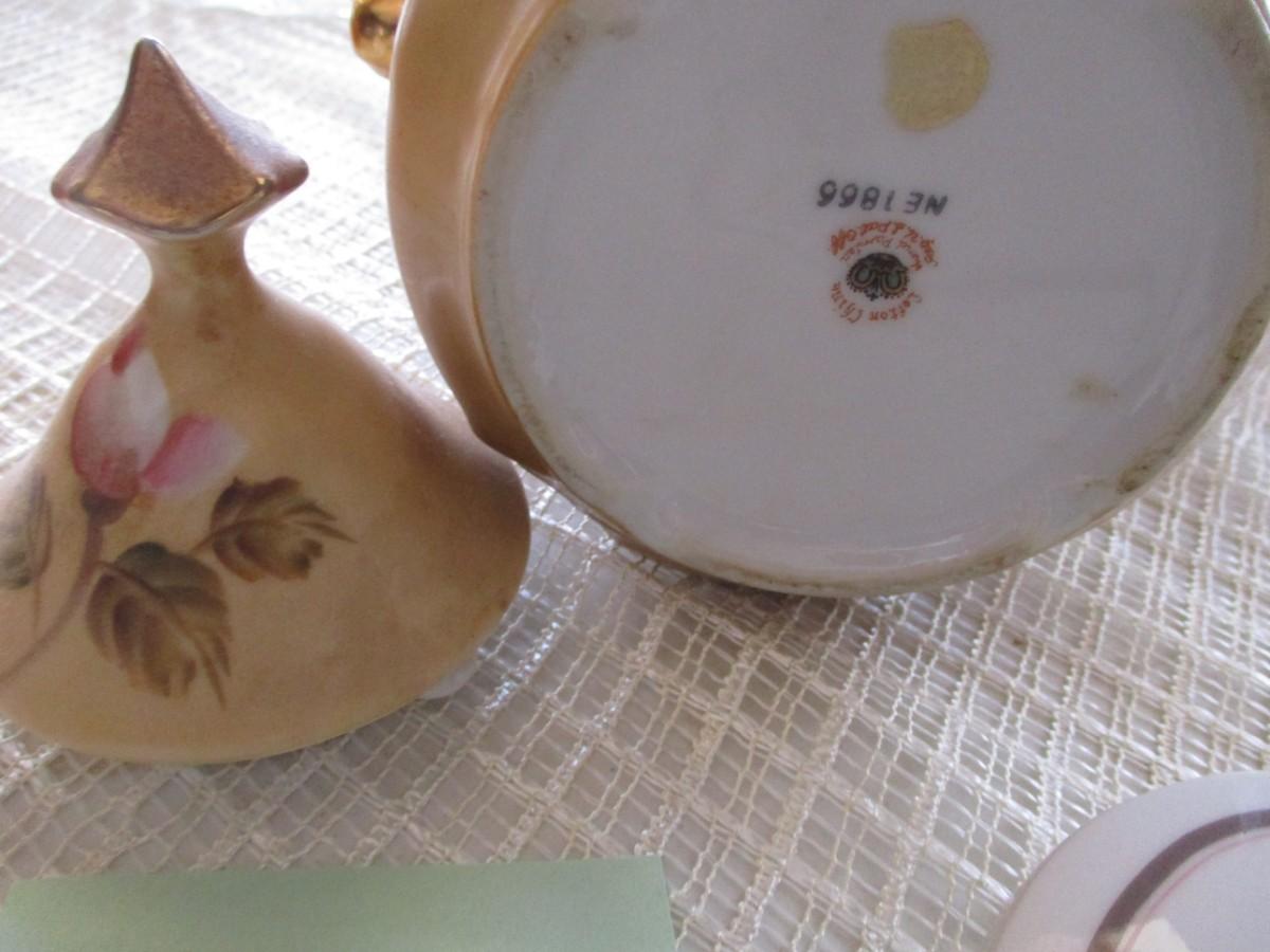 Lefton Tan & Gold Coffee/Tea Pot. Hand Painted Nippon vase. White/pink & Gold Imperial Milkglass Vase. Small yellow vase-- Royal Winton England