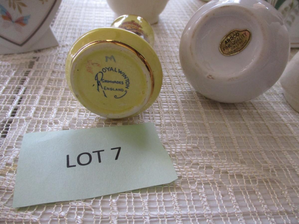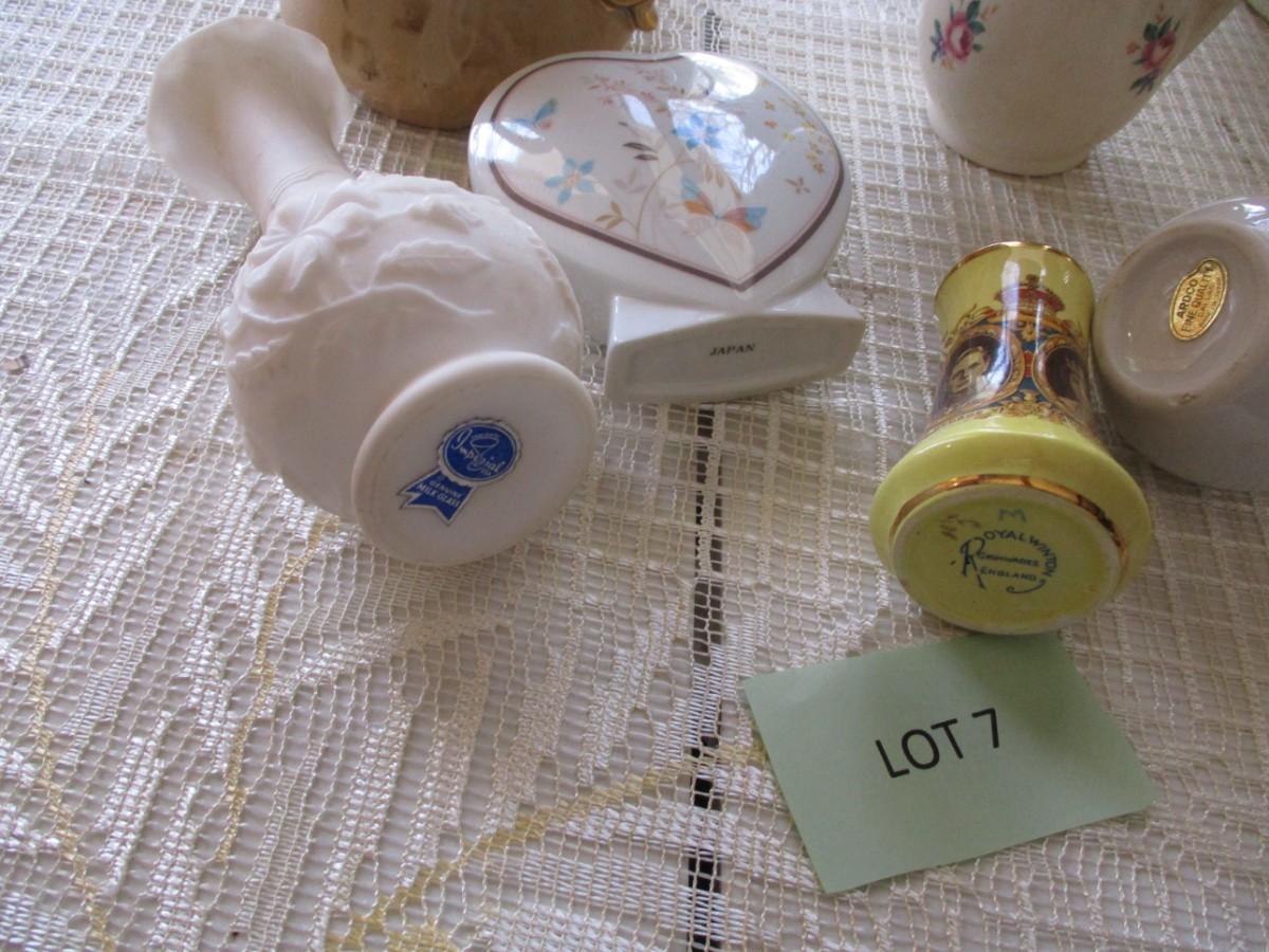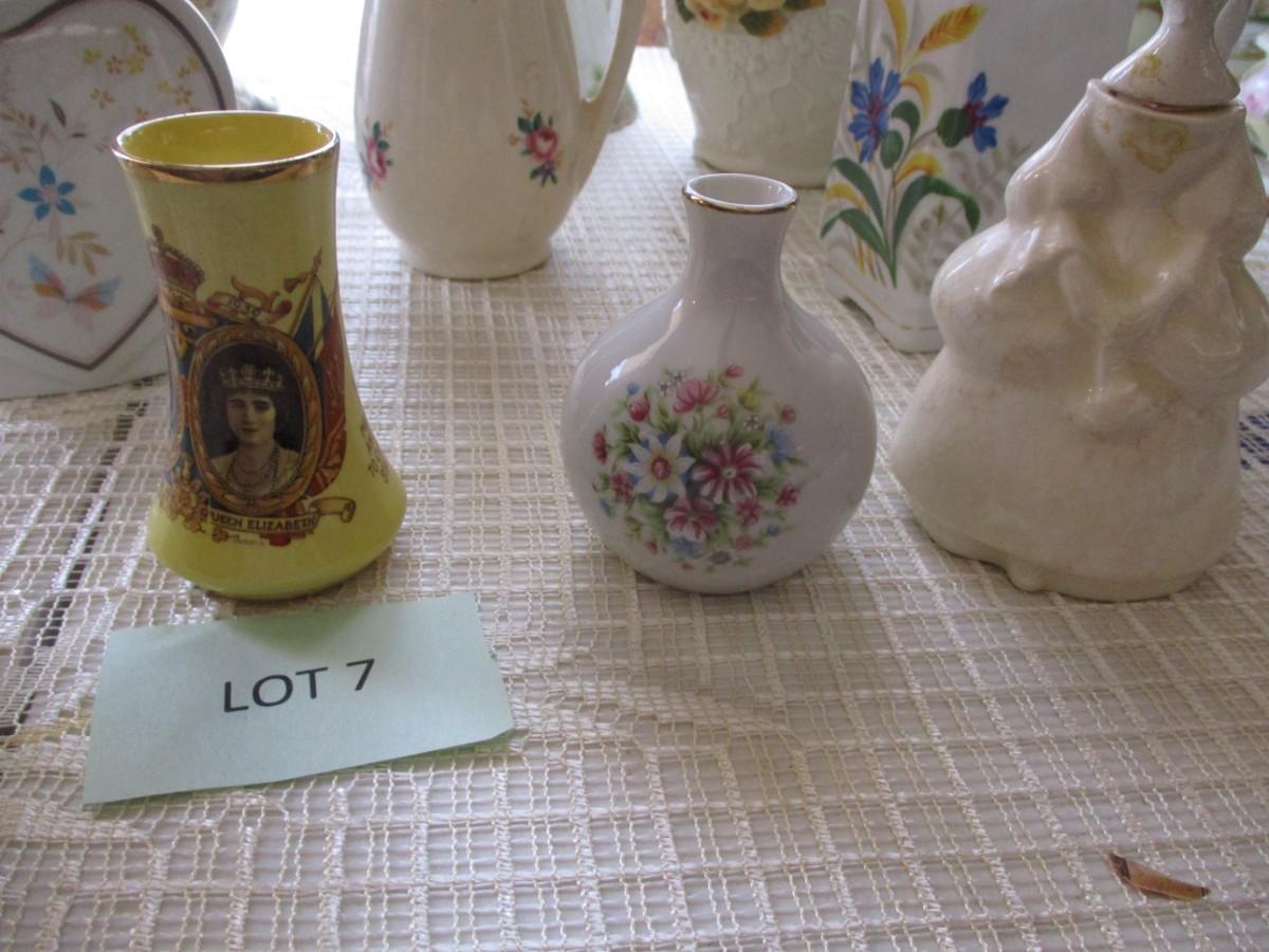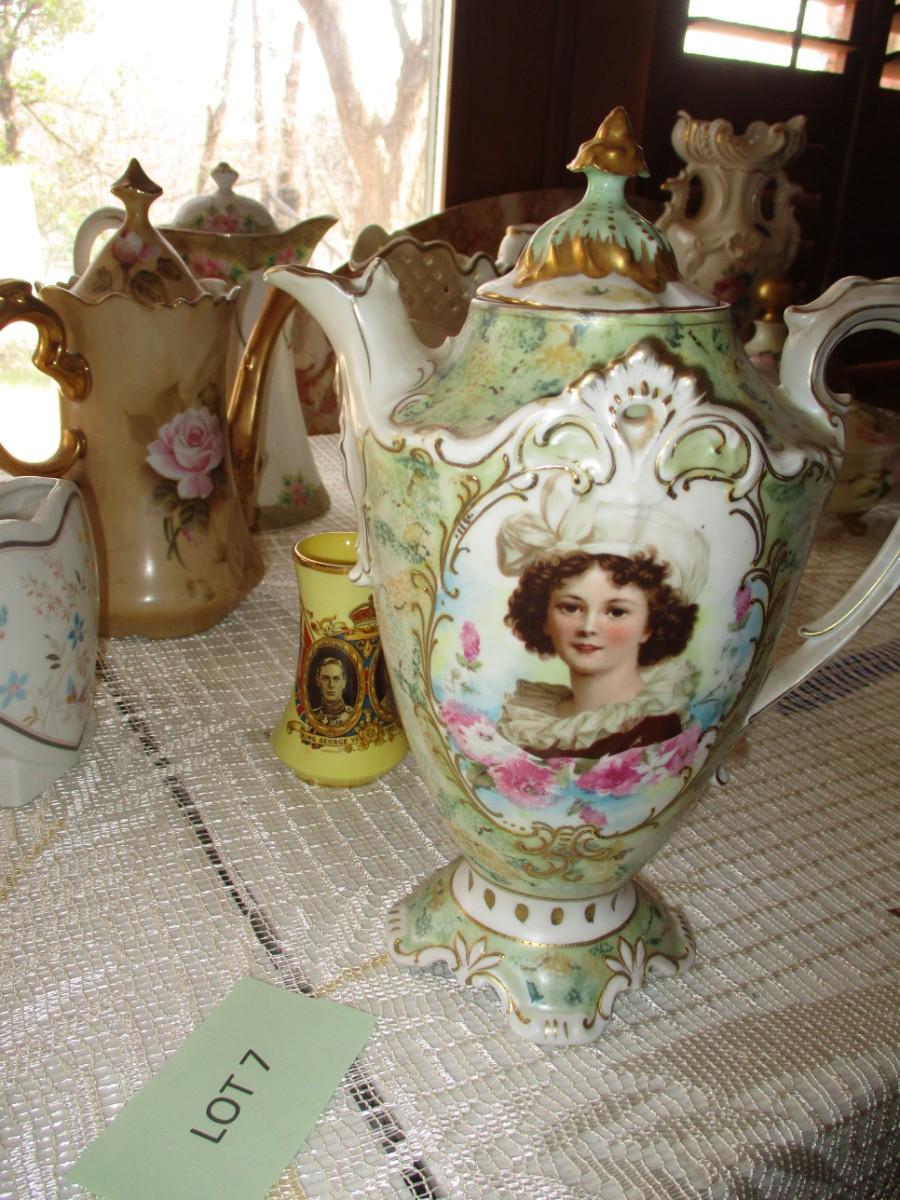 Lefton Tan & Gold Coffee/Tea Pot. Hand Painted Nippon vase. White/pink & Gold Imperial Milkglass Vase. Small yellow vase-- Royal Winton England