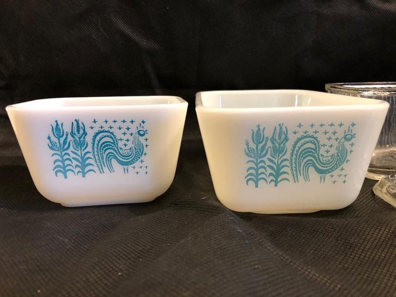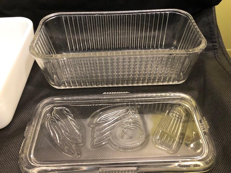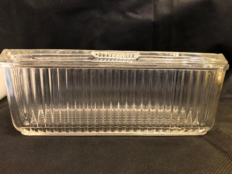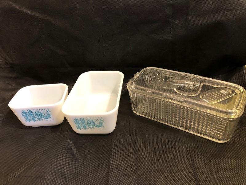 2 vintage pyrex storage container and 1 covered depression glass food storage container large pyrex dish is 6.75 x 4 x 2.75 the small pyrex is 4x3.25x2.5 and the depression glass is 8.5x4.25x3.5 pyrex and depression glass