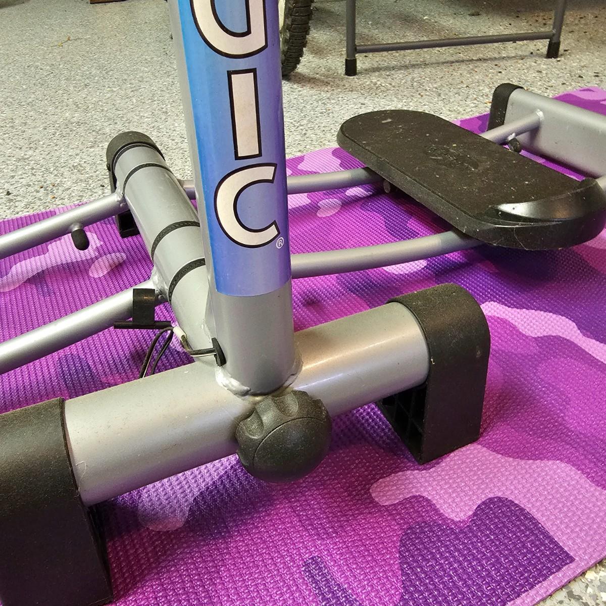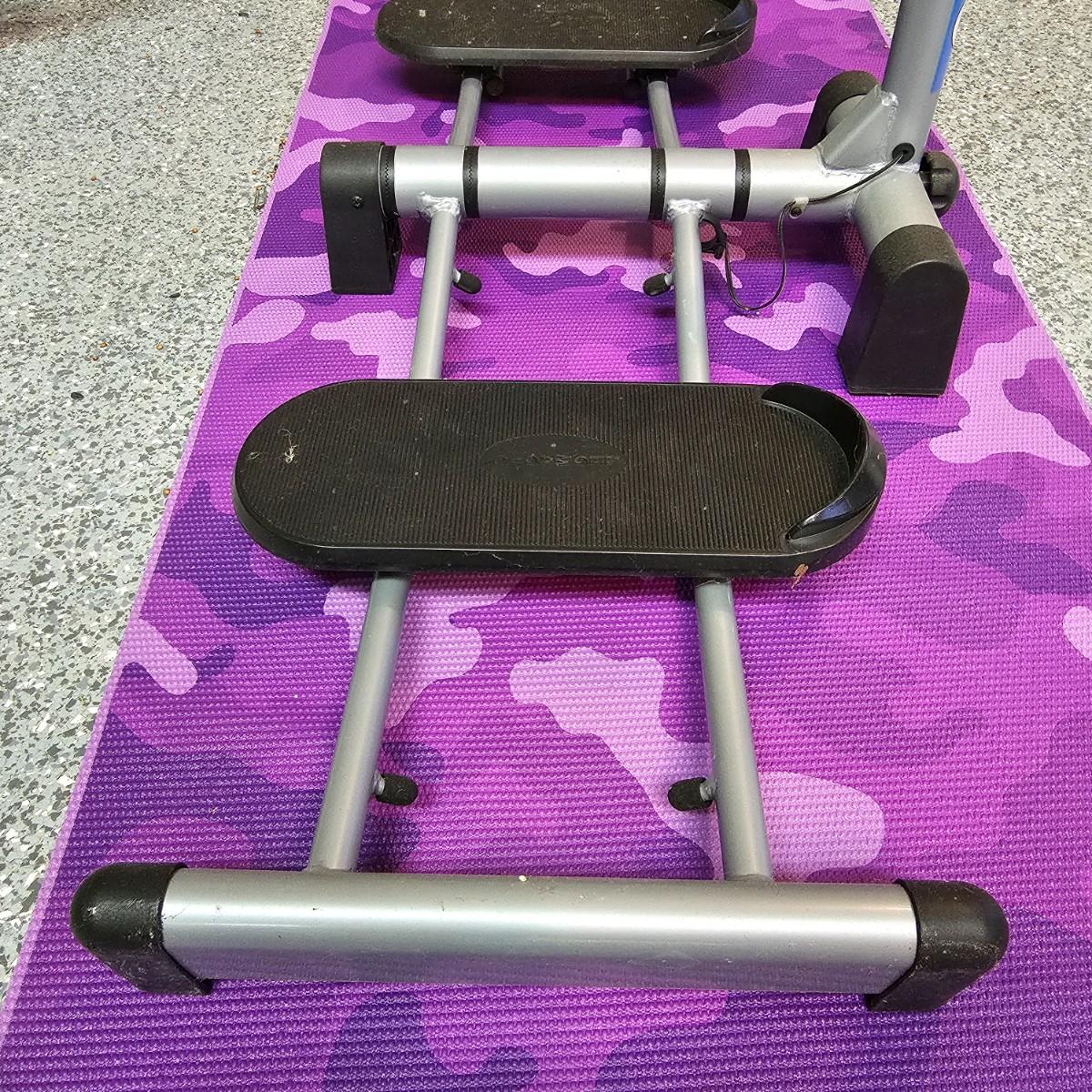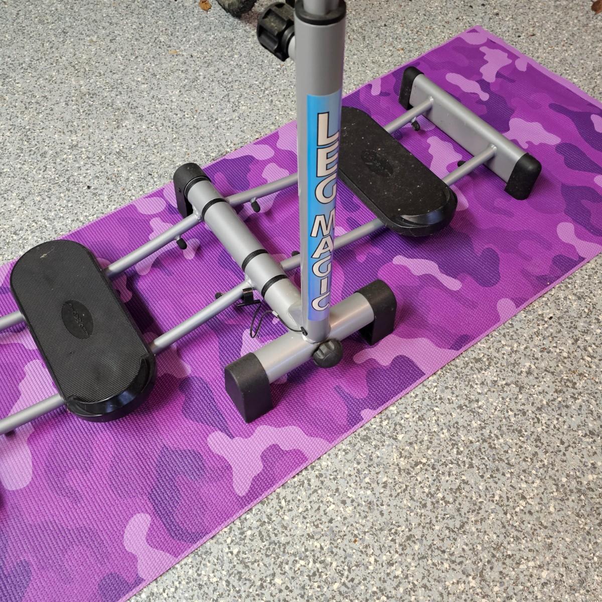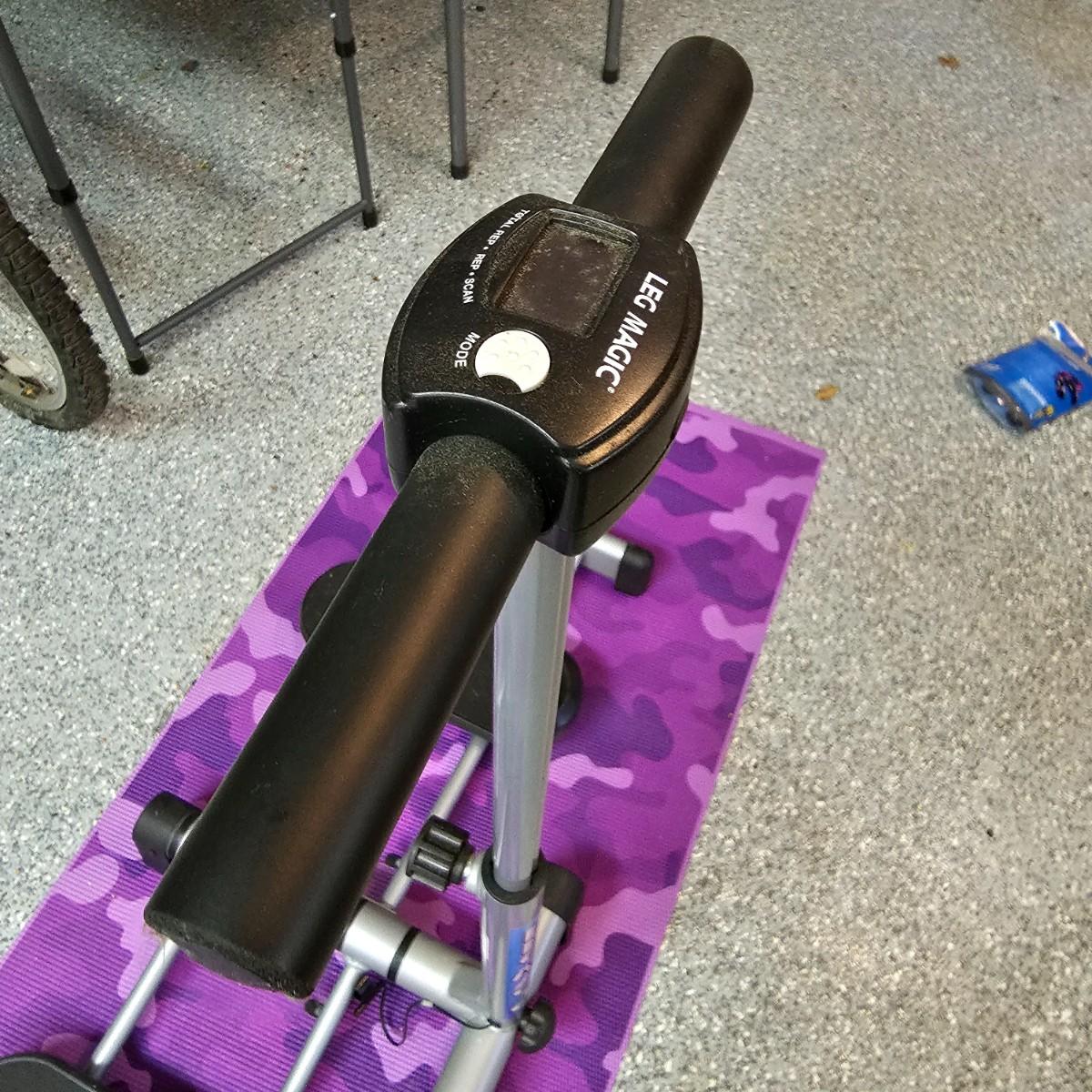 One Leg Magic sliding leg exerciser, one Gaiam mat and one nine foot jump rope. Leg Magic unit is 11"x 18" x 40"h closed, 42" x 18" x 40"h open. The monitor would need batteries and was not tested. Handle height is adjustable. Base mat is 24" x 68". . See photos for details. Local pickup only.