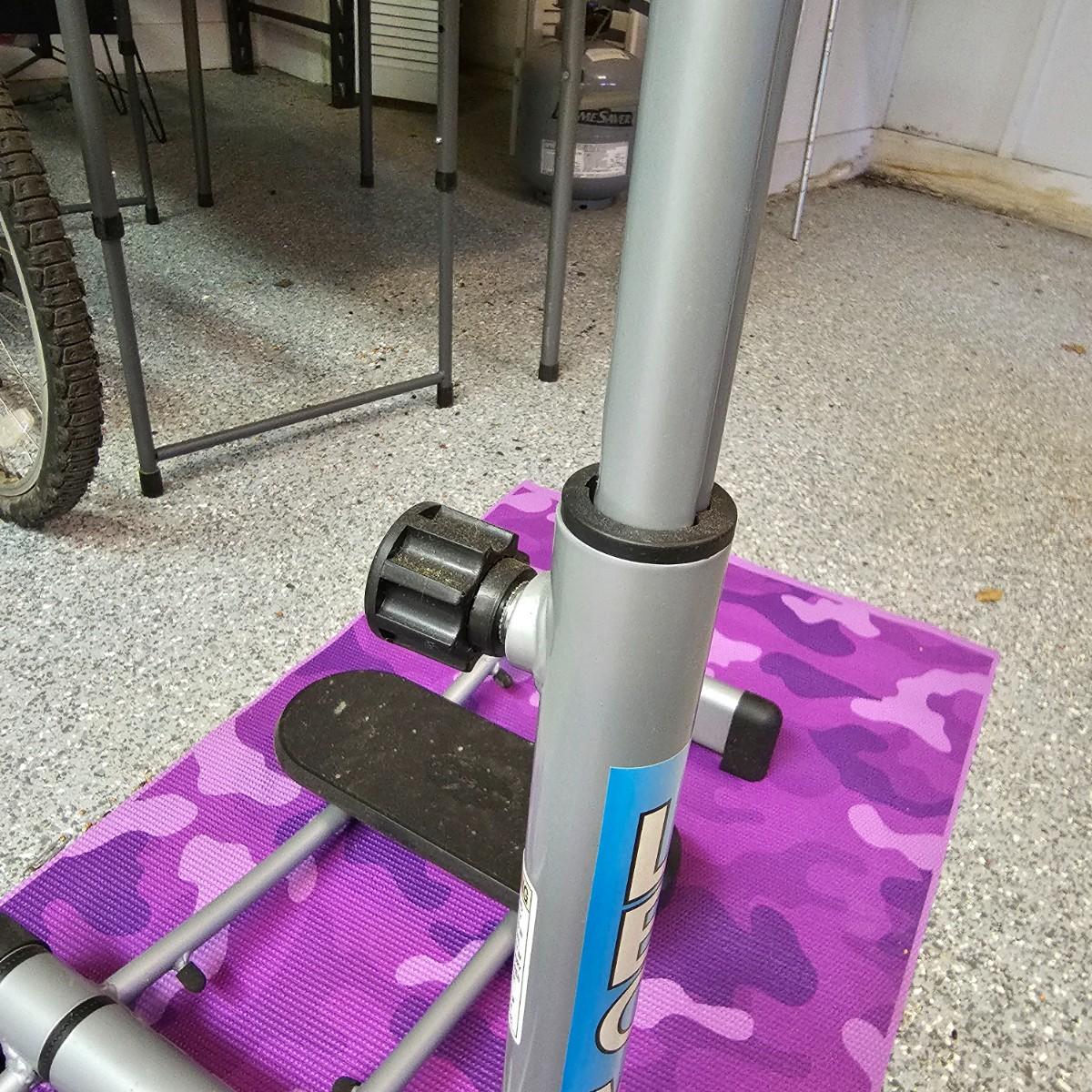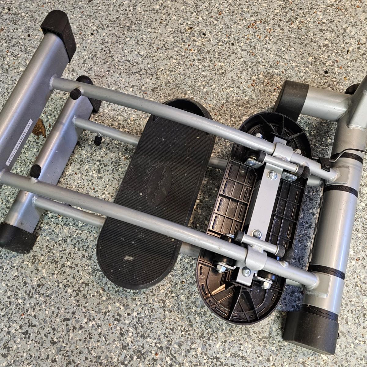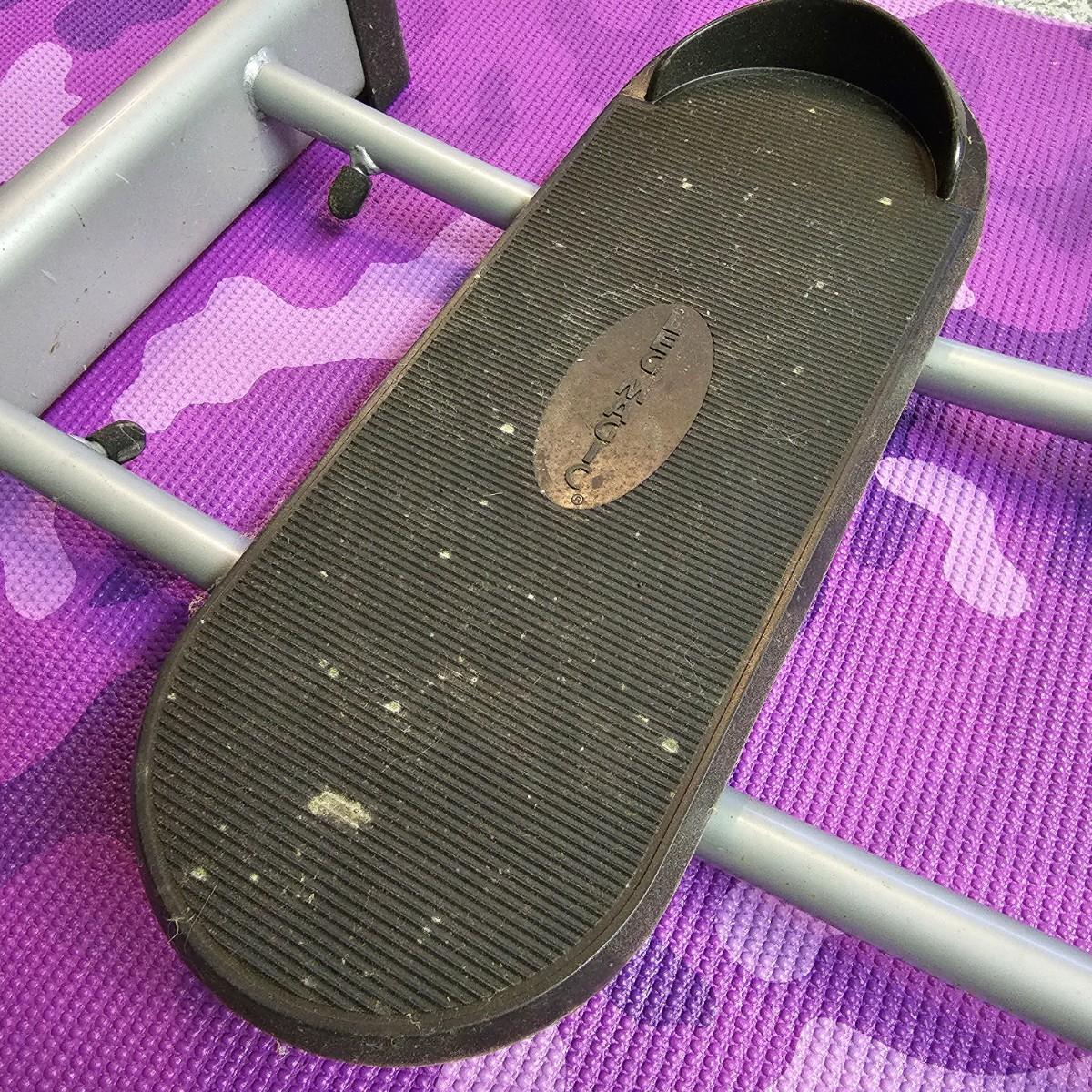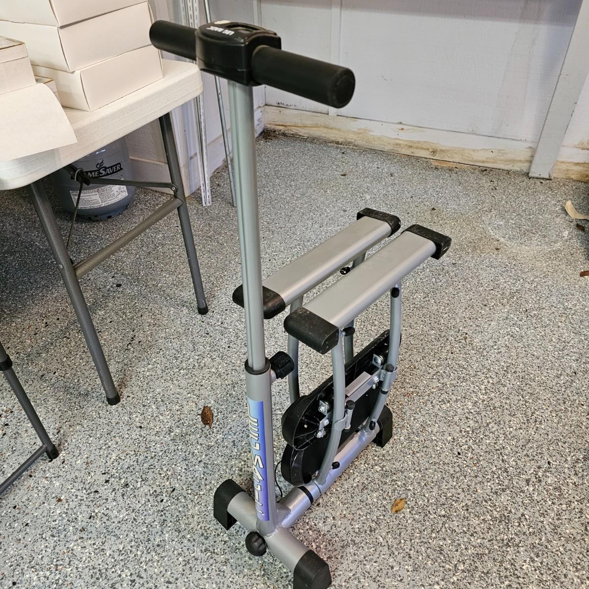 One Leg Magic sliding leg exerciser, one Gaiam mat and one nine foot jump rope. Leg Magic unit is 11"x 18" x 40"h closed, 42" x 18" x 40"h open. The monitor would need batteries and was not tested. Handle height is adjustable. Base mat is 24" x 68". . See photos for details. Local pickup only.
