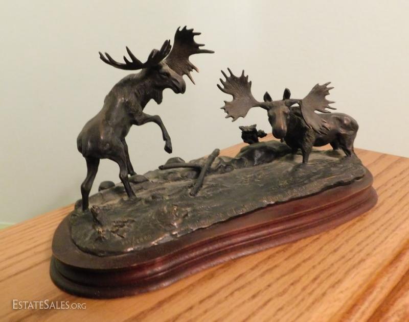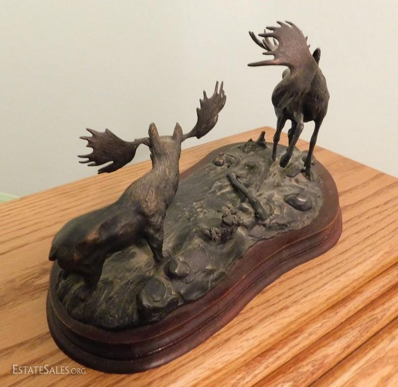 Bronze statue by Legends entitled 'Two is a Crowd' with some damage to the antlers of each moose. Some bending where antler meets the head.