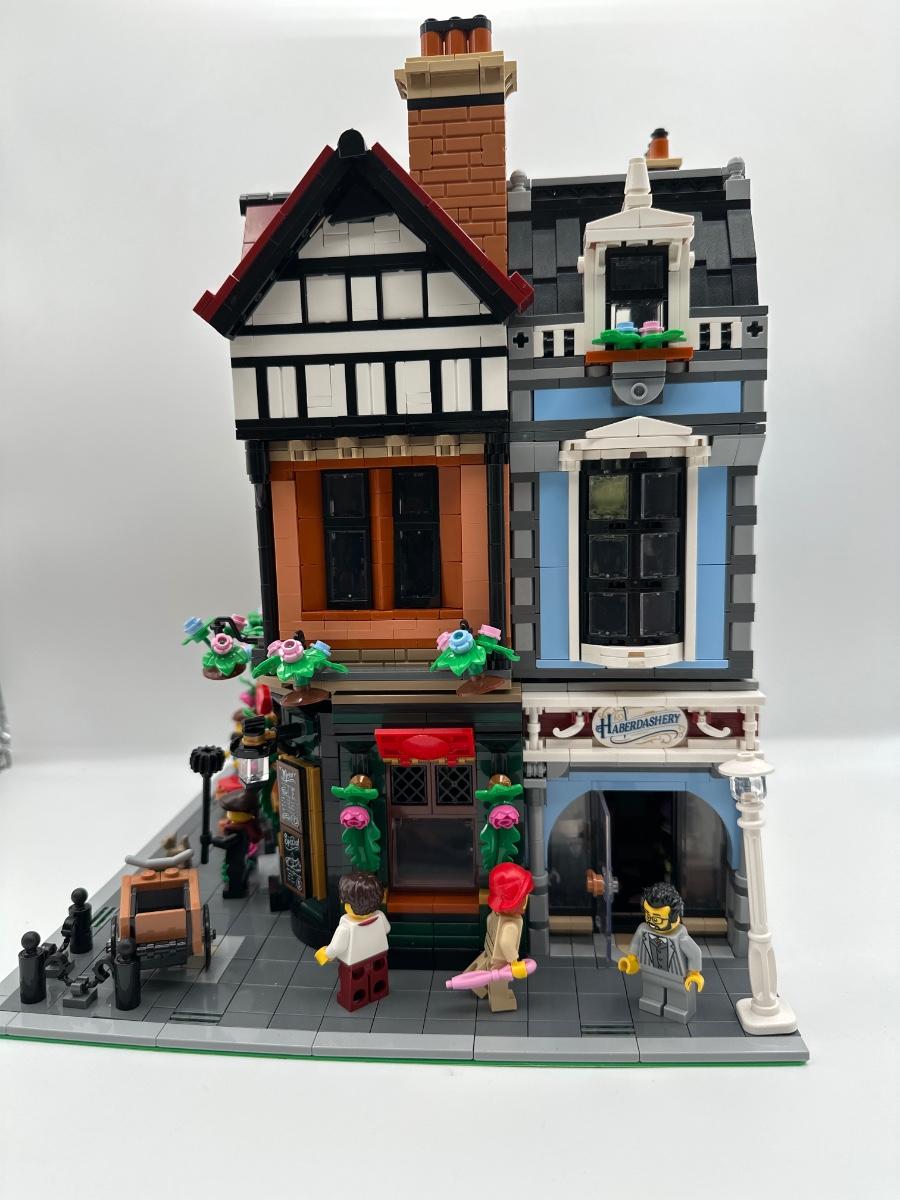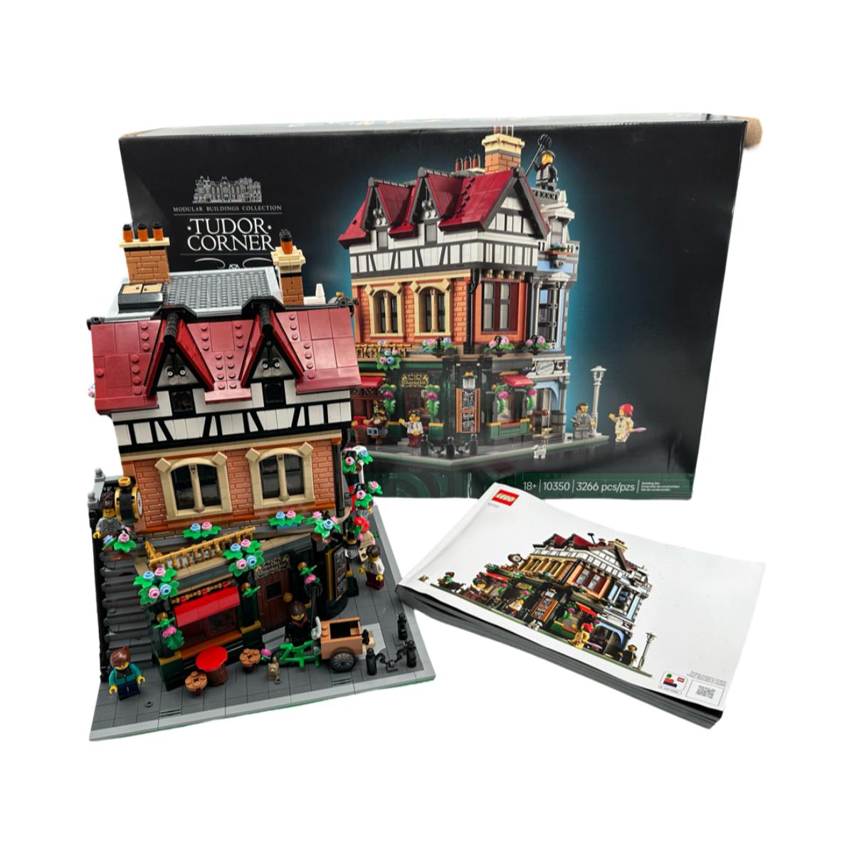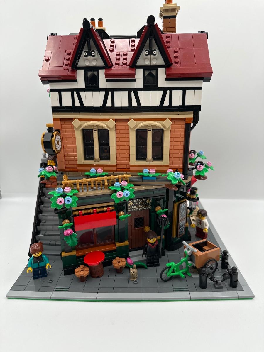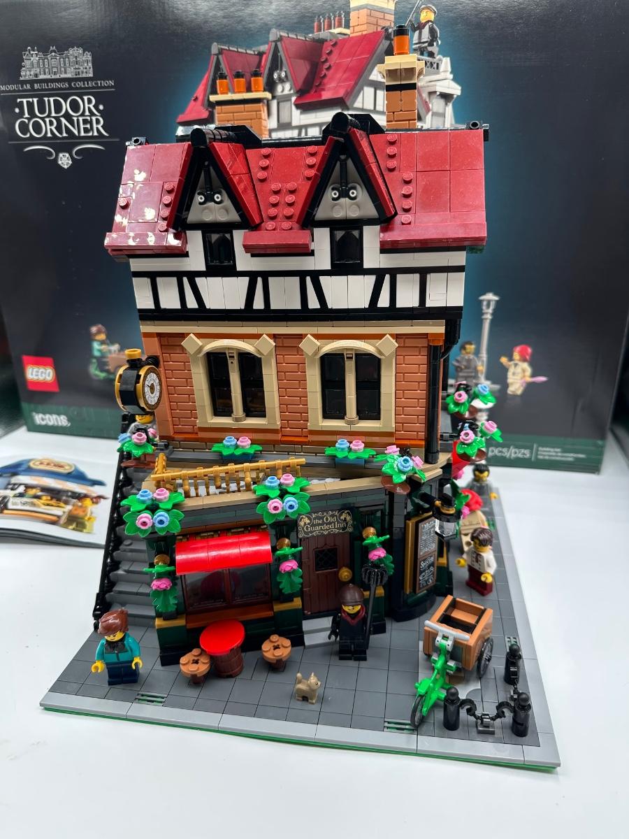 Complete Tudor Corner (Set 10350, 3266 pcs) – fully built with detailed street-level pub “The Old Guarded Inn,” upper apartments, and rooftop garden details.