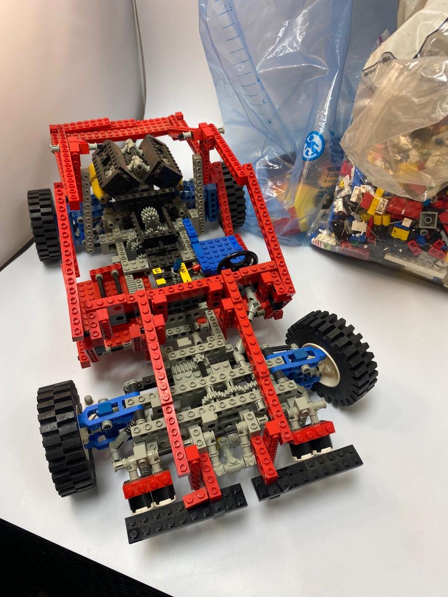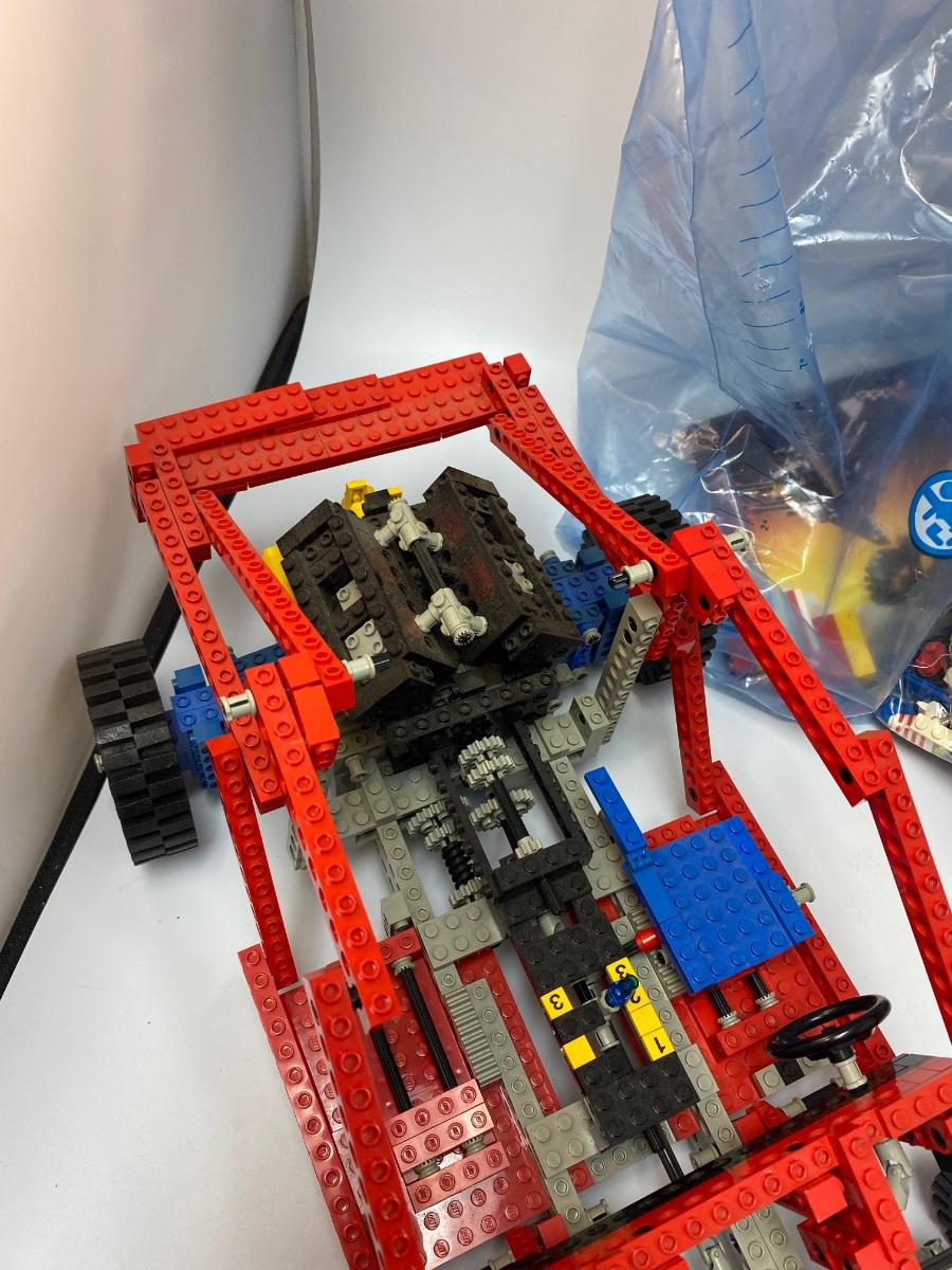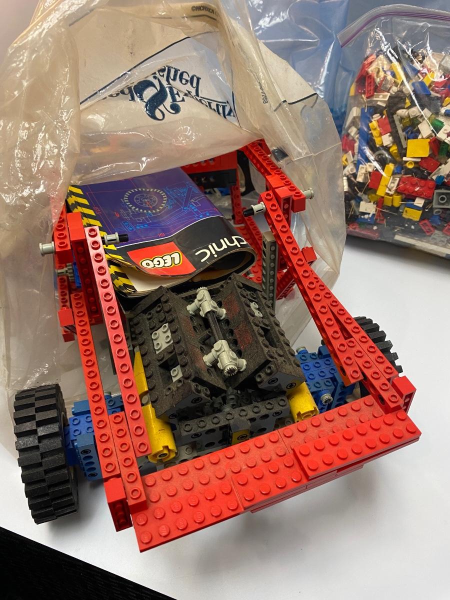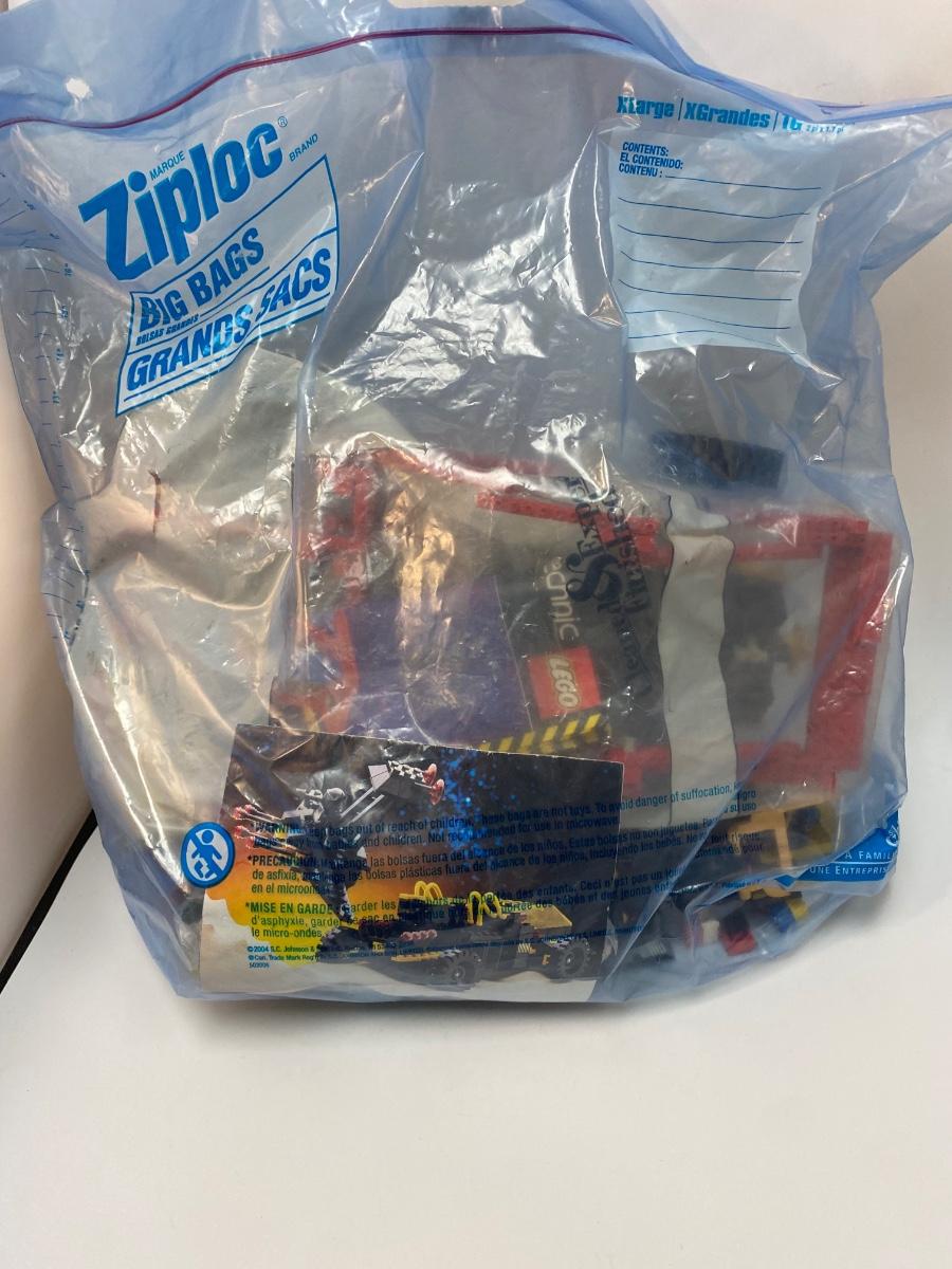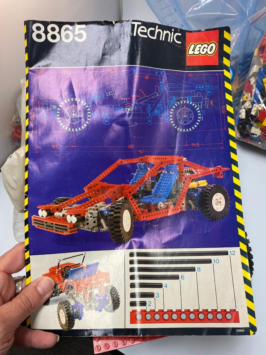 LEGO Technic Go Cart Buggy Set 8865 with Gallon Bag of Extras. Buggy is pretty built, not sure what pieces are not attached or missing, there are loose pieces in bag. Included is a gallon sized ziploc bag full of Legos. Technic set does have building manual included.