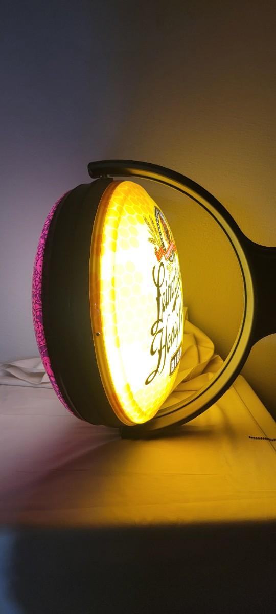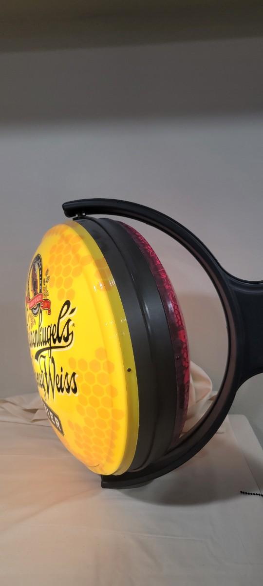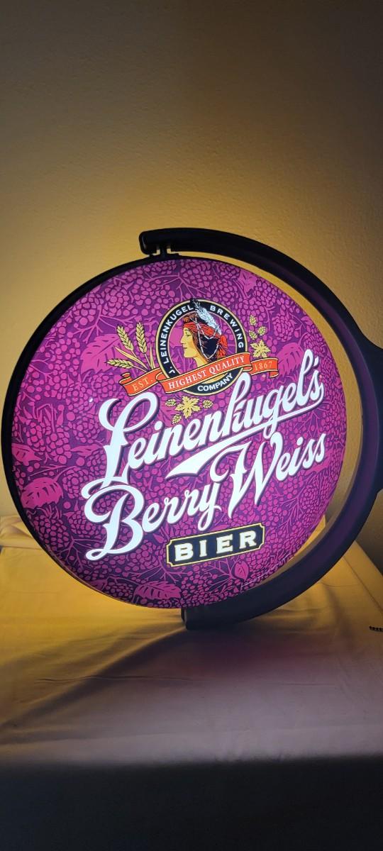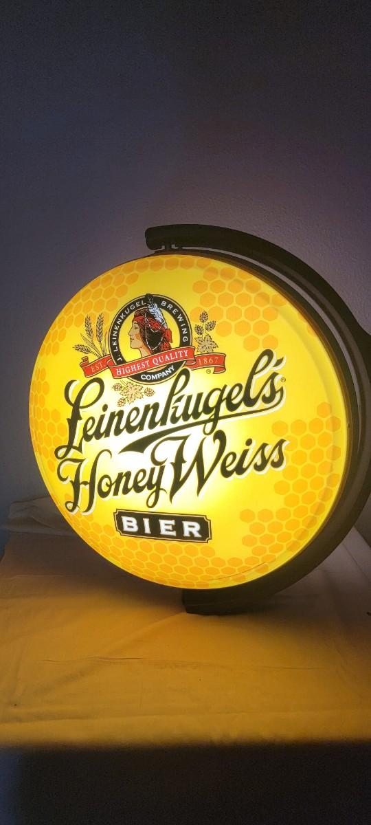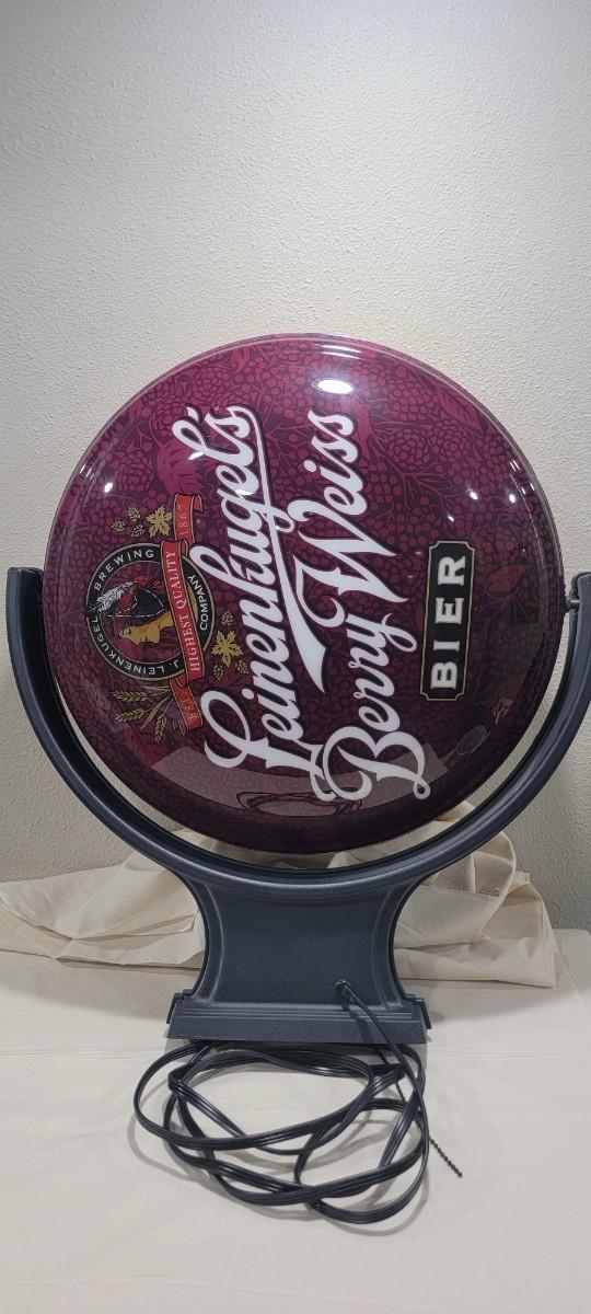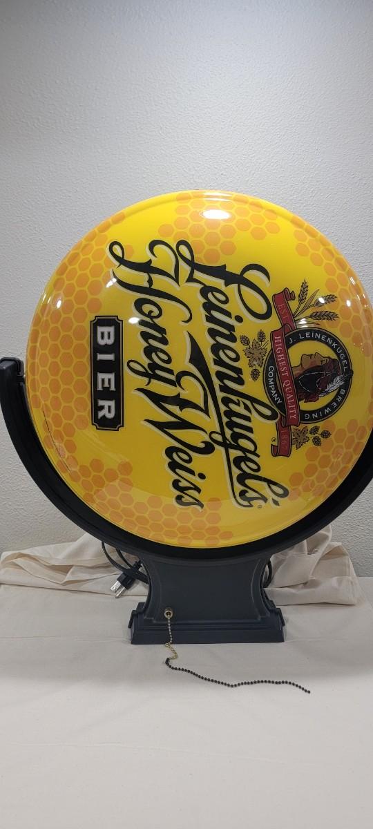 Really cool Leinenkugel Brewery, Chippewa Falls Wi rotating globe light. 18"D, size with mount to wall 23.5". Great condition! Two sided bubble face, Indian Princess logo on both sides.