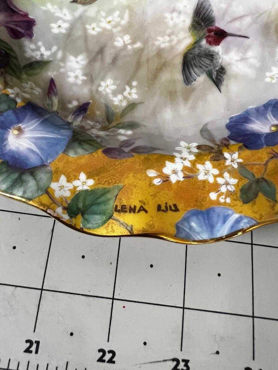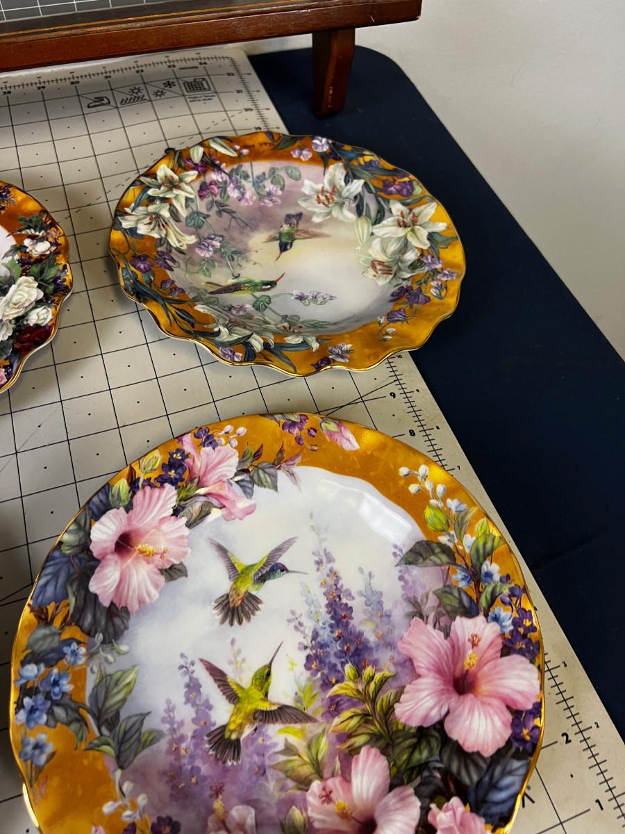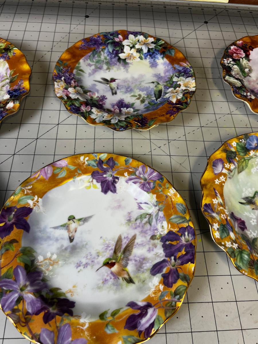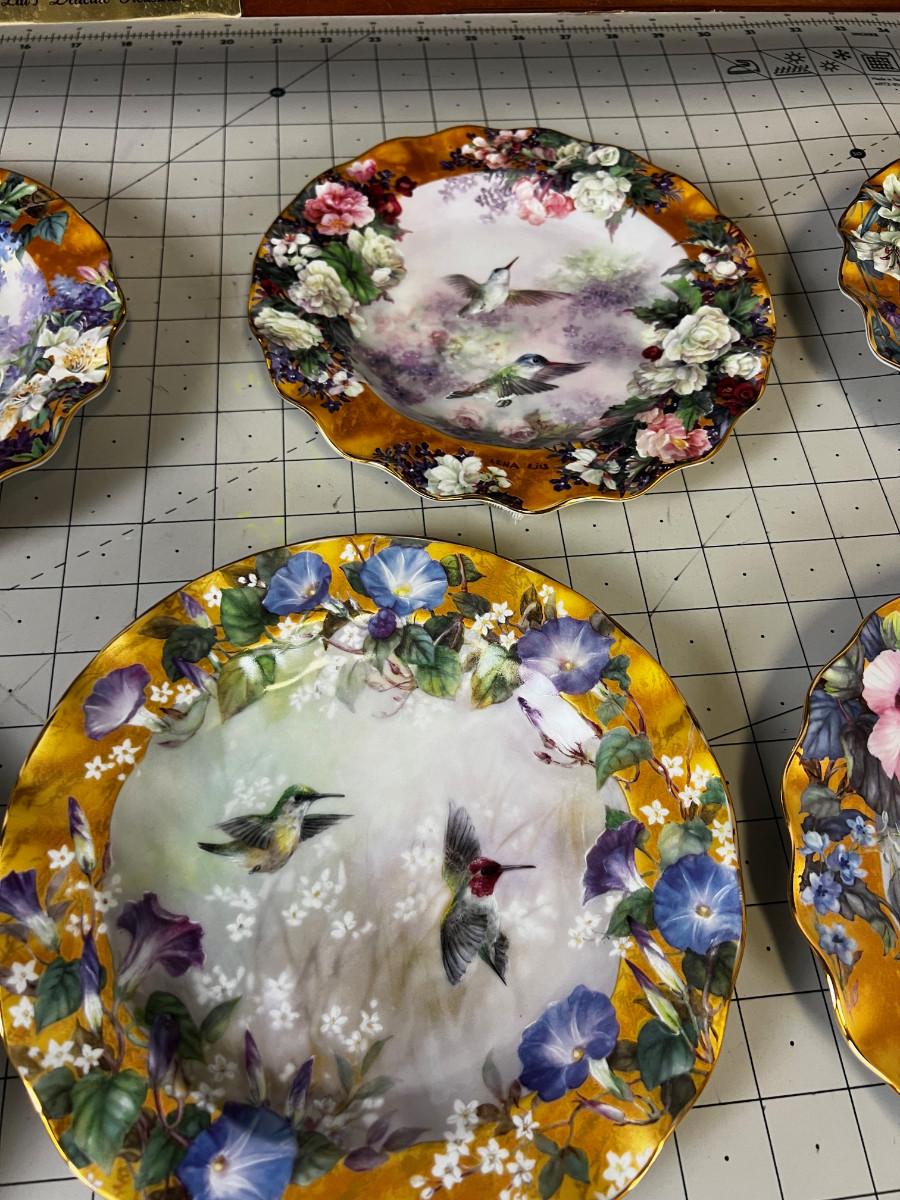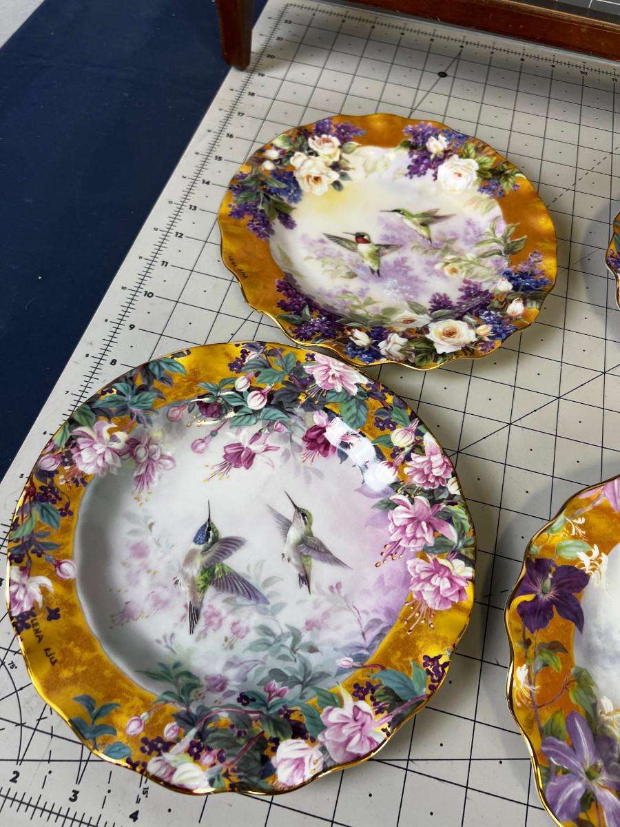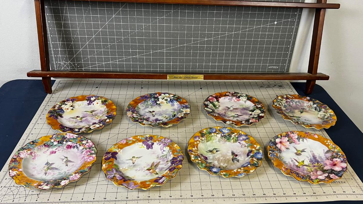 Lena Liu and Delicate Treasures 8 Plates with Hummingbirds and the Shelf