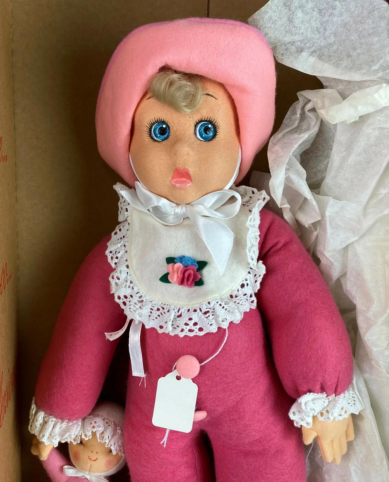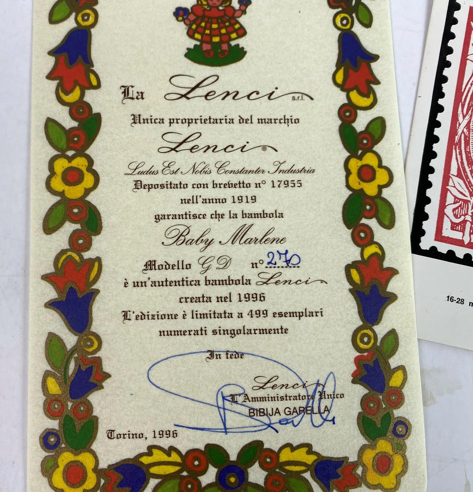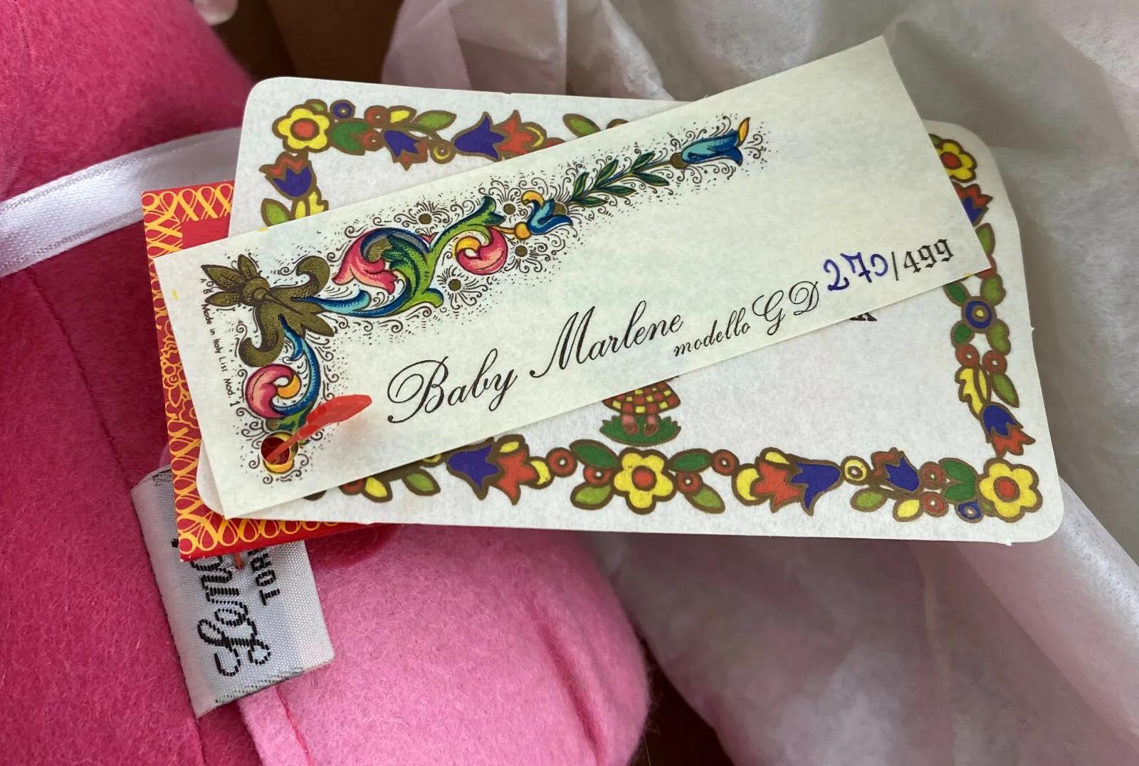 Here is a beautiful felt LENCI doll. Handmade in Torino, Italy..1996..Limited edition #270 of 499. Baby Marlene is all original and is in excellent condition in the original box with attached tags...and a small attached doll...18" tall“🦆