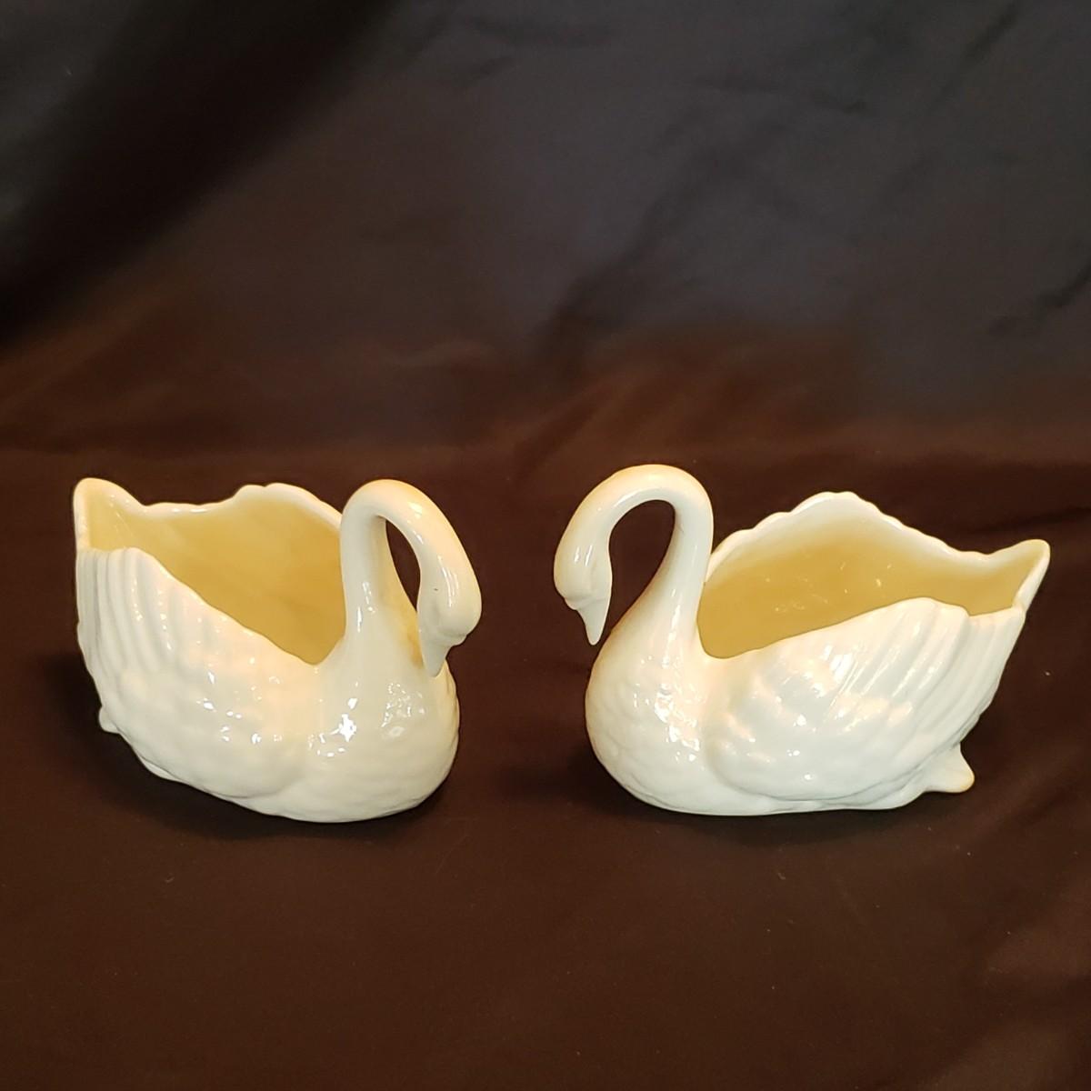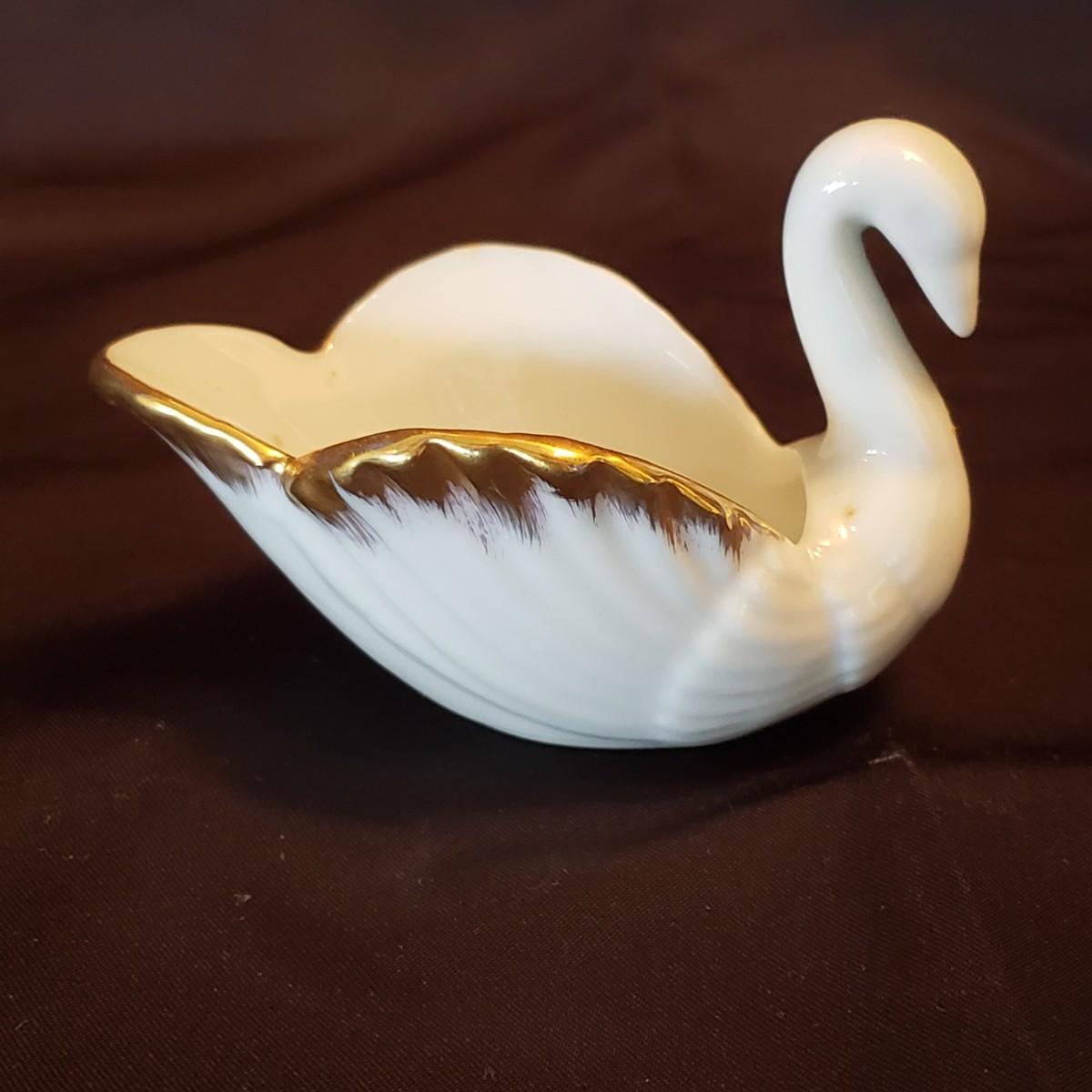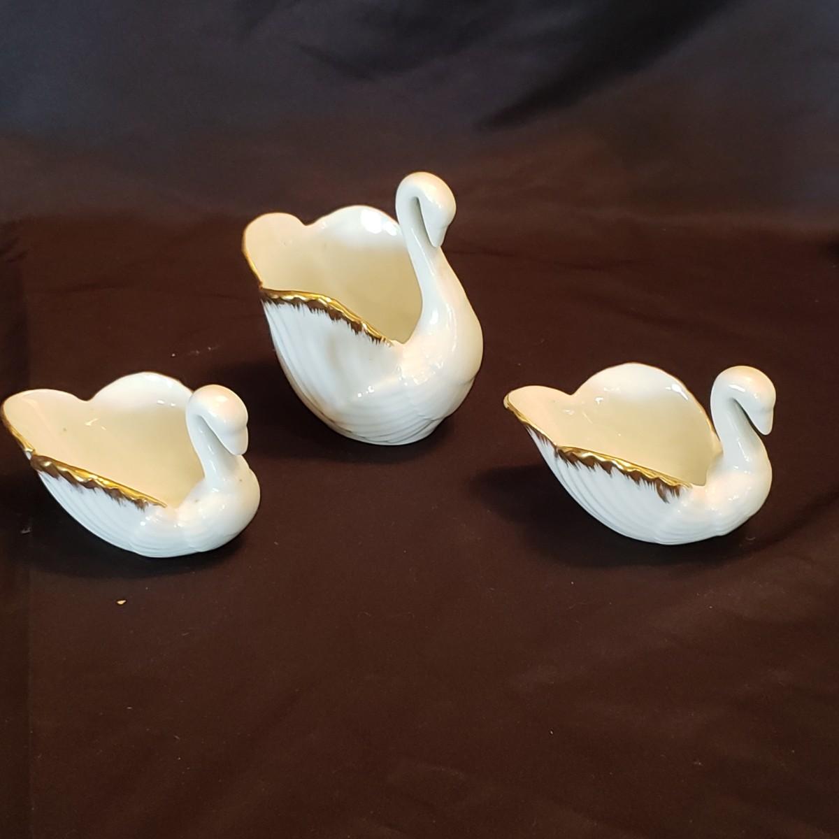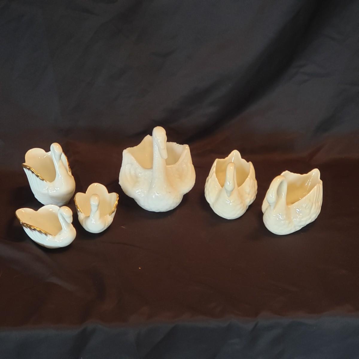 This lot features five porcelain swans and one glass swan.. The two Lennox swans measure 3" x 3" x 2" H and the larger one measures 3" x 2" x 4" H. The Meinsenthal glass swan measures 6" x 4" x 6" H. This piece has a crack along one side, see pictures for details. The two matching Lennox swans measure approximately 4" x 3" x 3" H.