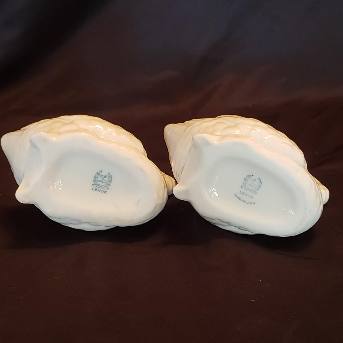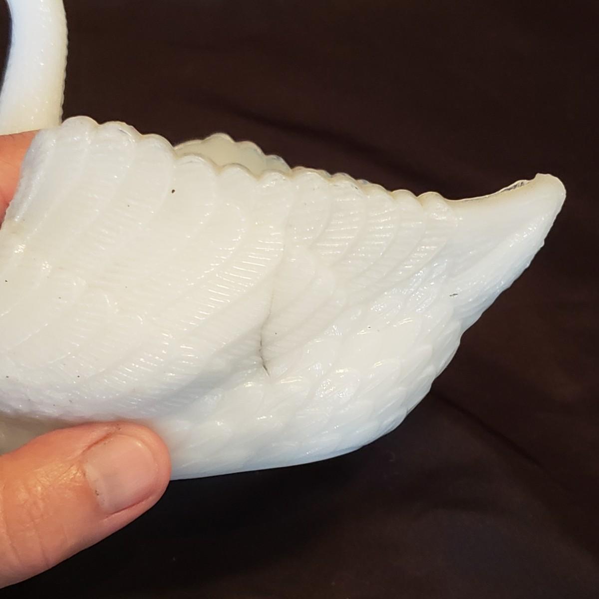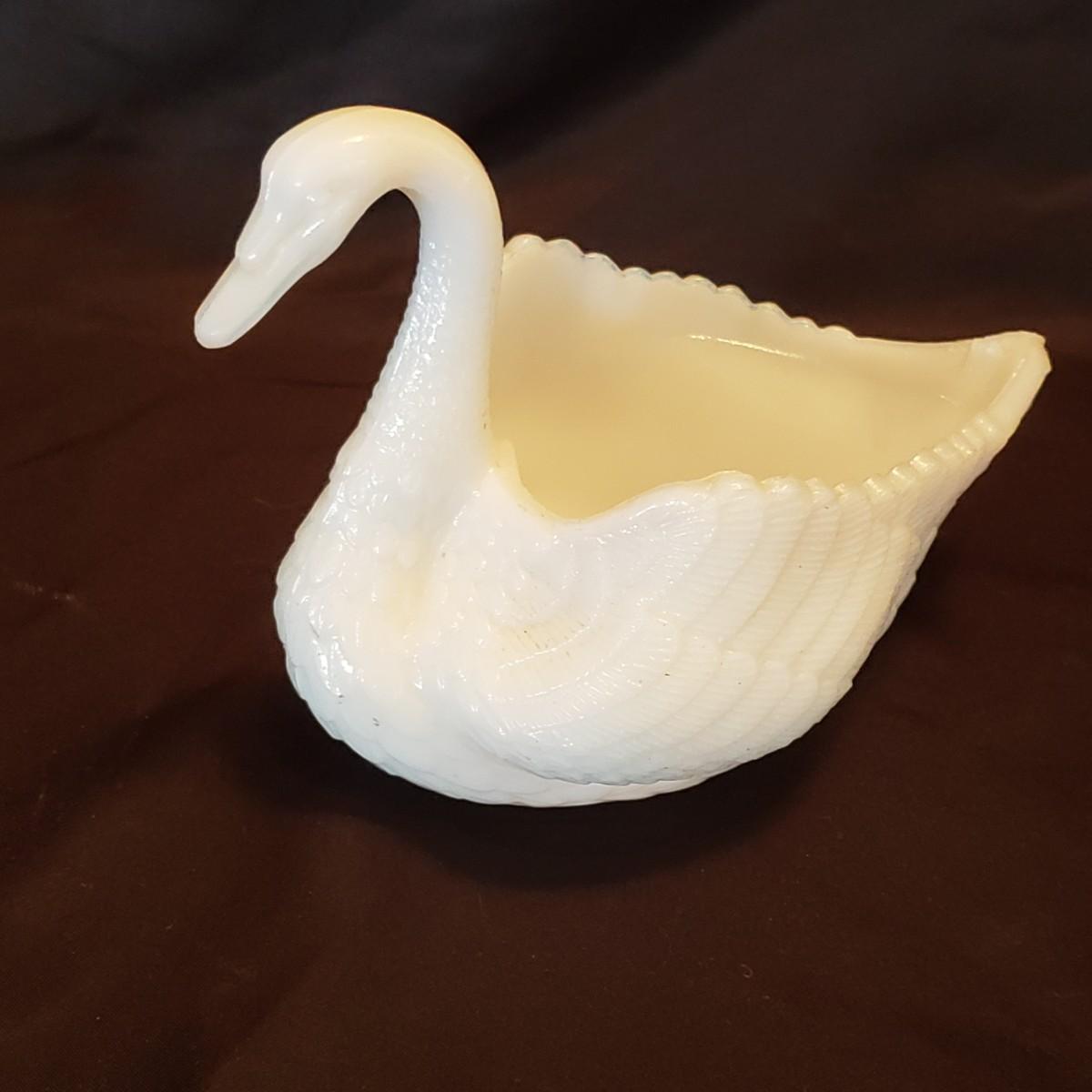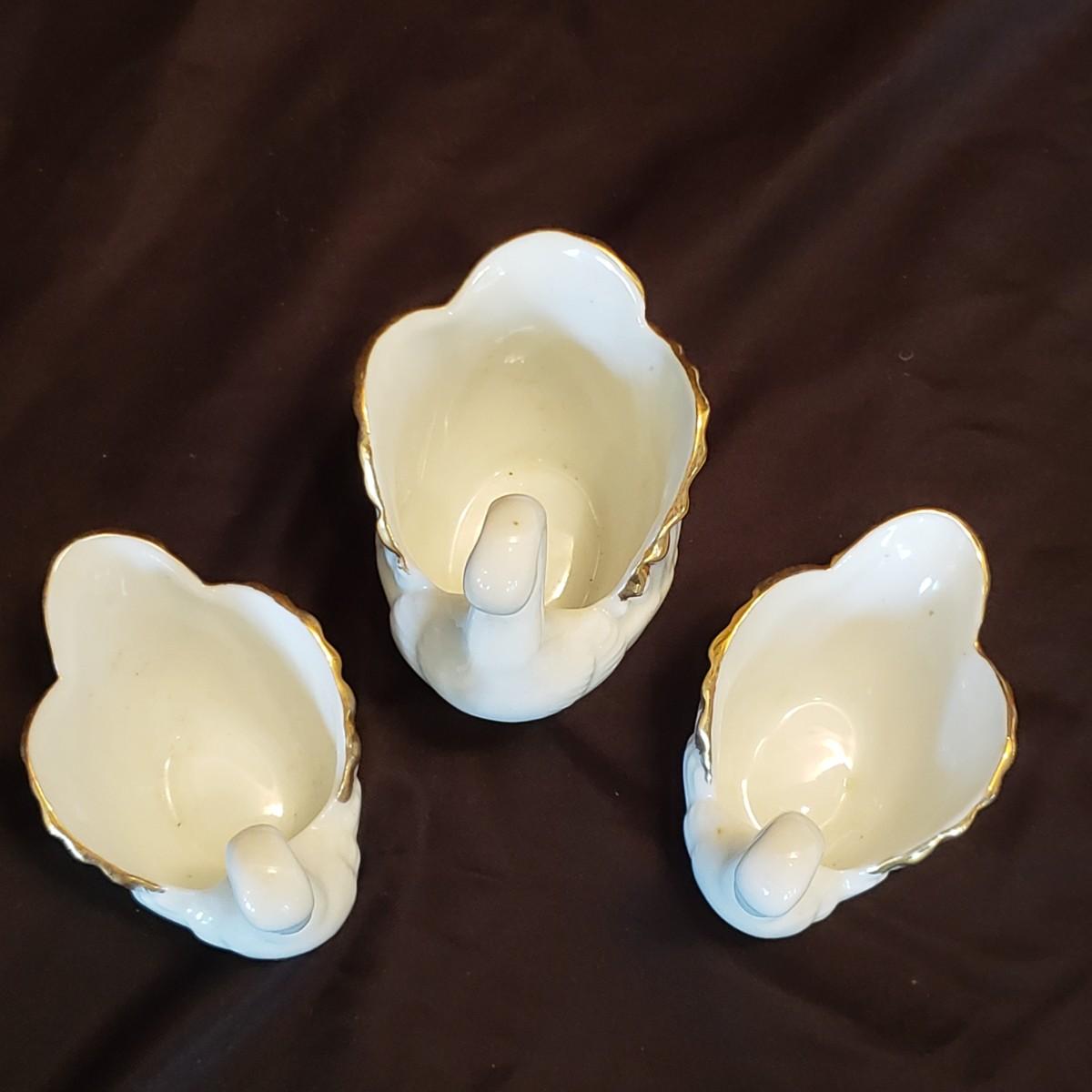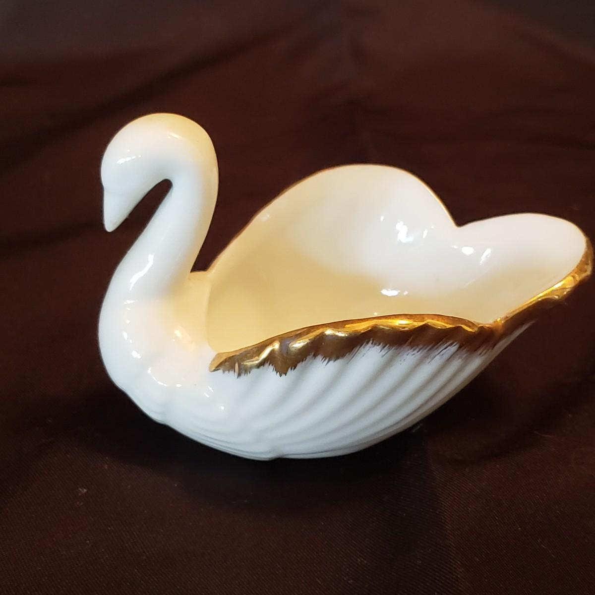 This lot features five porcelain swans and one glass swan.. The two Lennox swans measure 3" x 3" x 2" H and the larger one measures 3" x 2" x 4" H. The Meinsenthal glass swan measures 6" x 4" x 6" H. This piece has a crack along one side, see pictures for details. The two matching Lennox swans measure approximately 4" x 3" x 3" H.