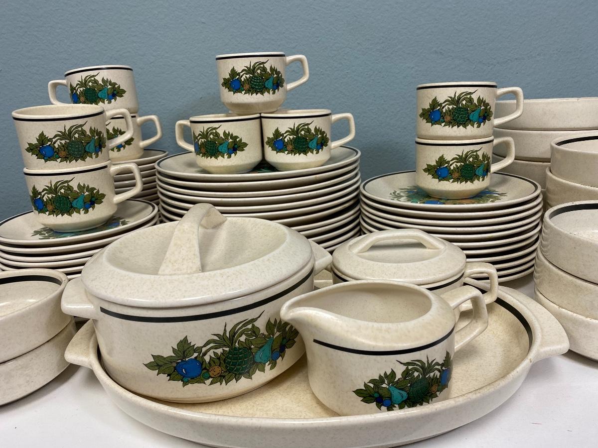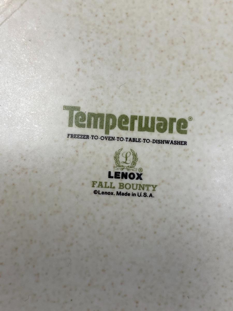 Vintage Lenox Temperware dish set. Fall Bounty pattern. Temperware is similar to stoneware. Includes 10 cups, 9 soup bowls, 5 fruit bowls, a cream and sugar set, small casserole, oval platter, 14 dinner plates, 11 salad plates, 12 bread plates, and 16 saucers. There are signs of use, some pieces have more wear then others, but no chipped pieces.