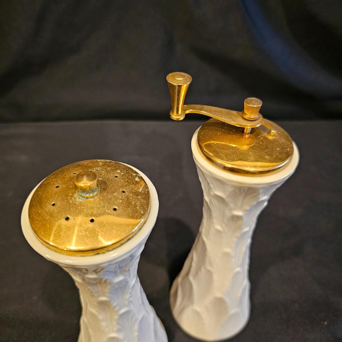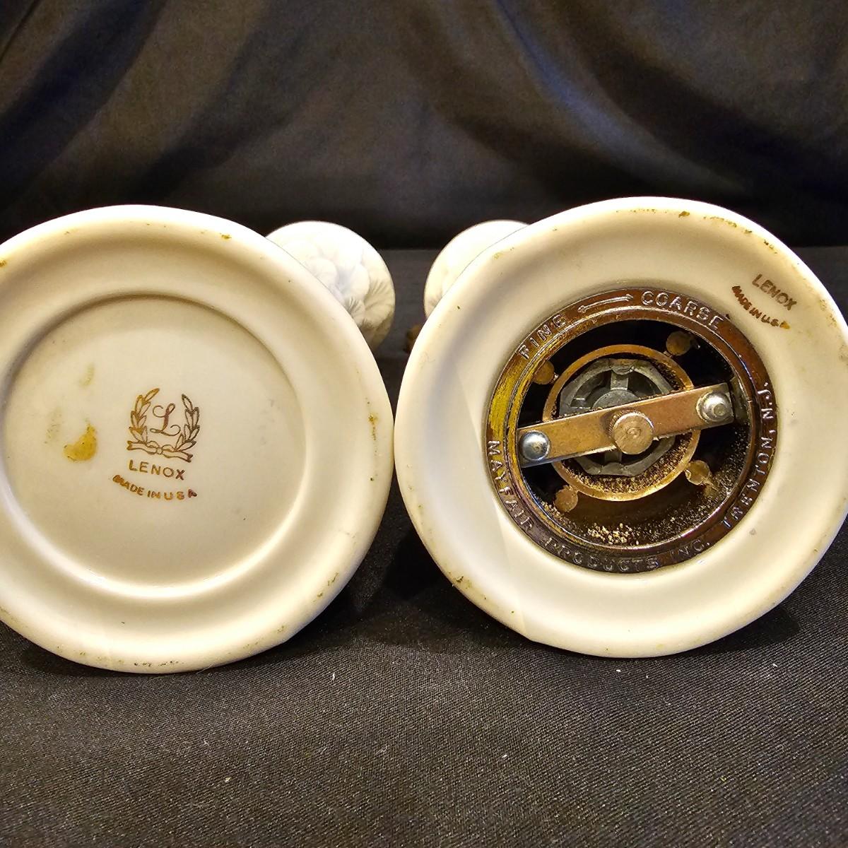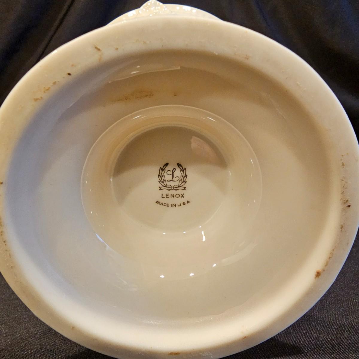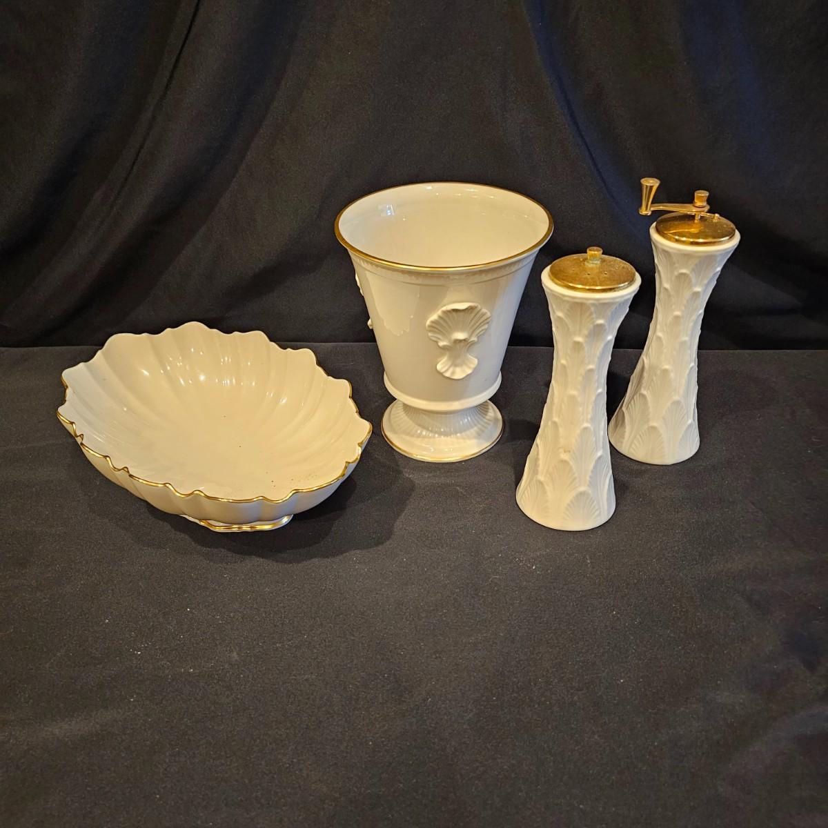 Four pieces of Lenox china with gold rimmed edges. One oval bowl, measures 7" x 11" x 3"H. Vase with medallions on sides is 6"D x 7"H. Salt shaker & pepper mill are 2.75"D x 8"H. See photos for details. Shipping available.