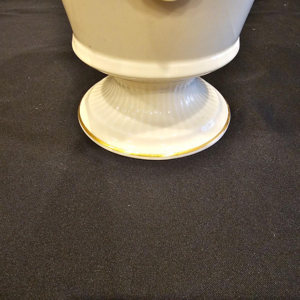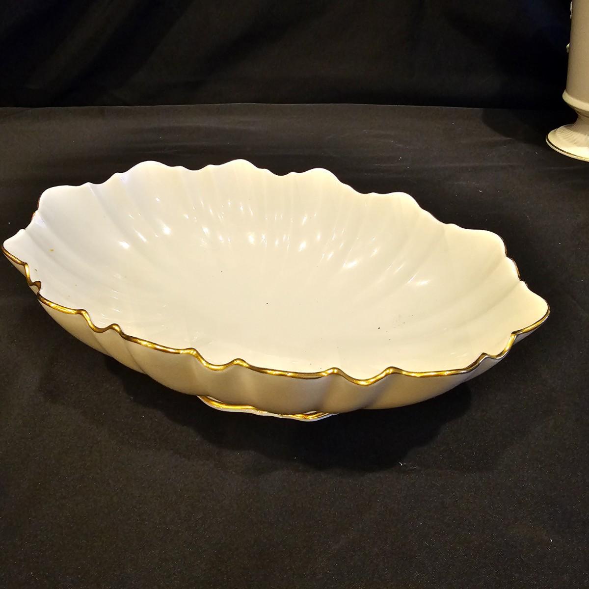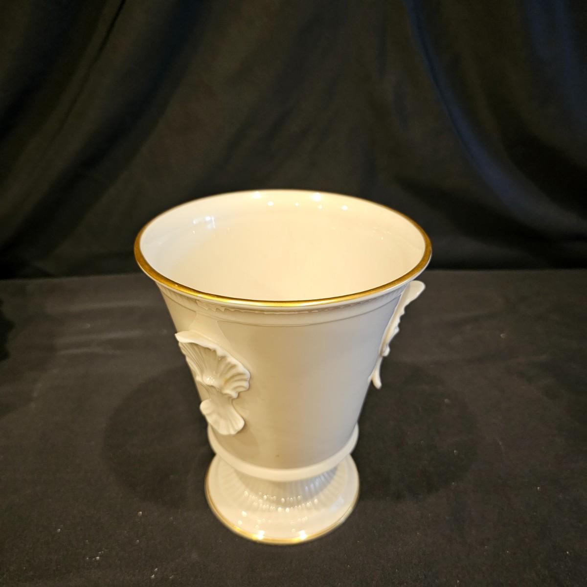Four pieces of Lenox china with gold rimmed edges. One oval bowl, measures 7" x 11" x 3"H. Vase with medallions on sides is 6"D x 7"H. Salt shaker & pepper mill are 2.75"D x 8"H. See photos for details. Shipping available.