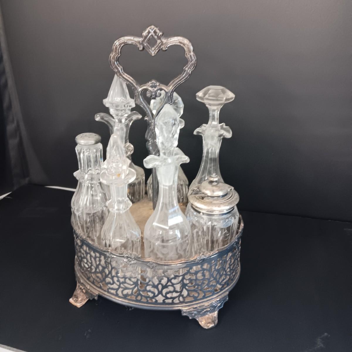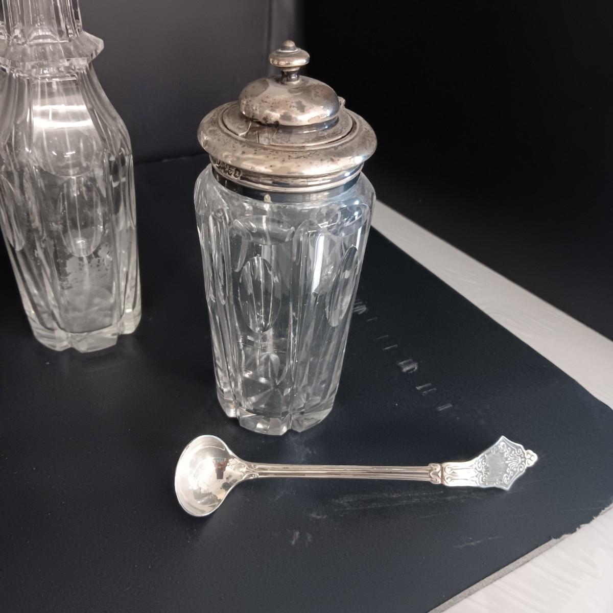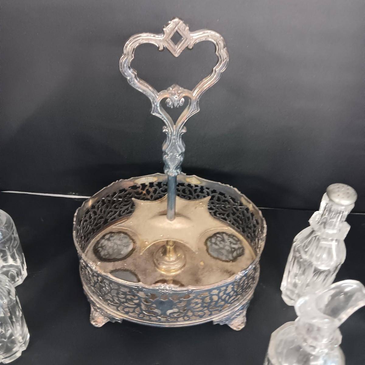 THE CRUET SET IS SILVER PLATED EXCEPT FOR THE LID AND I BELIEVE SPOON ON 1 PIECE. THERE ARE MANY CHIPS