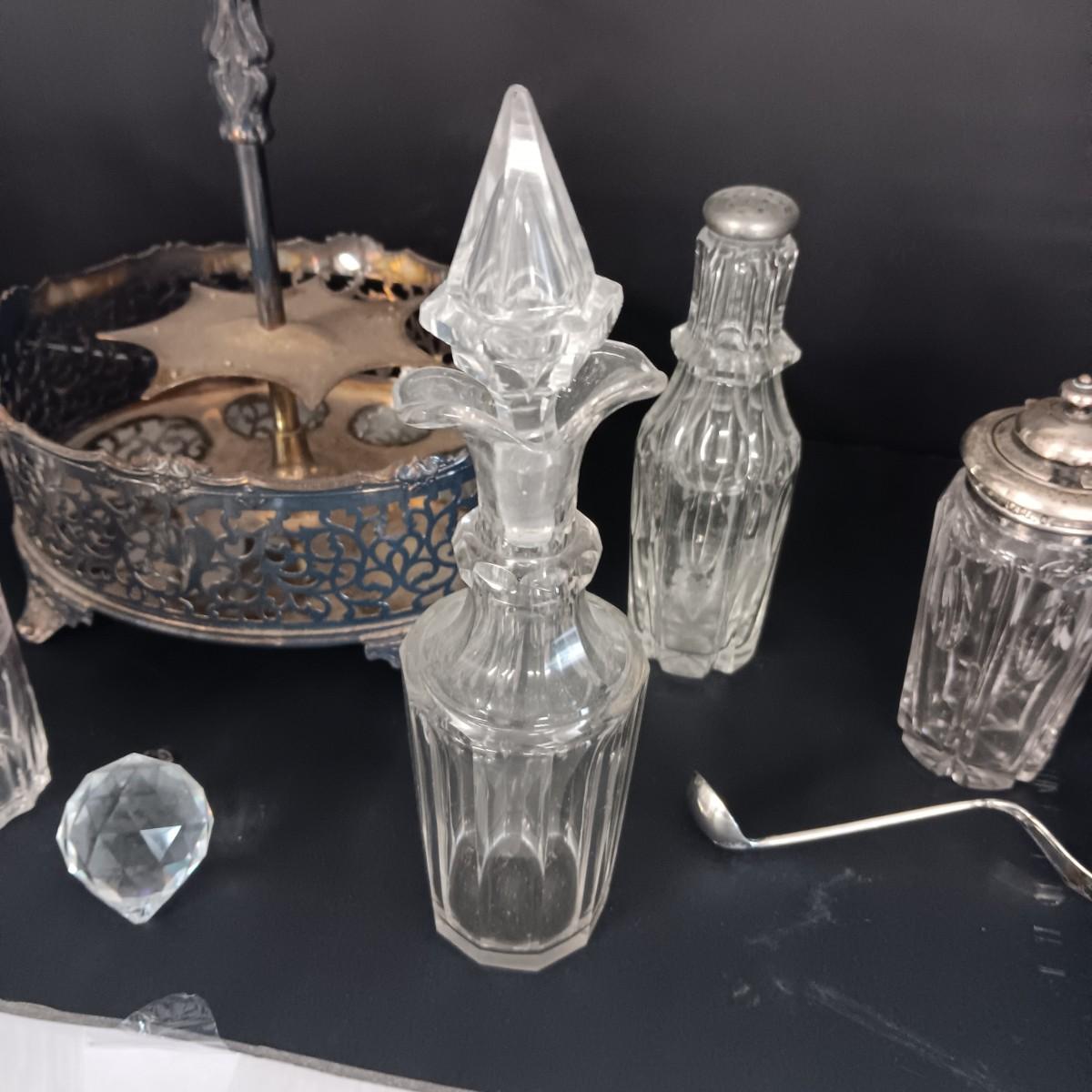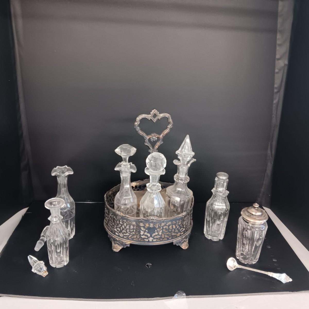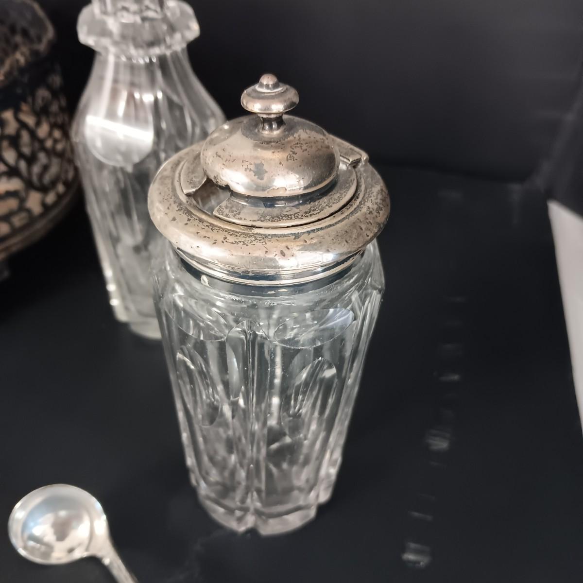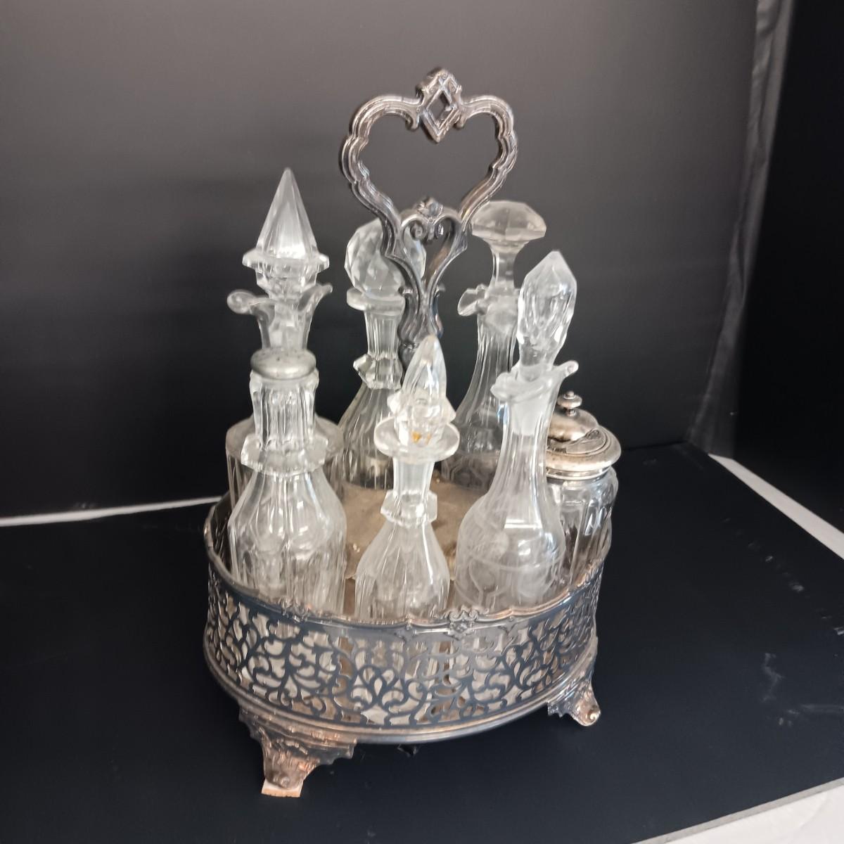 THE CRUET SET IS SILVER PLATED EXCEPT FOR THE LID AND I BELIEVE SPOON ON 1 PIECE. THERE ARE MANY CHIPS