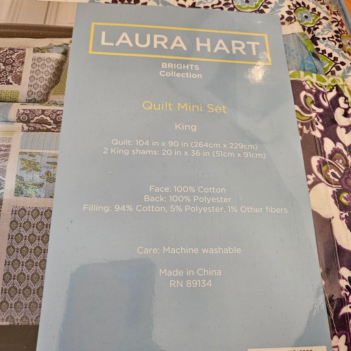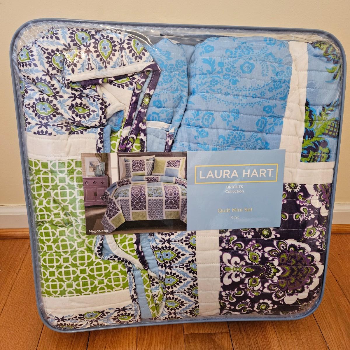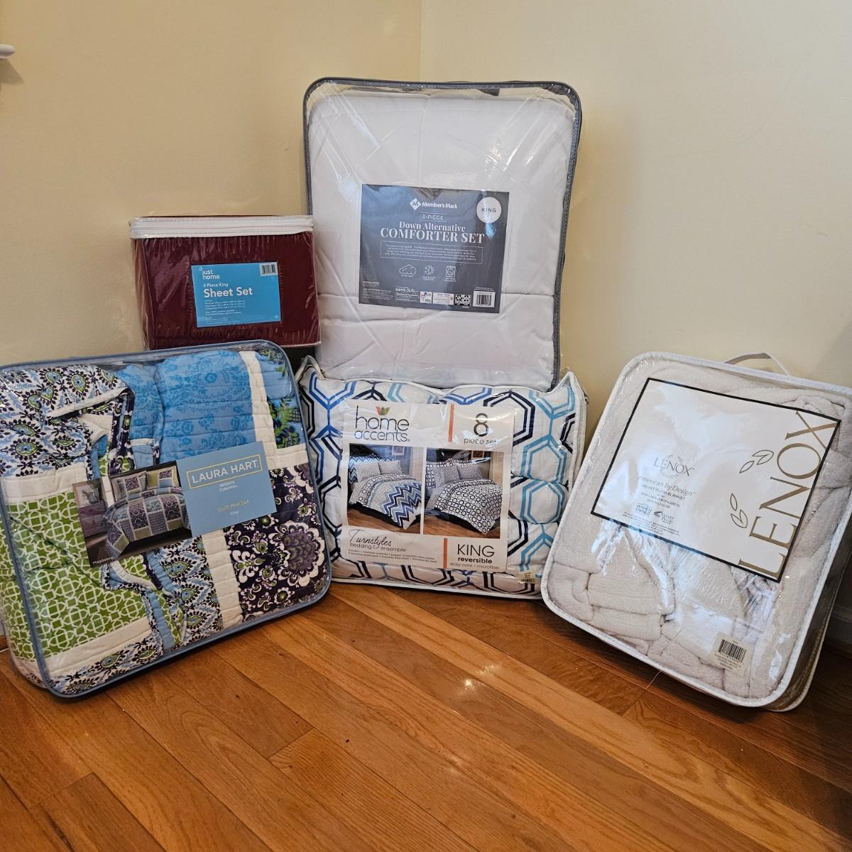 An assortment of king size bedding that includes a Home Accents eight piece comforter set, a Lenox plush blanket, a Members Mark three piece comforter ser, a Laura Hart three piece quilt set and a Just Home microfiber sheet set. Shipping available