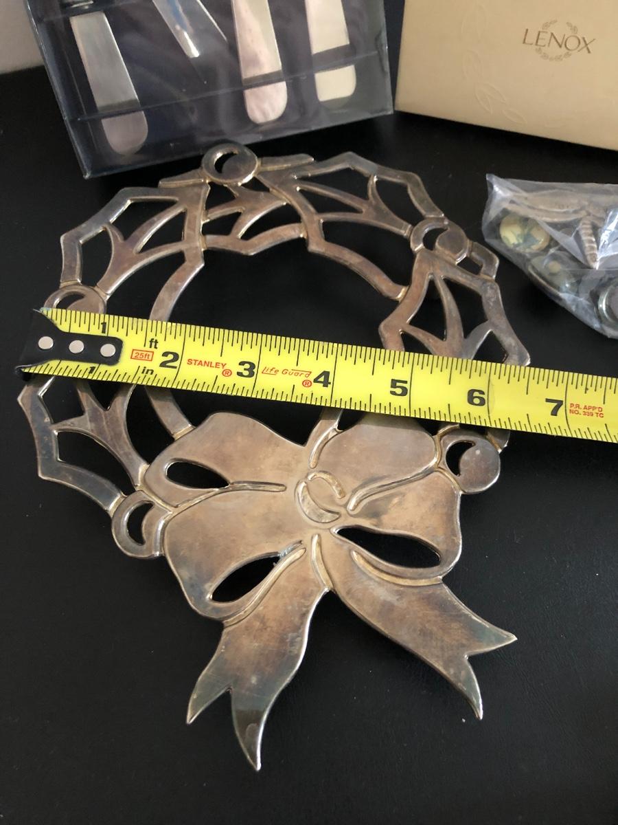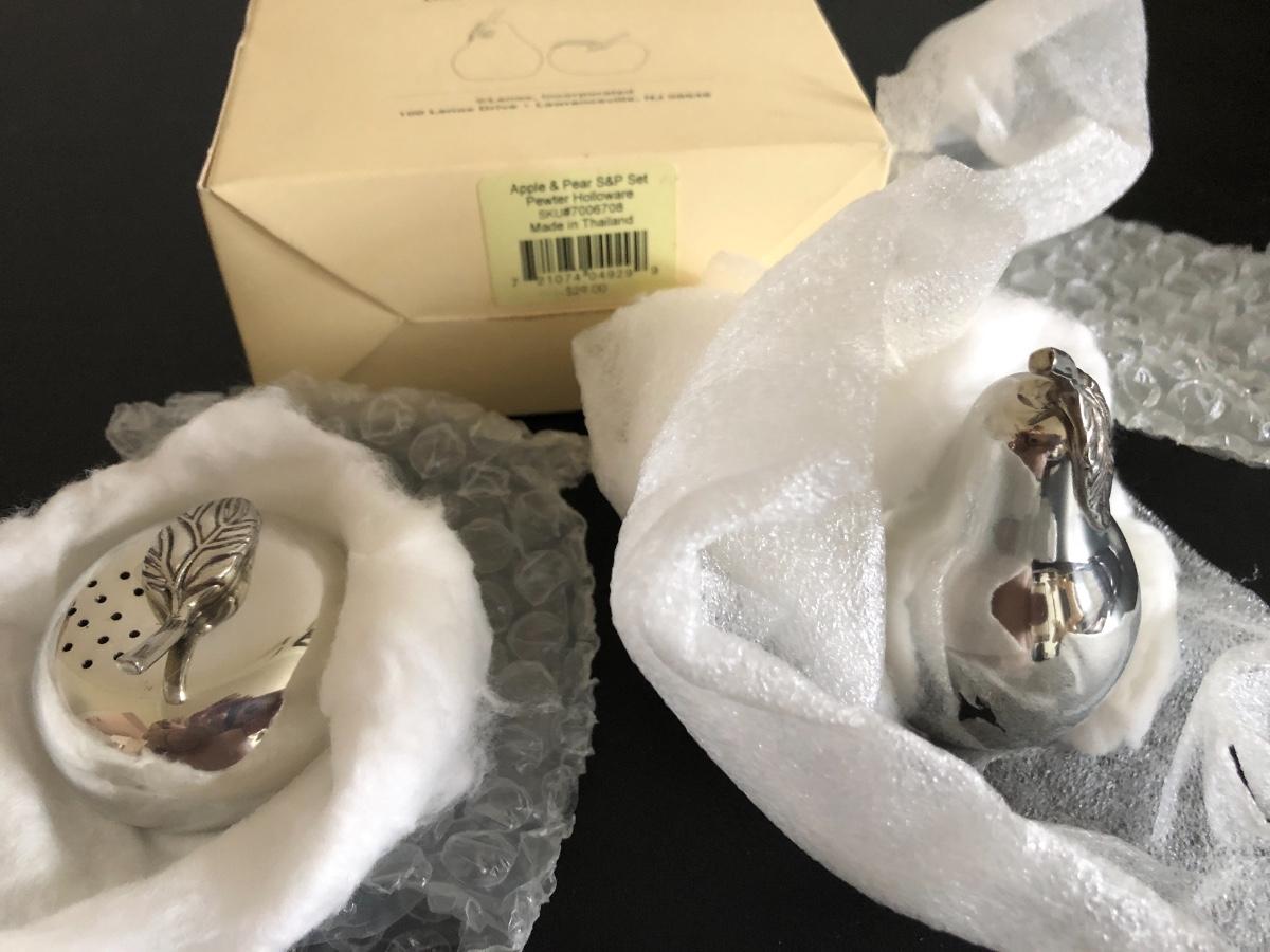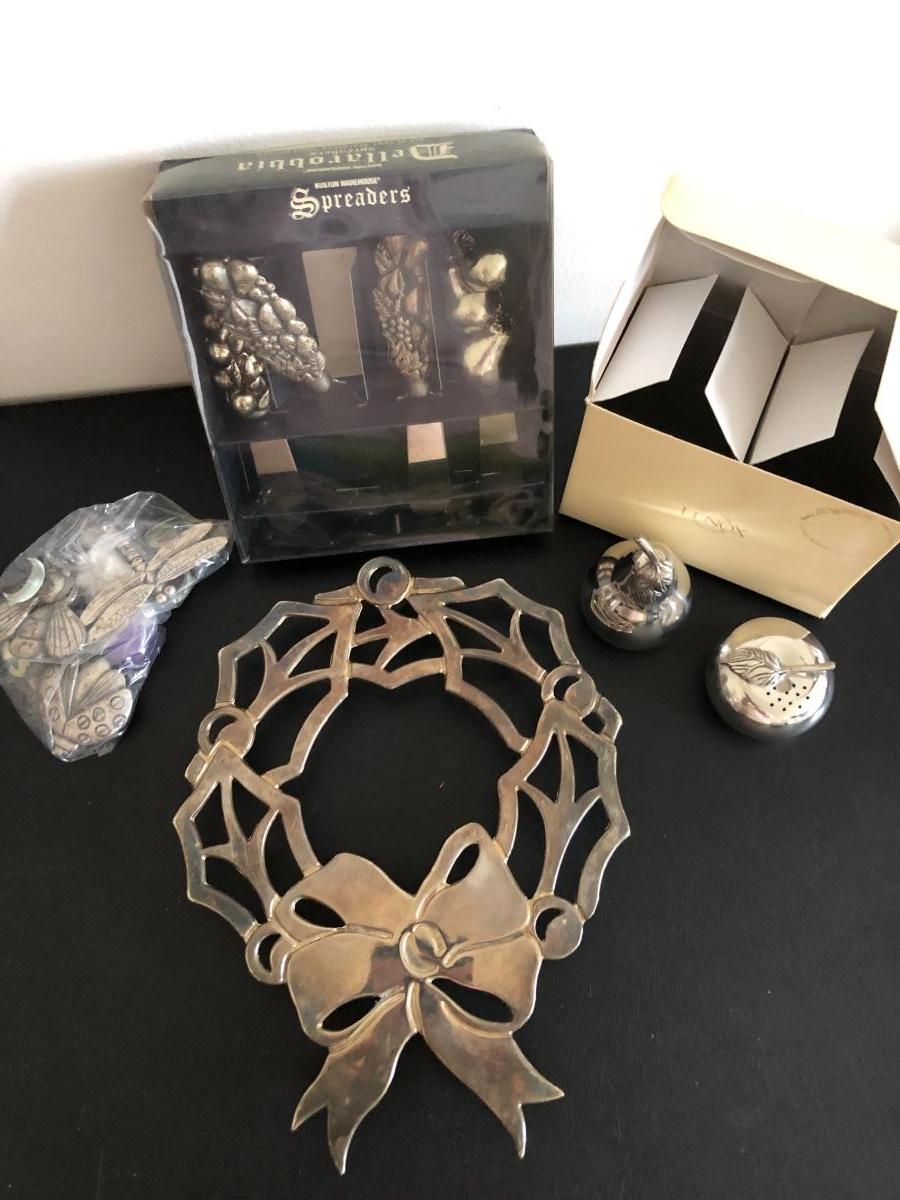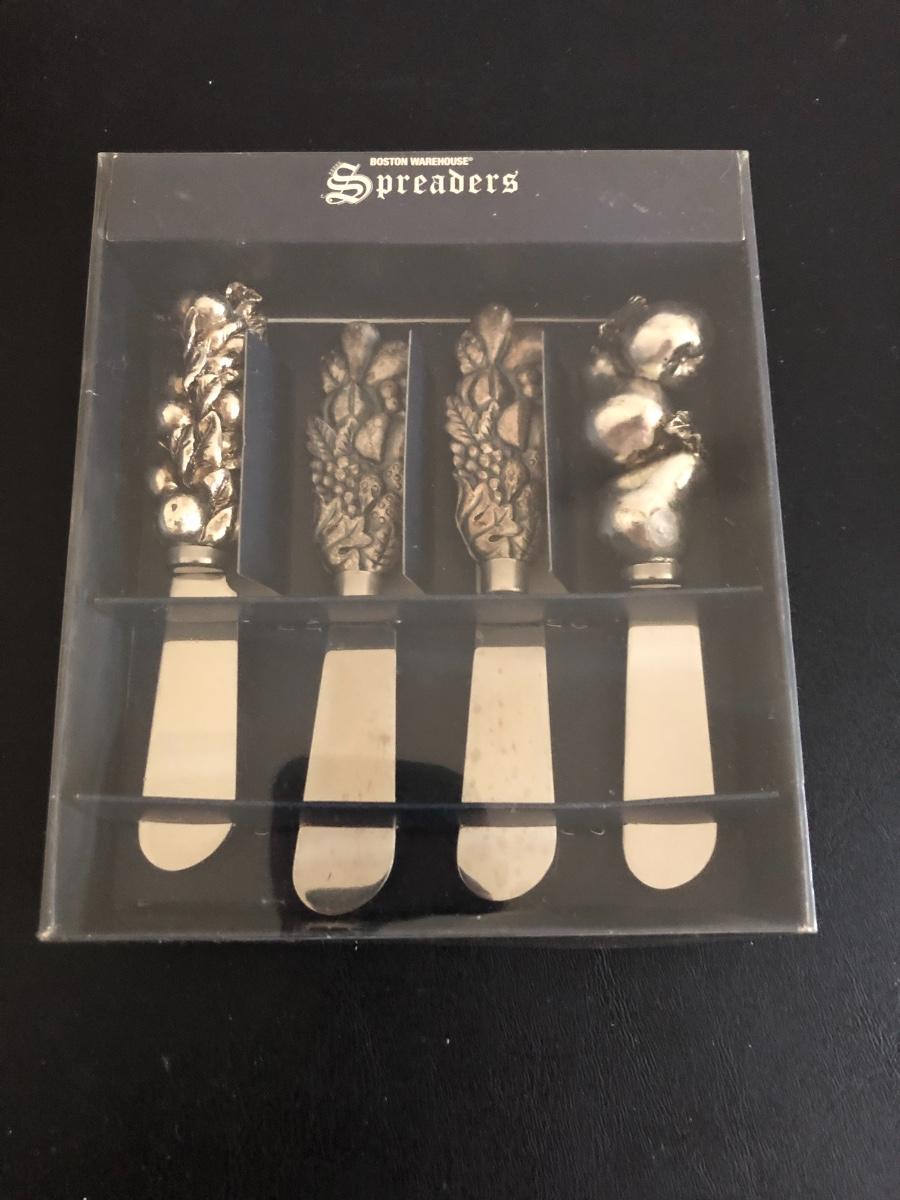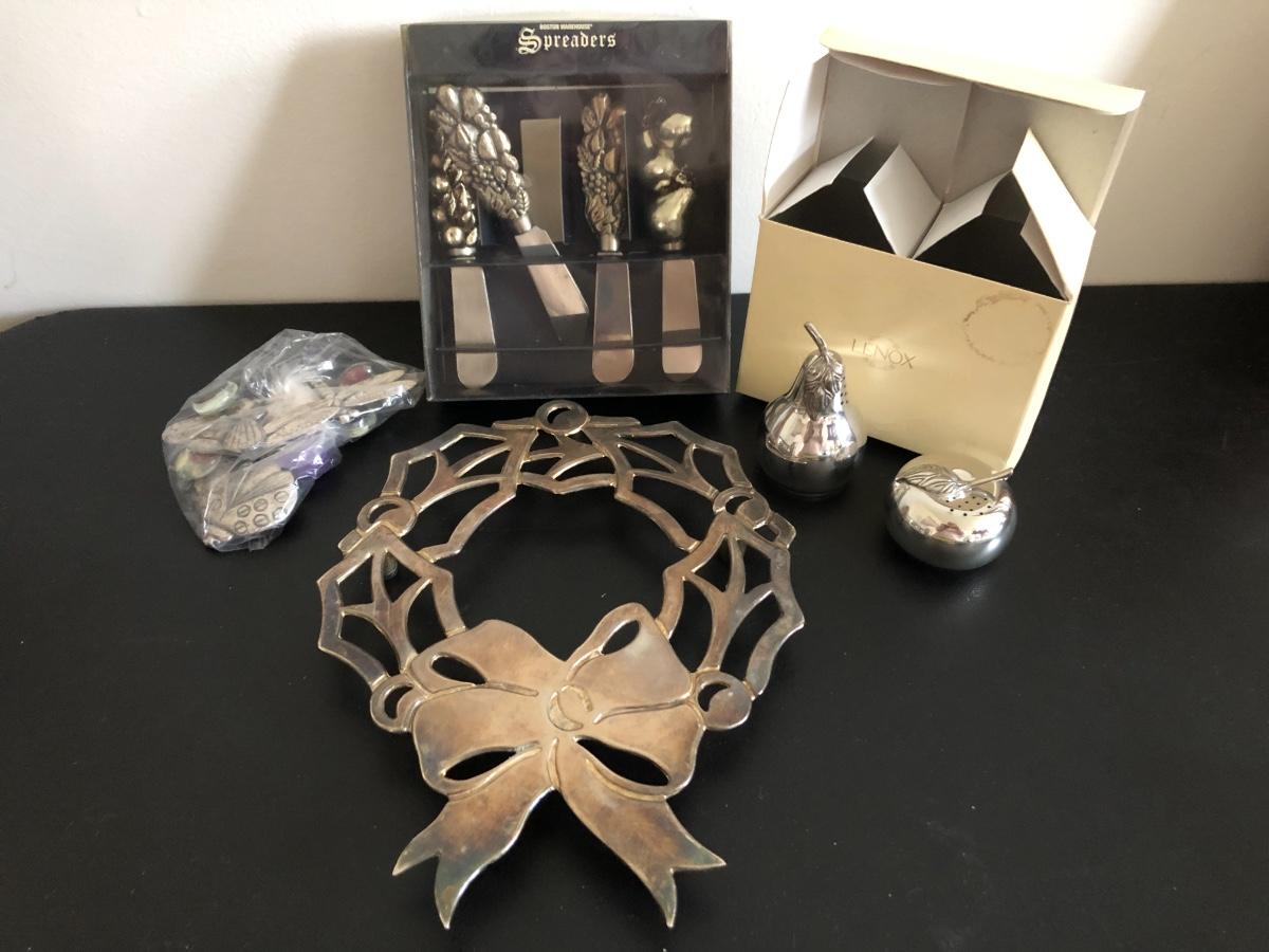 Boston Warehouse Spreaders (set of four stainless steel knives; model no. 12667), New LENOX Apple & Pear S&P Set (Pewter Holloware SKU# 7006708; made in Thailand; reg $29.00), Wreath Hot Plate, bag of misc. magnets.