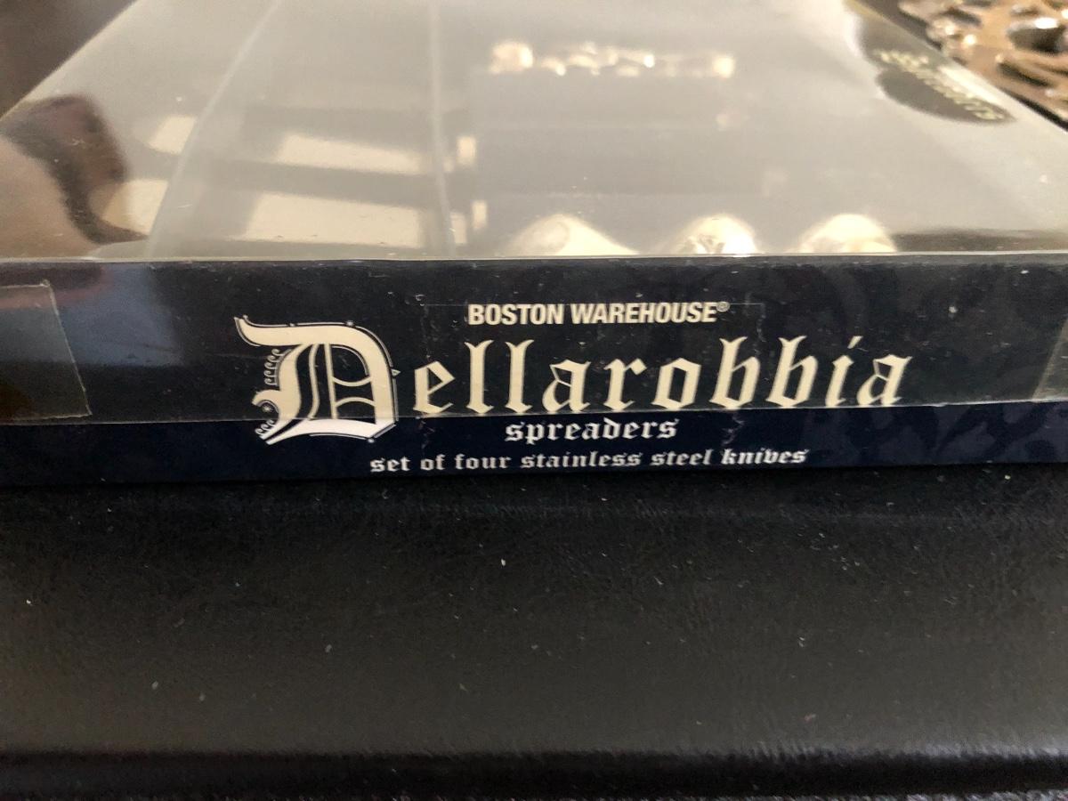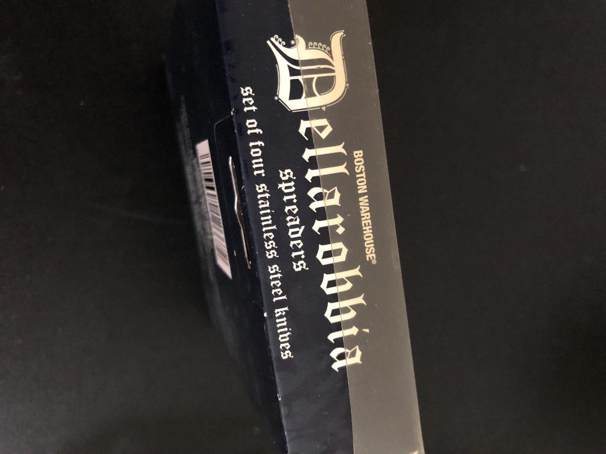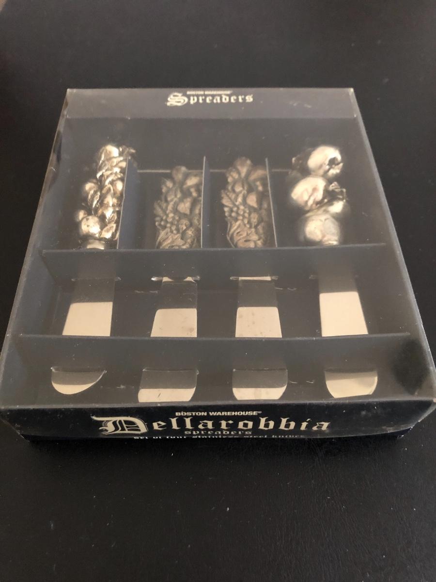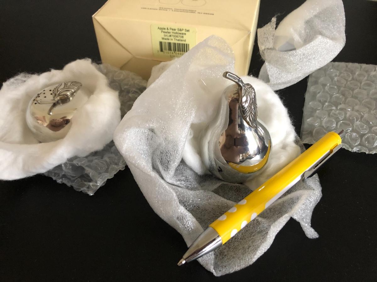 Boston Warehouse Spreaders (set of four stainless steel knives; model no. 12667), New LENOX Apple & Pear S&P Set (Pewter Holloware SKU# 7006708; made in Thailand; reg $29.00), Wreath Hot Plate, bag of misc. magnets.