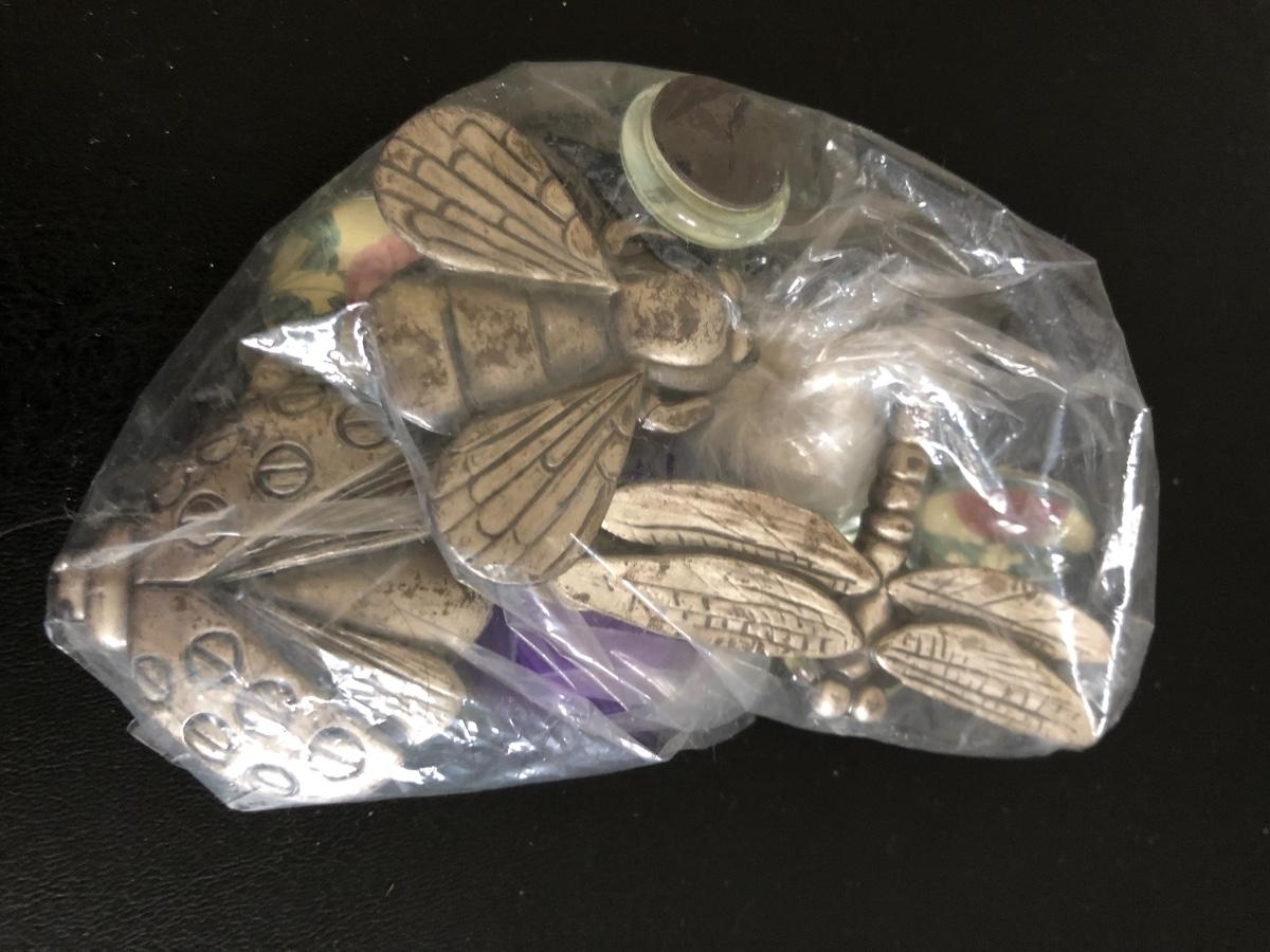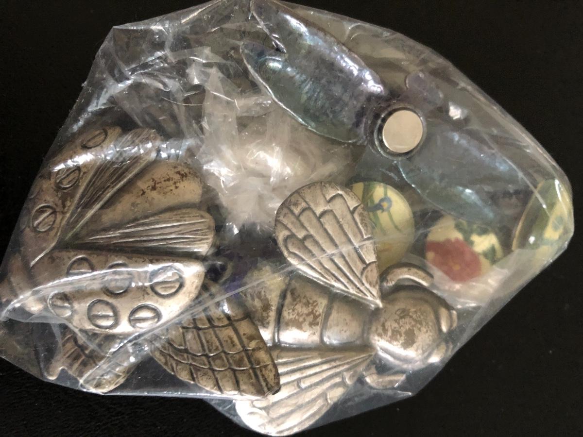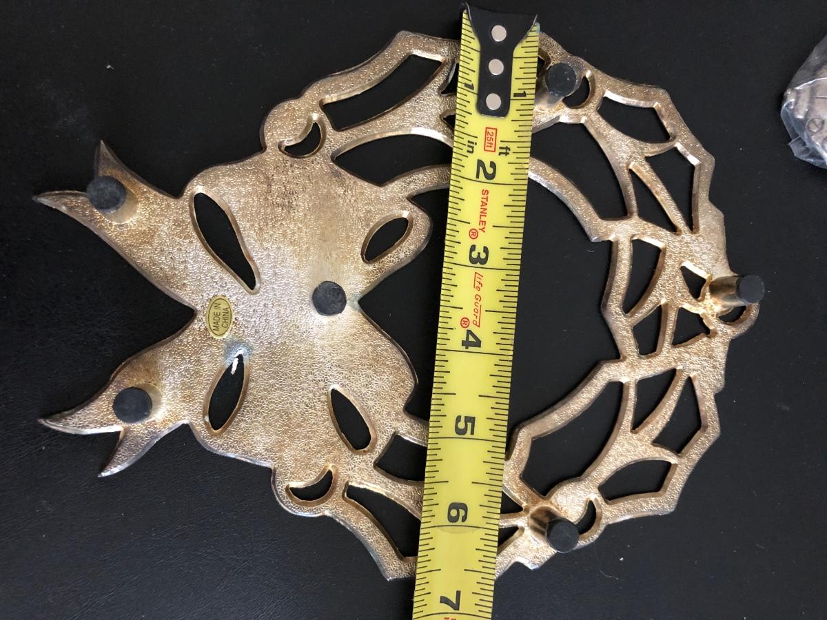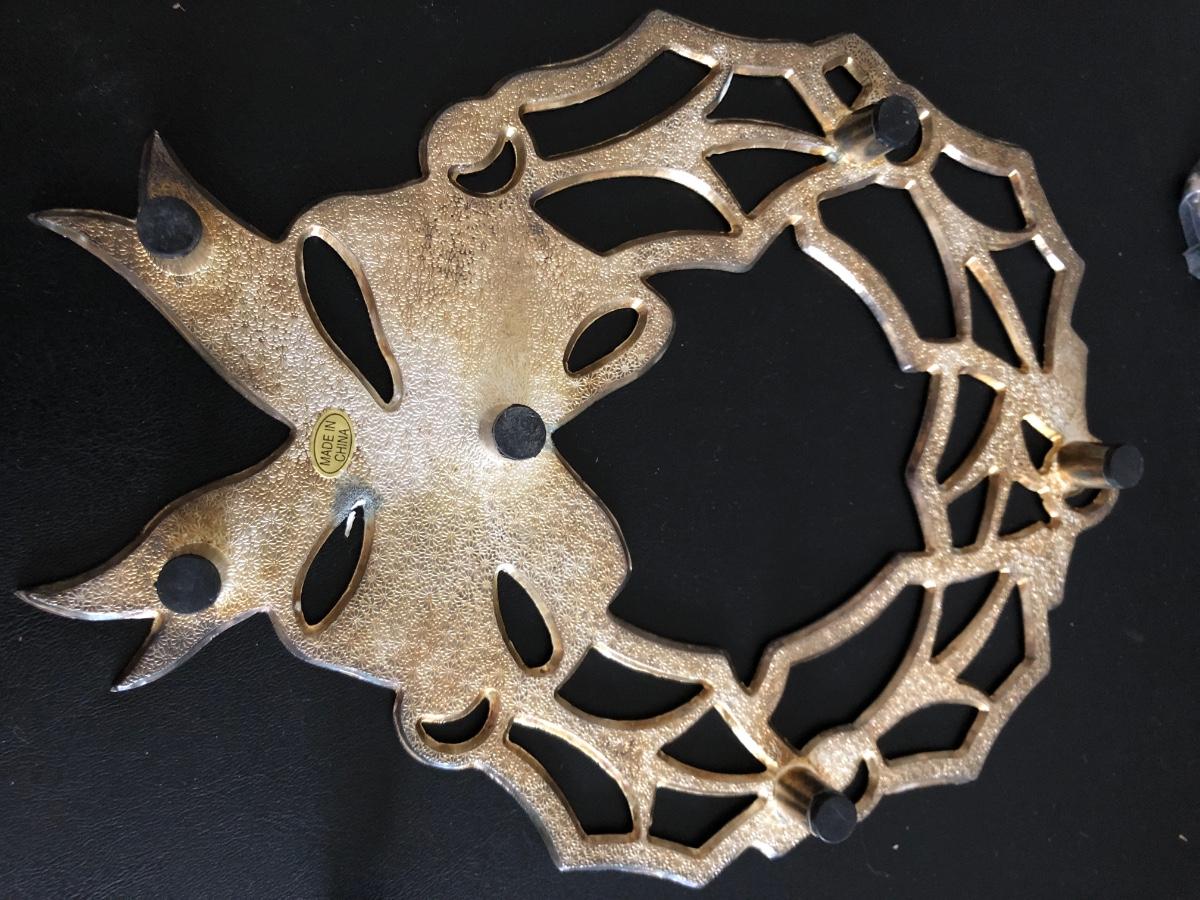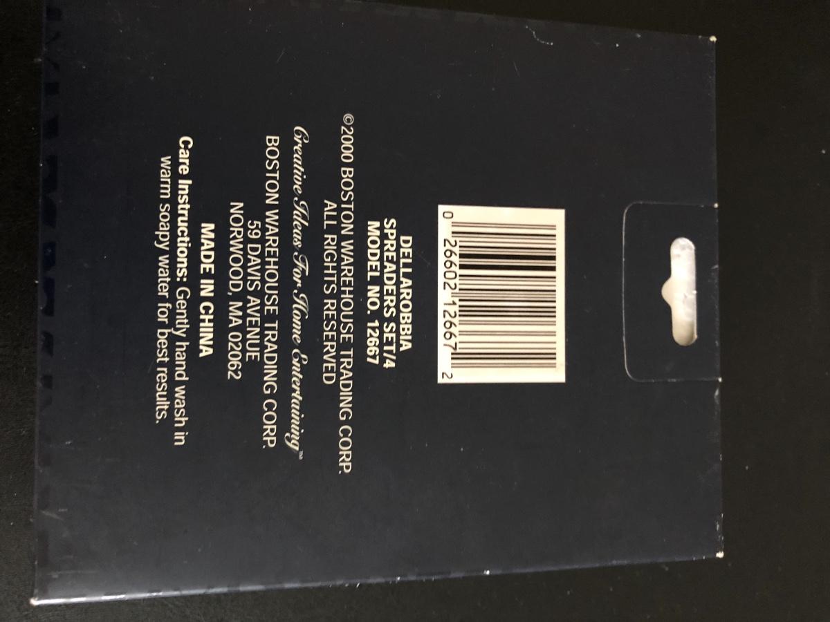 Boston Warehouse Spreaders (set of four stainless steel knives; model no. 12667), New LENOX Apple & Pear S&P Set (Pewter Holloware SKU# 7006708; made in Thailand; reg $29.00), Wreath Hot Plate, bag of misc. magnets.